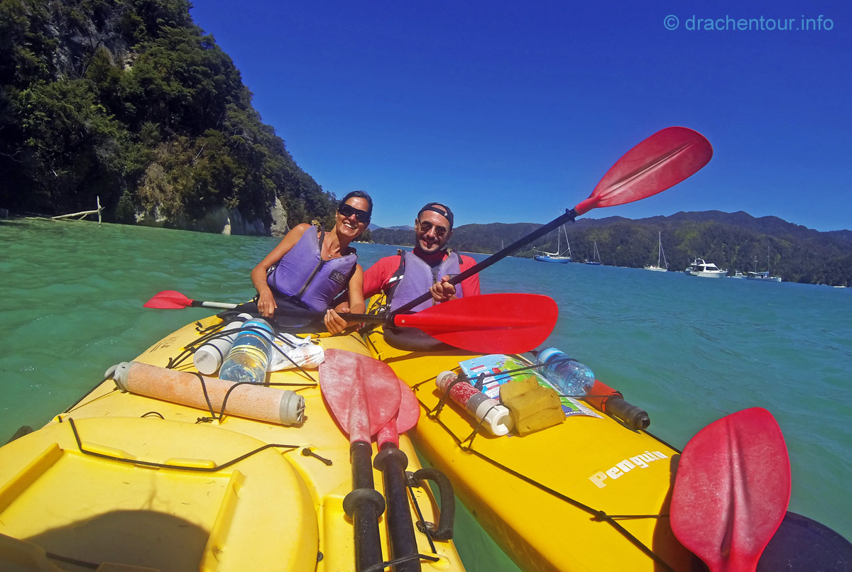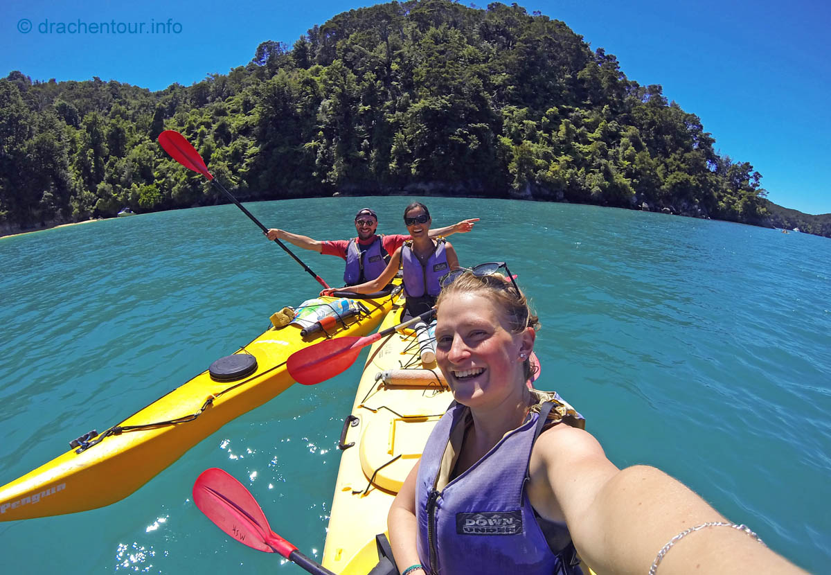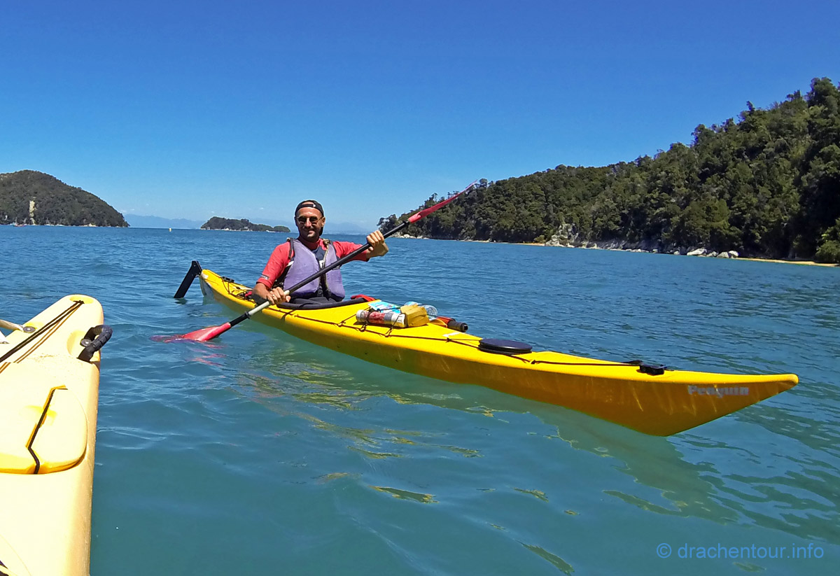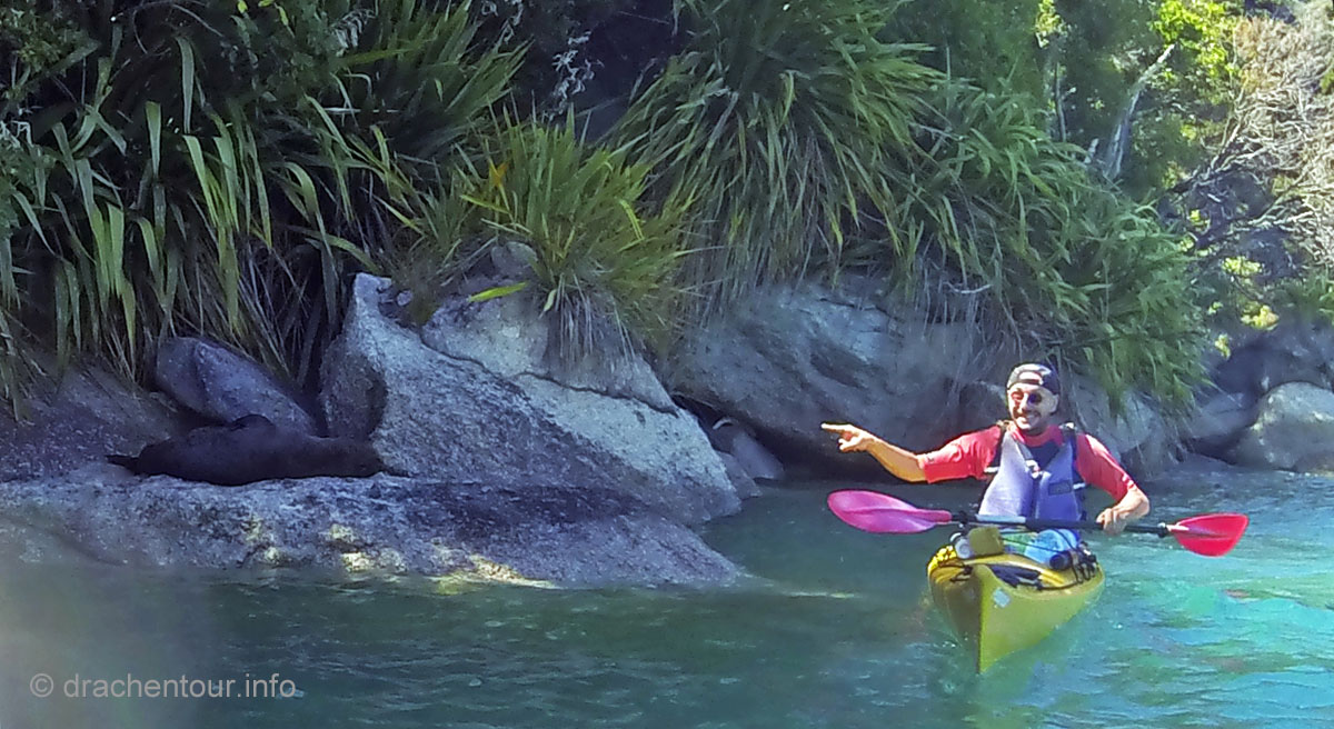 Die zweite Möglichkeit den Abel Tasman zu erkunden ist per Kayak, ja und genau das war auch unsere Mission für den heutigen Tag. Dieser begann recht früh, da wir bereits um 9:00 Uhr bei der Travel-Agency sein mussten. Da wir uns entschieden haben eine Tour ohne Guide zu machen, bekamen wir deshalb eine ausführliche Einweisung, wie man sich als Kayaker zu verhalten hat. Am schwersten viel uns, zumindest Seli und mir, das Festmachen des Spritzdecke, das " Ding " wollte und wollte nur ganz schwer oder überhaupt nicht einrasten, aber mit vereinten Kräften schafften wir es dann doch irgendwann. Die Spritzdecken oder Röckchen waren sowieso eine sehr lustige Sache - siehe Bild. Nun ging es daran, die Kayaks aufzuladen und ab ins Wasser um noch einen Crashkurs in Sachen Paddeln und drehen und Co. zu erhalten. Als wir uns sicher im Umgang mit dem Kayak fühlten, machten wir uns auf den Weg: Marek in einem Einer und Seli und ich saßen quasi im selben Boot. Unser Ziel war die Insel Adele, denn dort soll es angeblich noch Robben und vielleicht sogar Pinguine geben. Also nichts wie los, der Weg dorthin war allerdings anstrengender und länger als es den Anschein machte, so waren wir froh nach eineinhalb Stunden die Insel endlich erreicht zu haben. Dort schipperten wir dann gemütlich an ihrem Ufer entlang und betrachteten mit wachen Augen die Natur. Und plötzlich entdeckten wir eine Robbe, die entspannt auf einem Felsen im Schatten döste, was für ein atemberaubender Anblick ! Wir kamen ihr ziemlich nahe, aber sie war völlig unbeeindruckt von uns, sie hob nur kurz den Kopf, schaute uns mit müden und verwunderten Knopfaugen an, legte ihren Kopf ab und schlief wieder weiter. Wir wollten sie natürlich auch nicht in ihrer Ruhe stören und waren sehr vorsichtig und leise, denn wir waren sehr froh überhaupt eine zu sehen - wie friedvoll die Natur doch ist !