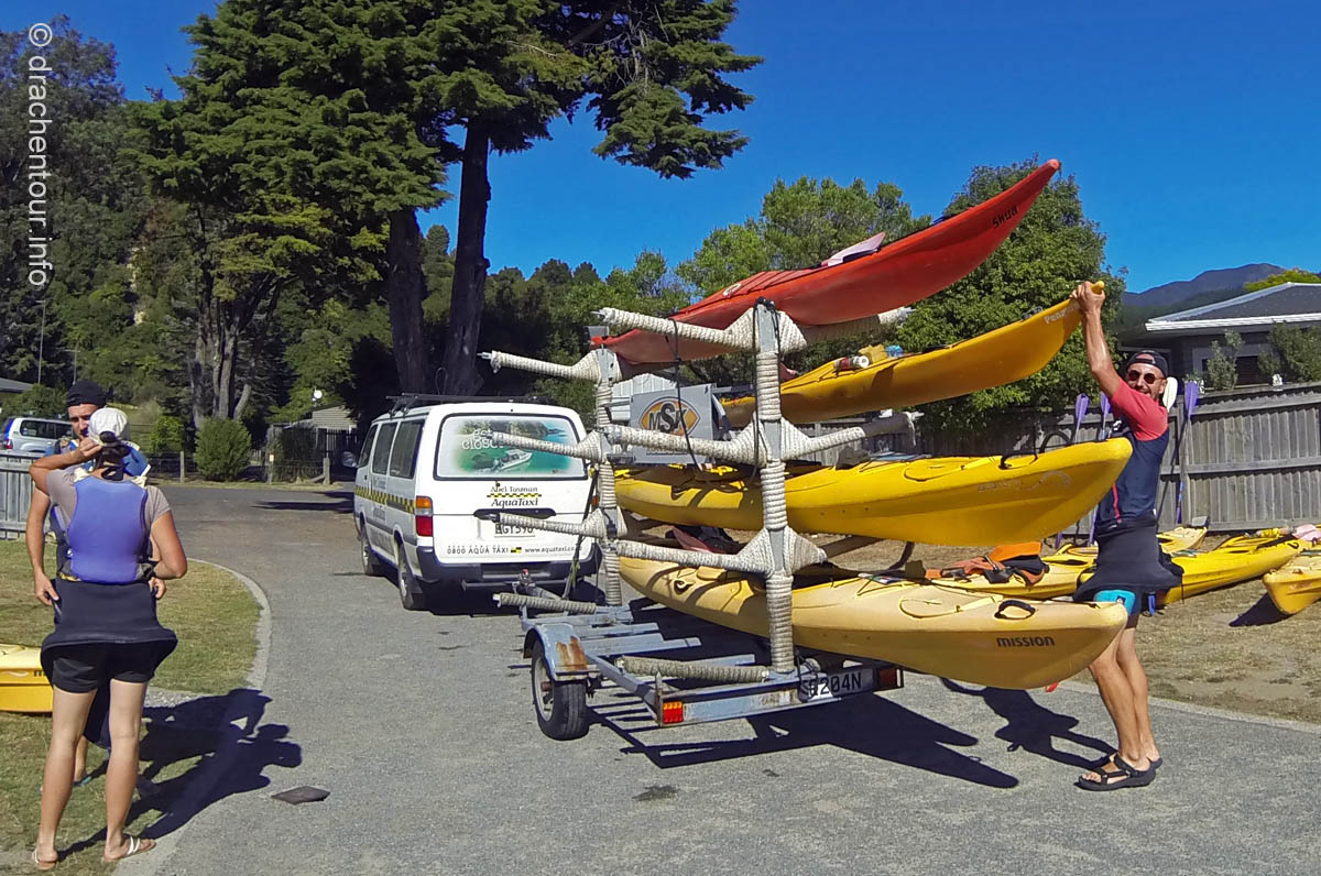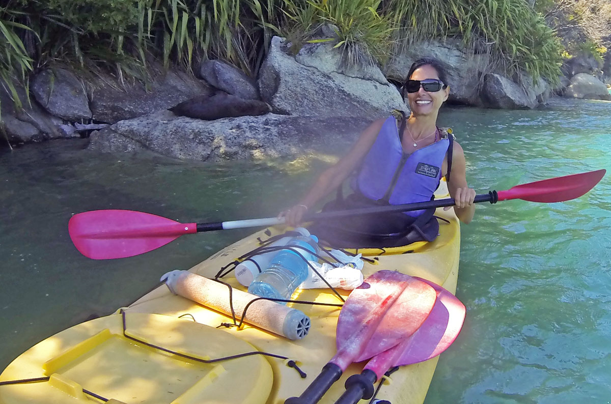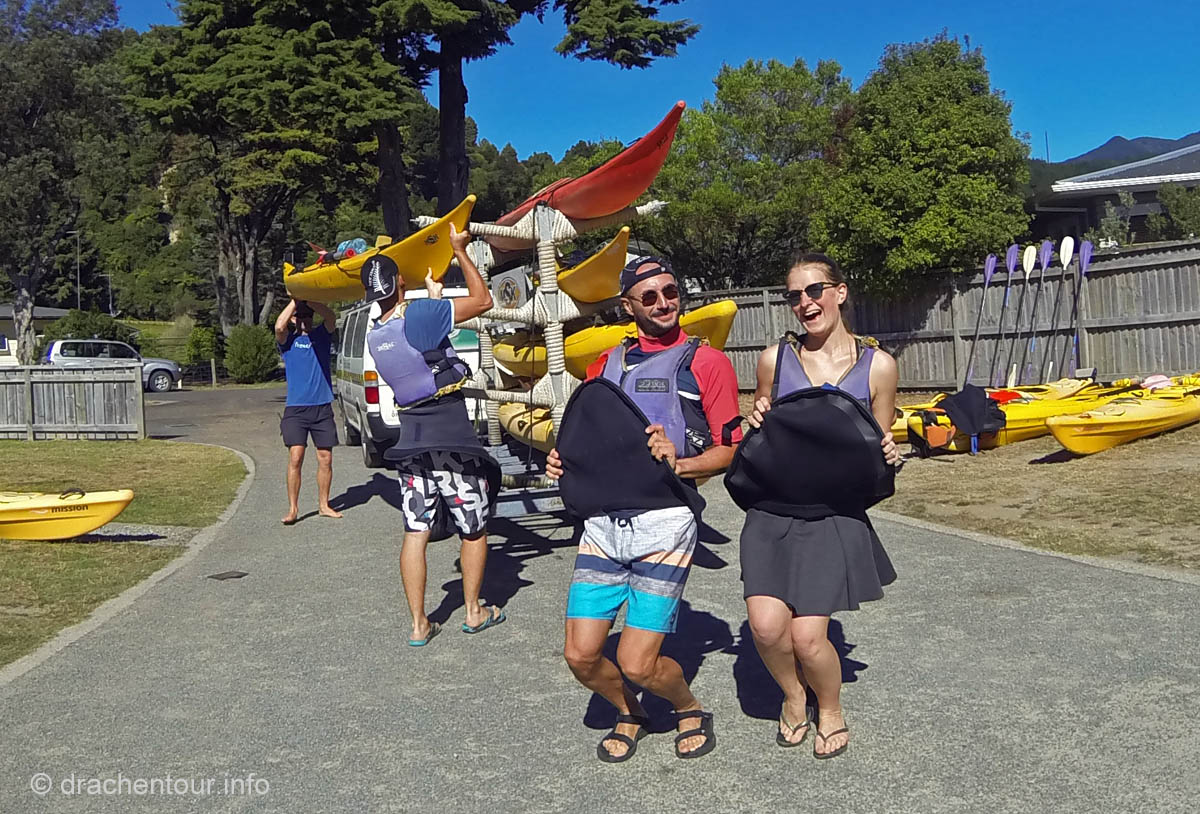 Die zweite Möglichkeit den Abel Tasman zu erkunden ist per Kayak, ja und genau das war auch unsere Mission für den heutigen Tag. Dieser begann recht früh, da wir bereits um 9:00 Uhr bei der Travel-Agency sein mussten. Da wir uns entschieden haben eine Tour ohne Guide zu machen, bekamen wir deshalb eine ausführliche Einweisung, wie man sich als Kayaker zu verhalten hat. Am schwersten viel uns, zumindest Seli und mir, das Festmachen des Spritzdecke, das " Ding " wollte und wollte nur ganz schwer oder überhaupt nicht einrasten, aber mit vereinten Kräften schafften wir es dann doch irgendwann. Die Spritzdecken oder Röckchen waren sowieso eine sehr lustige Sache - siehe Bild. Nun ging es daran, die Kayaks aufzuladen und ab ins Wasser um noch einen Crashkurs in Sachen Paddeln und drehen und Co. zu erhalten. Als wir uns sicher im Umgang mit dem Kayak fühlten, machten wir uns auf den Weg: Marek in einem Einer und Seli und ich saßen quasi im selben Boot. Unser Ziel war die Insel Adele, denn dort soll es angeblich noch Robben und vielleicht sogar Pinguine geben. Also nichts wie los, der Weg dorthin war allerdings anstrengender und länger als es den Anschein machte, so waren wir froh nach eineinhalb Stunden die Insel endlich erreicht zu haben. Dort schipperten wir dann gemütlich an ihrem Ufer entlang und betrachteten mit wachen Augen die Natur. Und plötzlich entdeckten wir eine Robbe, die entspannt auf einem Felsen im Schatten döste, was für ein atemberaubender Anblick ! Wir kamen ihr ziemlich nahe, aber sie war völlig unbeeindruckt von uns, sie hob nur kurz den Kopf, schaute uns mit müden und verwunderten Knopfaugen an, legte ihren Kopf ab und schlief wieder weiter. Wir wollten sie natürlich auch nicht in ihrer Ruhe stören und waren sehr vorsichtig und leise, denn wir waren sehr froh überhaupt eine zu sehen - wie friedvoll die Natur doch ist !