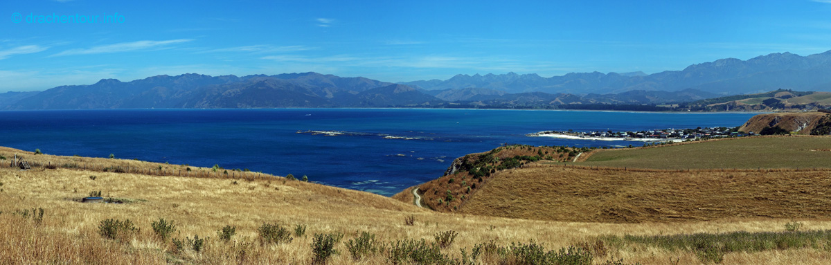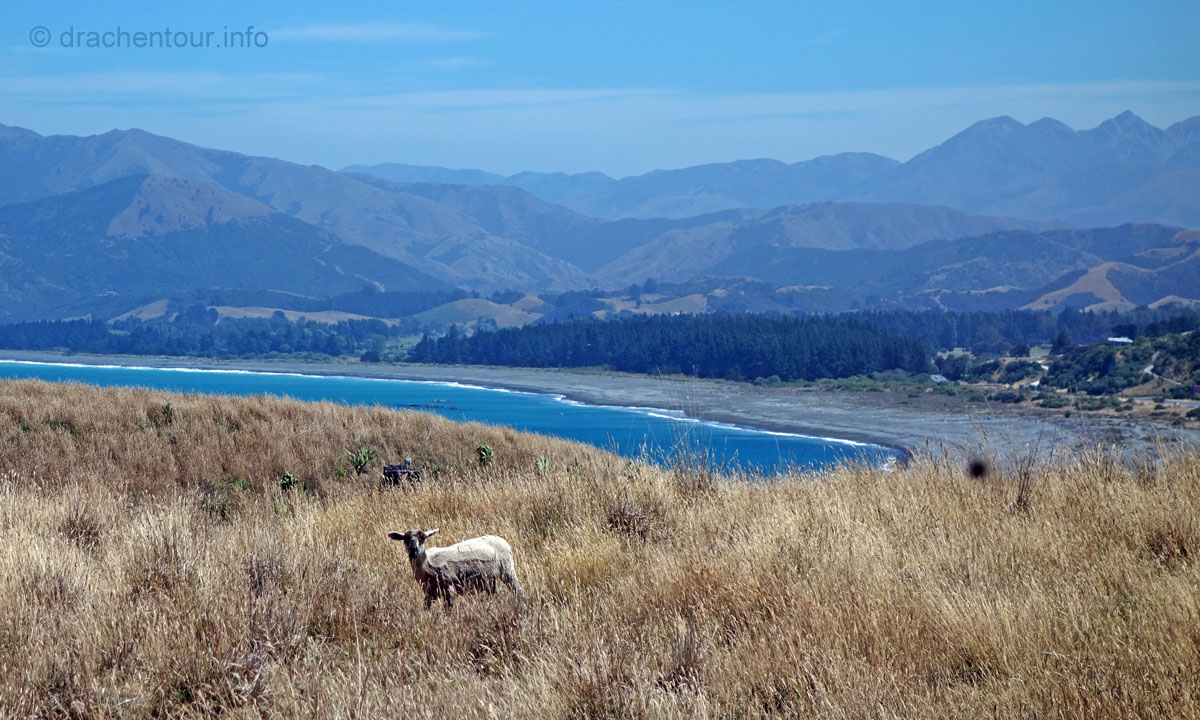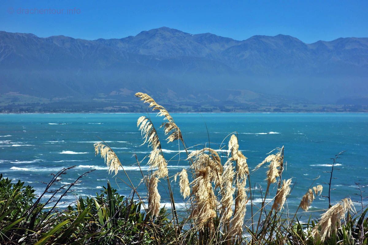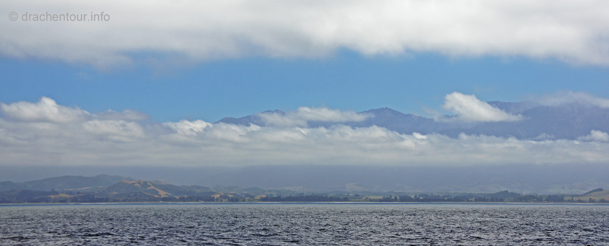 Heute hieß es Abschied nehmen von unserem idyllischen Plätzchen am Rande des Abel Tasman Nationalparks und der schönen Landschaft, doch es ging auf direktem Weg zu einem der absoluten Highlights in Neuseeland, nach Kaikoura. Ohne große Zwischenstopps fuhren wir die fast 350 km entlang einer sich ständig veränderten Landschaft. Kurz nach Nelson kamen wir durch ein hügeliges Gebiet, das sehr karg und trocken aussah, dennoch gab es grüne Inselchen, die sich als Weinreben entpuppten. Wir passierten also eines der weltweit immer bekannter werdenden Weinanbaugebiete Neuseelands, den Marlbarough District.