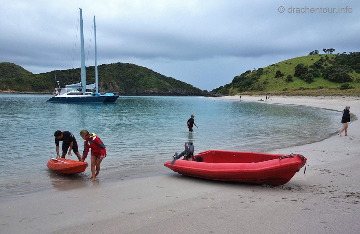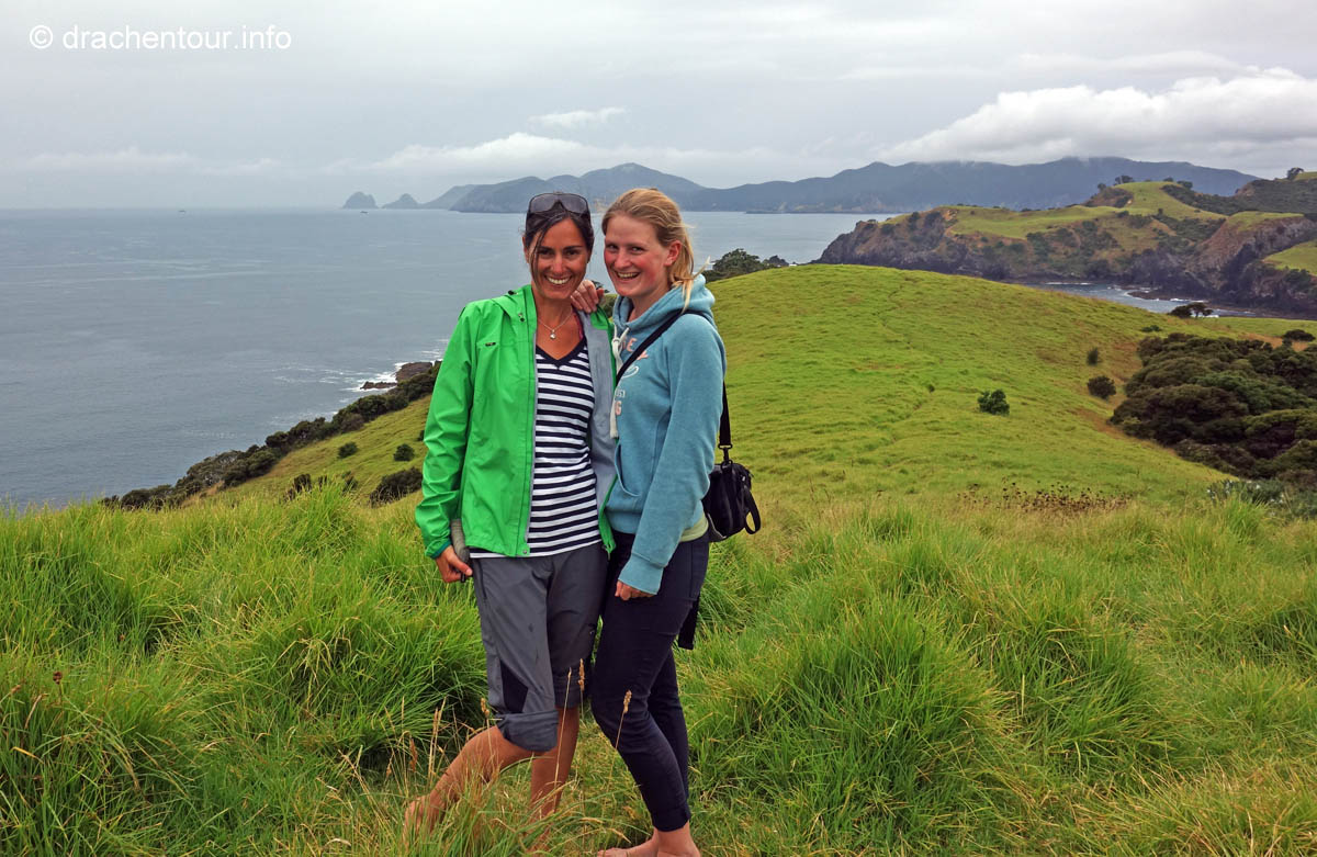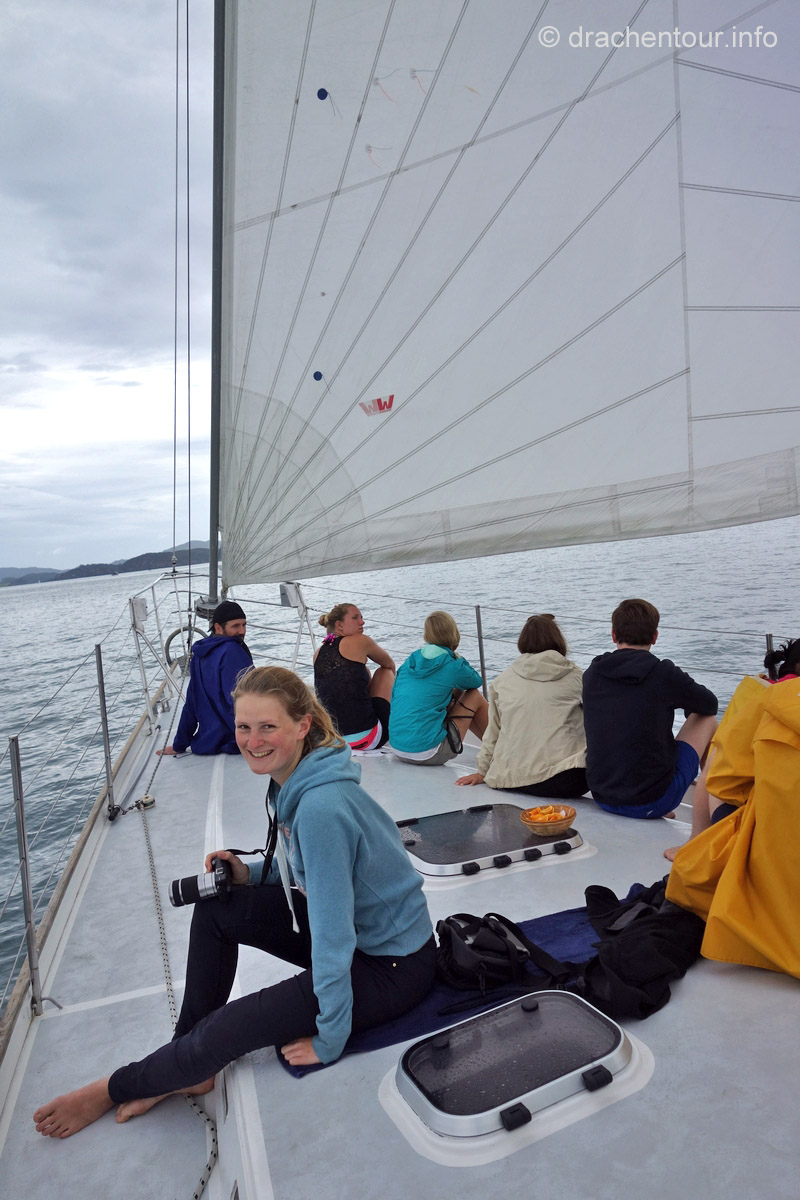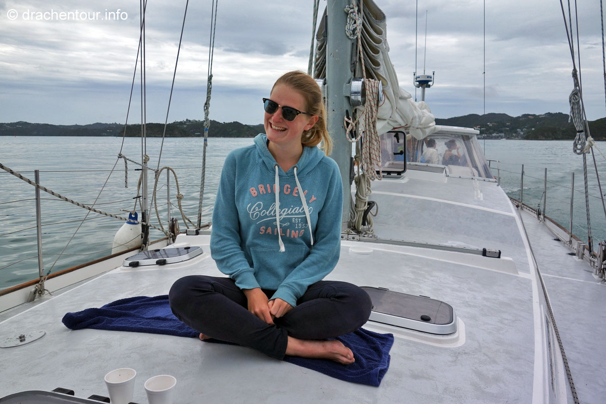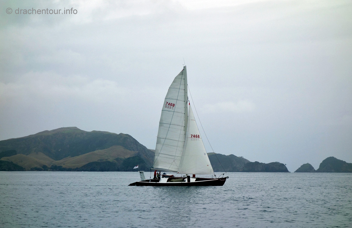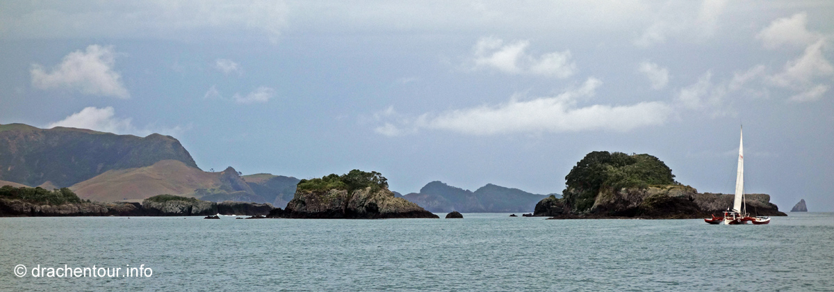 Heute planten wir einen „Ladies-day“, d.h. Marek verbrachte die Zeit alleine, indem er unsere Reise weiter plante und die vielen Bilder sortierte, während Seli und ich es uns auf einem Segelboot gemütlich machten. Leider spielte auch heute das Wetter nicht so wirklich mit und es war sogar regnerisch, so waren wir uns am Morgen noch nicht sicher, ob der Segeltörn überhaupt stattfinden kann und ob wir dazu Lust haben .... bei Regen den ganzen Tag auf dem Boot, bäh ! Nach langem hin und her und kritischem Abwägen entschieden wir uns für die Tour und eines sei gleich vorweg geschrieben, es war eine weise Entscheidung, denn abgesehen von dem nicht optimalen Wetter war alles andere echt sehr genial ! Es hörte sogar auf zu regnen und die Wolken lichteten sich ein kleinwenig. Wir hatten eine echt passable Sicht auf die wunderschönen Inseln, so konnten wir tatsächlich irgendwann noch die Segel setzten und wir schipperten friedlich durch die See und ließen uns vom Skipper und seiner Gehilfin nach allen Regeln der Kunst verwöhnen. Der Skipper hielt uns mit vielen interessanten Details über die Gegend und die Meerestiere auf dem Laufenden und wir bekamen sogar Pinguine ( sehr zur Freude von Seli :-) ) und Delphine kurz zu Gesicht und die nette Lady on Board verwöhnte uns permanent mit sämtlichen Leckereien, so wurde die Ausfahrt echt zu einem Genuss. Ein Höhepunkt war der kurze Stopp auf einer traumhaft schönen Insel mit so schönem klarem Wasser, das selbst bei bedecktem Himmel grün leuchtete. Dort unternahmen wir eine kleine Wanderung zu einem Aussichtspunkt, von dem wir einen atemberaubenden Blick auf die umliegende Inselwelt hatten - so toll ! Wieder am Strand musste ich mich von Seli geschlagen geben und zurück zu unserem Boot schwimmen !!! Anfangs dachte ich zwar, dass meine Atmung in eine Schnappatmung übergeht, aber allmählich gewöhnte ich mich an die kalten Temperaturen und war letztendlich dankbar, dass Seli so hartnäckig war - es war schön erfrischend in dem klaren Wasser zu schwimmen ! Wir beide waren total glücklich mit den Erlebnissen des heutigen Tages und freuten uns darauf Marek davon zu berichten, der uns bereits schon sehnsüchtig am Hafen erwartete. So konnten wir doch etwas von der Schönheit der Inselwelt in der Bay of Islands mitbekommen.