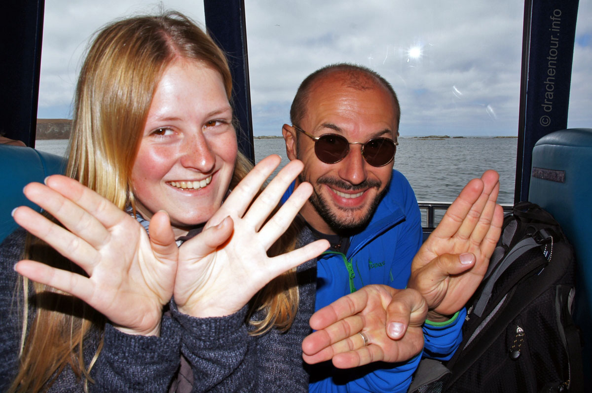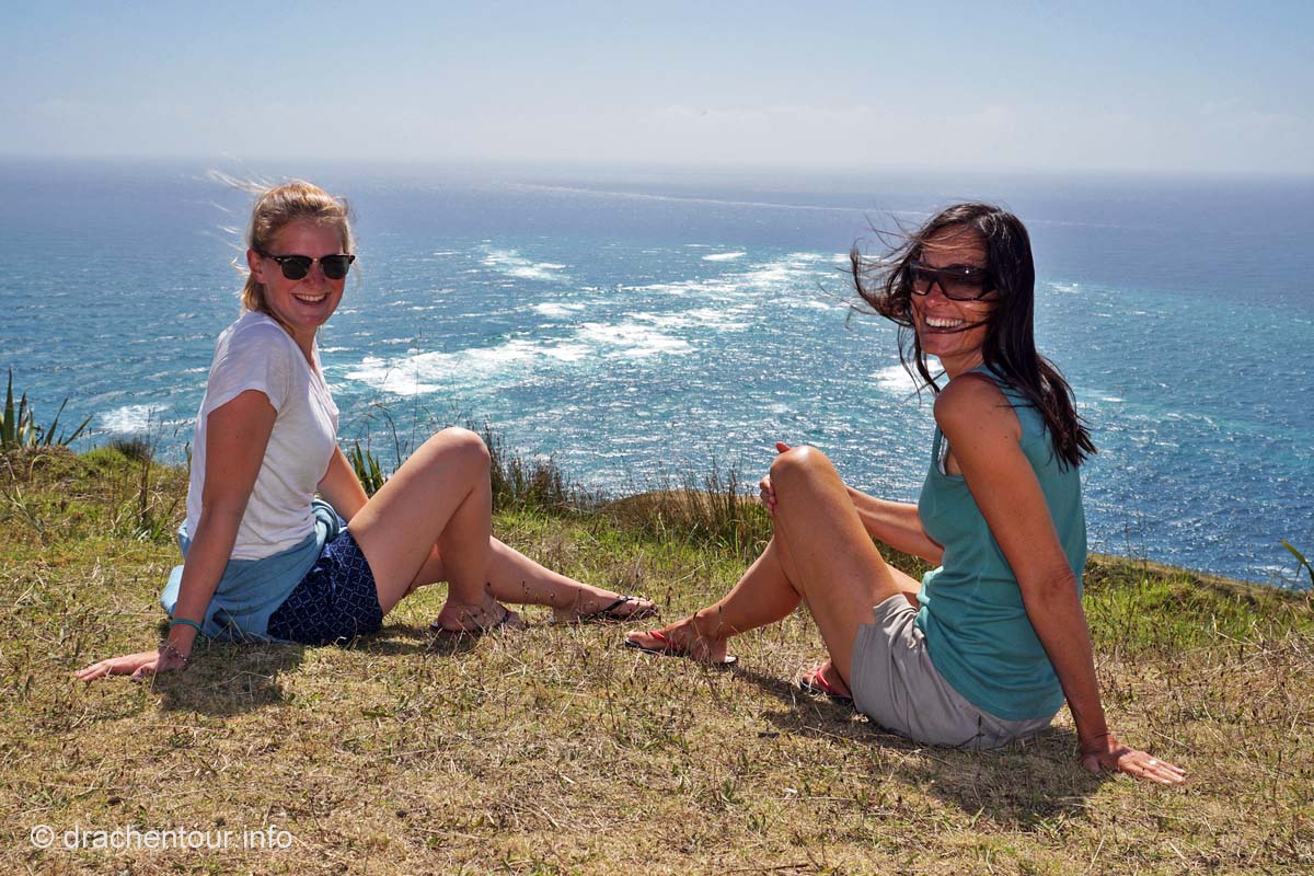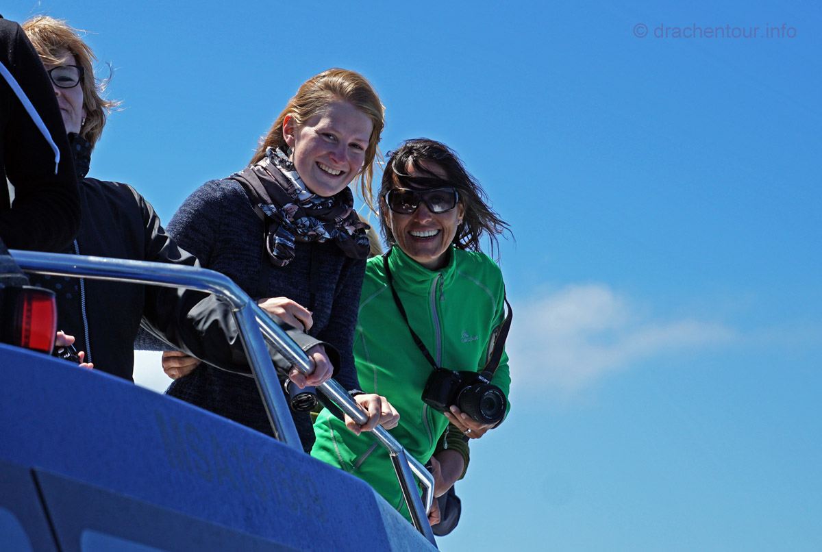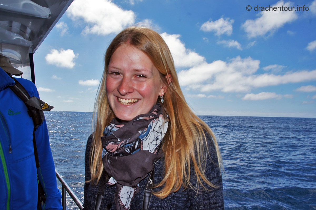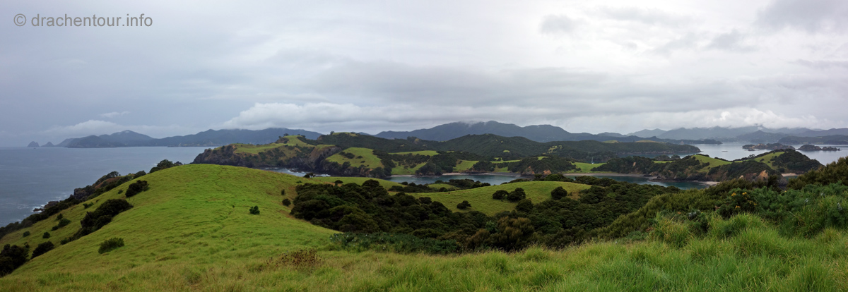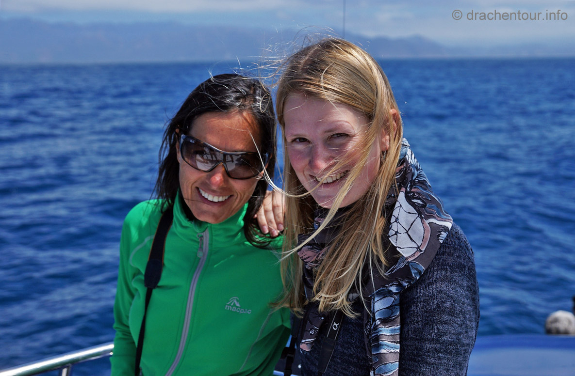 Heute planten wir einen „Ladies-day“, d.h. Marek verbrachte die Zeit alleine, indem er unsere Reise weiter plante und die vielen Bilder sortierte, während Seli und ich es uns auf einem Segelboot gemütlich machten. Leider spielte auch heute das Wetter nicht so wirklich mit und es war sogar regnerisch, so waren wir uns am Morgen noch nicht sicher, ob der Segeltörn überhaupt stattfinden kann und ob wir dazu Lust haben .... bei Regen den ganzen Tag auf dem Boot, bäh ! Nach langem hin und her und kritischem Abwägen entschieden wir uns für die Tour und eines sei gleich vorweg geschrieben, es war eine weise Entscheidung, denn abgesehen von dem nicht optimalen Wetter war alles andere echt sehr genial ! Es hörte sogar auf zu regnen und die Wolken lichteten sich ein kleinwenig. Wir hatten eine echt passable Sicht auf die wunderschönen Inseln, so konnten wir tatsächlich irgendwann noch die Segel setzten und wir schipperten friedlich durch die See und ließen uns vom Skipper und seiner Gehilfin nach allen Regeln der Kunst verwöhnen. Der Skipper hielt uns mit vielen interessanten Details über die Gegend und die Meerestiere auf dem Laufenden und wir bekamen sogar Pinguine ( sehr zur Freude von Seli :-) ) und Delphine kurz zu Gesicht und die nette Lady on Board verwöhnte uns permanent mit sämtlichen Leckereien, so wurde die Ausfahrt echt zu einem Genuss. Ein Höhepunkt war der kurze Stopp auf einer traumhaft schönen Insel mit so schönem klarem Wasser, das selbst bei bedecktem Himmel grün leuchtete. Dort unternahmen wir eine kleine Wanderung zu einem Aussichtspunkt, von dem wir einen atemberaubenden Blick auf die umliegende Inselwelt hatten - so toll ! Wieder am Strand musste ich mich von Seli geschlagen geben und zurück zu unserem Boot schwimmen !!! Anfangs dachte ich zwar, dass meine Atmung in eine Schnappatmung übergeht, aber allmählich gewöhnte ich mich an die kalten Temperaturen und war letztendlich dankbar, dass Seli so hartnäckig war - es war schön erfrischend in dem klaren Wasser zu schwimmen ! Wir beide waren total glücklich mit den Erlebnissen des heutigen Tages und freuten uns darauf Marek davon zu berichten, der uns bereits schon sehnsüchtig am Hafen erwartete. So konnten wir doch etwas von der Schönheit der Inselwelt in der Bay of Islands mitbekommen.