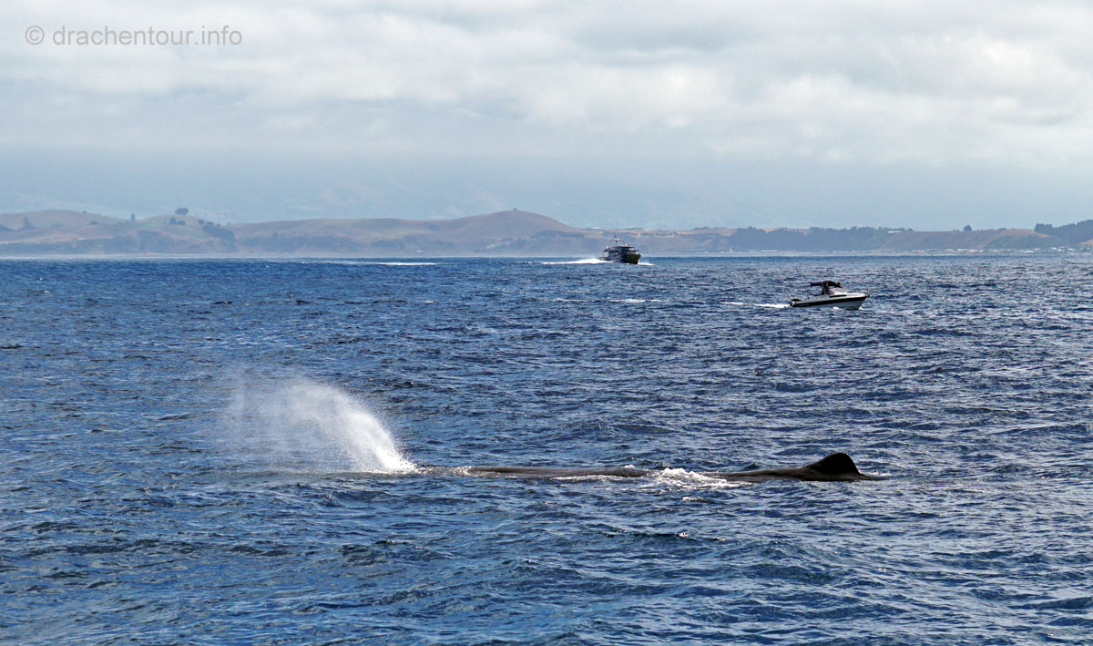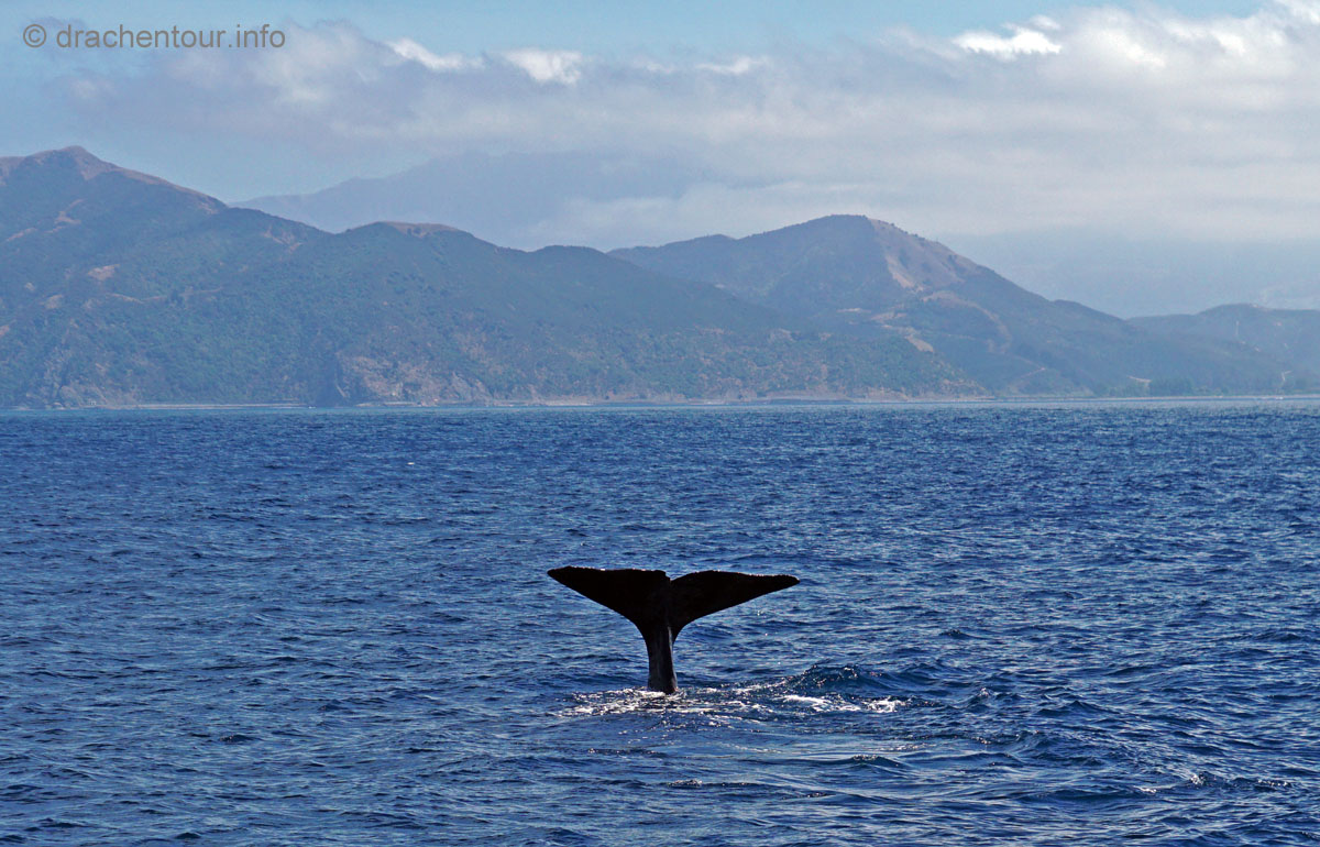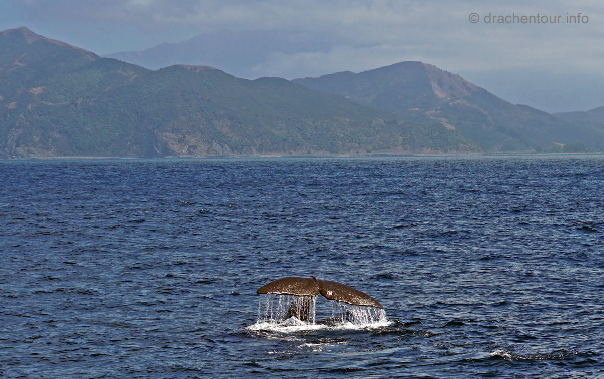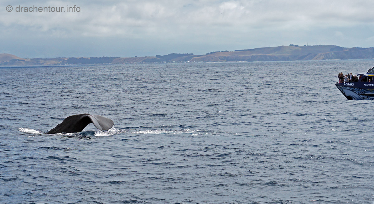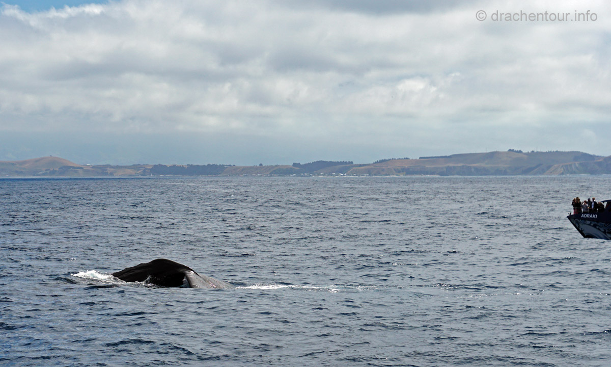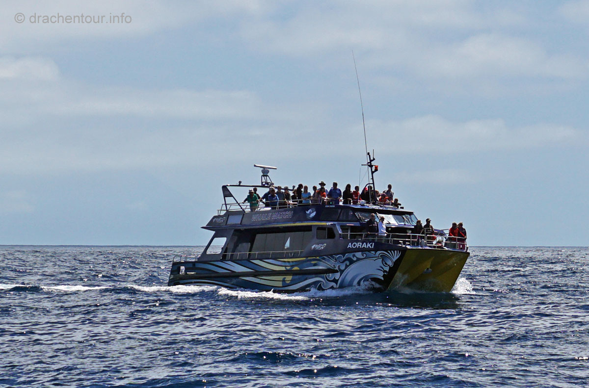 Genau dieses Grinsen verstärkte sich am nächsten Morgen, denn endlich ist es soweit, wir werden mit einem Schnellboot auf „ wale watching tour “ gehen, denn Kaikouras Spezialität sind die Begegnungen mit diesen Meeressäugetieren. Wir bestückten uns mit unseren Kameras und ab ging´s auf unser schönes Boot in Richtung Wale, wie man auf dem Bild deutlich erkennen kann, mutierten schon manche von uns zu Walen - so groß ist die Freude. Doch wo sind sie denn ! ? Unsere Guides waren sehr bemüht Wale zu orten und versuchten sie sogar mit einem Hydrophon an einer langen Stange zu hören. Als sie einen orteten, schickten sie uns wieder auf die Plätze und das Boot startete seine Motoren, die Gischt klatschte nur so an die Panoramascheiben und dann Stille, die Motoren sind abgestellt und das Sonnenlicht zeichnet Flecken auf die grüngrauen Wellen des Pazifiks. Wir vermuteten bei jeder Färbung ein Delphin oder ein Pinguin, stellten dann aber rasch fest, dass uns die Wellen ein Schnippchen schlugen. Die rund 40 Touristen an Bord und wir standen nun voller Erwartung auf dem Beobachtungsdeck und blinzelten angestrengt mit suchenden Augen in die Sonne. Und dann entdeckten wir etwas im Wasser, das eigentlich aussah wie ein langer treibender Baumstamm, doch als dieser Baumstamm auf einmal einen Strahl Wasserstaub von sich gab, war allen klar, dass es sich um einen Pottwal handelte - was für ein Anblick ! Wir waren so dicht dran, dass ich es fast mit der Angst zu tun bekam, so groß ist dieses faszinierende Tier ! Vor lauter Ergreifung war ich nicht in der Lage Fotos zu schießen - ein Pottwal - so nah - das muss ich erst mal verkraften. Plötzlich biegt der Wal seinen Rücken, der riesige Kopf taucht ab und die breite Schwanzflosse erhebt sich majestätisch und verschwindet dann sanft in der Tiefe - eines der heißbegehrtesten Fotomotive !!! Wir waren überglücklich das Wunder der Natur, in diesem perfekten Augenblick live zu erleben - unfassbar - mal wieder waren wir sprachlos und vor Glück den Tränen nahe - es gibt Momente, die können weder in Bild noch in Schrift festgehalten werden, dies ist so einer !!!
