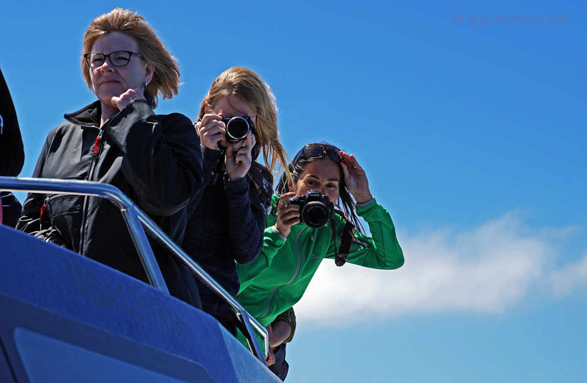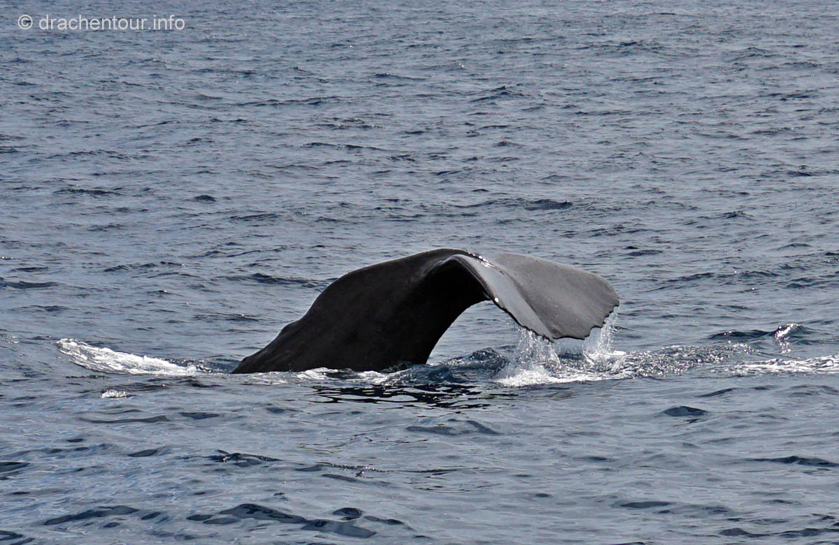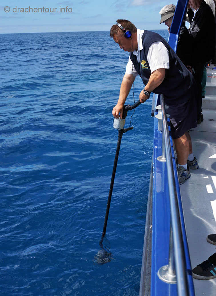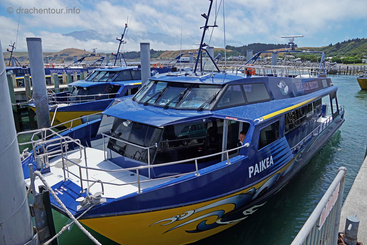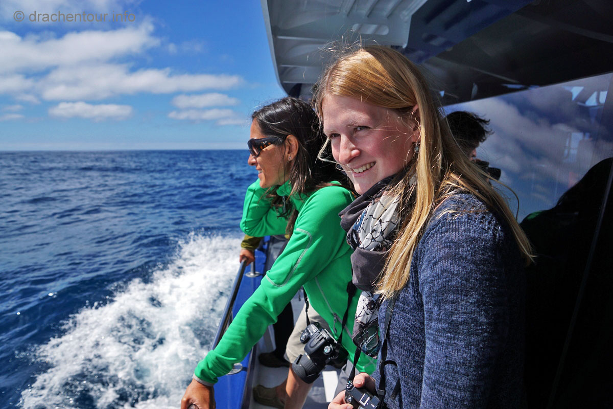Genau dieses Grinsen verstärkte sich am nächsten Morgen, denn endlich ist es soweit, wir werden mit einem Schnellboot auf „ wale watching tour “ gehen, denn Kaikouras Spezialität sind die Begegnungen mit diesen Meeressäugetieren. Wir bestückten uns mit unseren Kameras und ab ging´s auf unser schönes Boot in Richtung Wale, wie man auf dem Bild deutlich erkennen kann, mutierten schon manche von uns zu Walen - so groß ist die Freude. Doch wo sind sie denn ! ? Unsere Guides waren sehr bemüht Wale zu orten und versuchten sie sogar mit einem Hydrophon an einer langen Stange zu hören. Als sie einen orteten, schickten sie uns wieder auf die Plätze und das Boot startete seine Motoren, die Gischt klatschte nur so an die Panoramascheiben und dann Stille, die Motoren sind abgestellt und das Sonnenlicht zeichnet Flecken auf die grüngrauen Wellen des Pazifiks. Wir vermuteten bei jeder Färbung ein Delphin oder ein Pinguin, stellten dann aber rasch fest, dass uns die Wellen ein Schnippchen schlugen. Die rund 40 Touristen an Bord und wir standen nun voller Erwartung auf dem Beobachtungsdeck und blinzelten angestrengt mit suchenden Augen in die Sonne. Und dann entdeckten wir etwas im Wasser, das eigentlich aussah wie ein langer treibender Baumstamm, doch als dieser Baumstamm auf einmal einen Strahl Wasserstaub von sich gab, war allen klar, dass es sich um einen Pottwal handelte - was für ein Anblick ! Wir waren so dicht dran, dass ich es fast mit der Angst zu tun bekam, so groß ist dieses faszinierende Tier ! Vor lauter Ergreifung war ich nicht in der Lage Fotos zu schießen - ein Pottwal - so nah - das muss ich erst mal verkraften. Plötzlich biegt der Wal seinen Rücken, der riesige Kopf taucht ab und die breite Schwanzflosse erhebt sich majestätisch und verschwindet dann sanft in der Tiefe - eines der heißbegehrtesten Fotomotive !!! Wir waren überglücklich das Wunder der Natur, in diesem perfekten Augenblick live zu erleben - unfassbar - mal wieder waren wir sprachlos und vor Glück den Tränen nahe - es gibt Momente, die können weder in Bild noch in Schrift festgehalten werden, dies ist so einer !!!