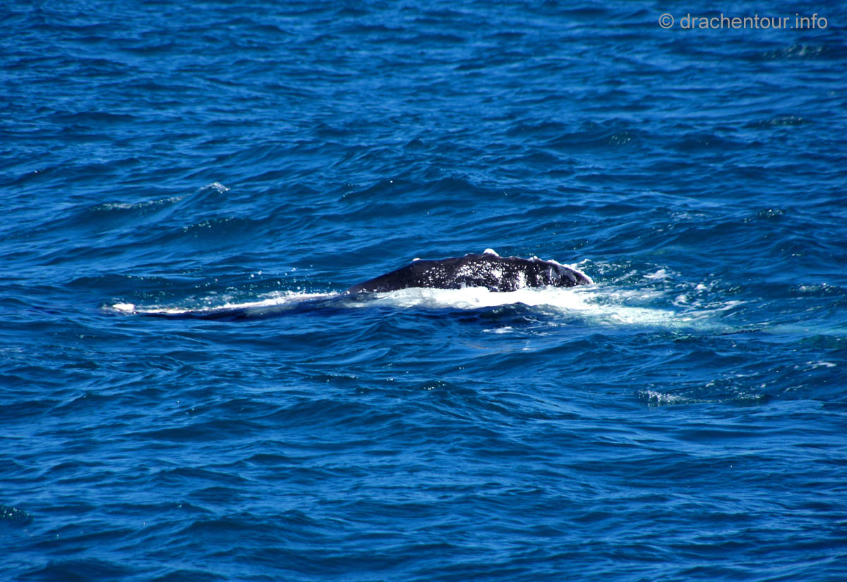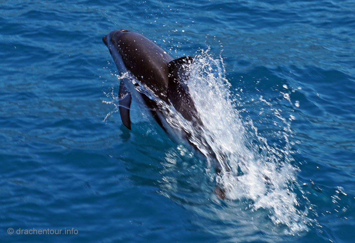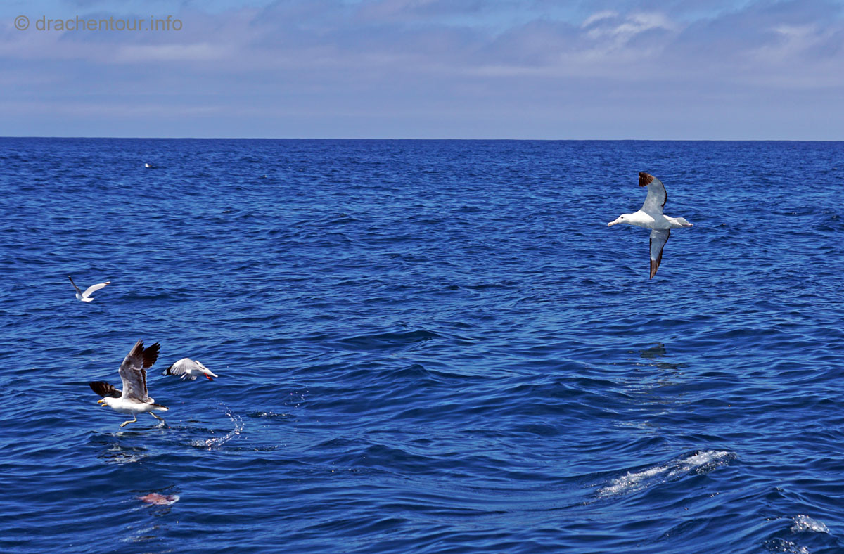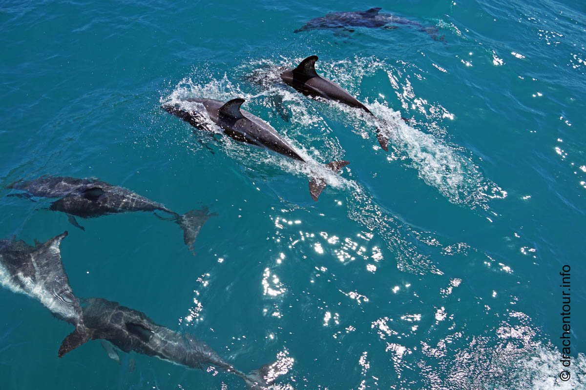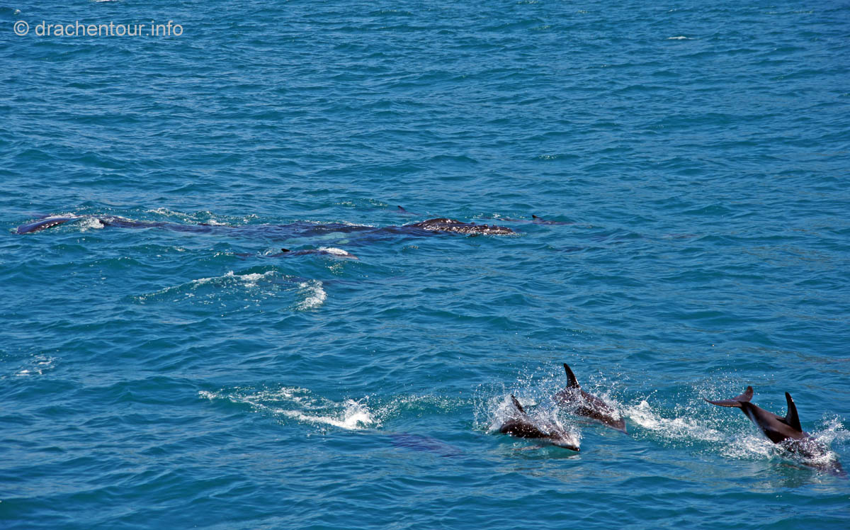 Doch dem nicht genug, wieder heulten die Motoren auf und wir flitzten über die Wellen um erneut einen Blick auf andere Meeressäuger zu ergattern. Auf dem Weg wurden wir von einer ganzen Horde Delphinen begleitet, die übermütig um unser Boot herumtänzelten, mal unter unserem Boot verschwanden um auf der anderen Seite wieder aufzutauchen, sie spielten mit uns und wir waren ihnen dafür sehr dankbar. Die Motoren stoppten und vor uns lag ein Buckelwal im Wasser, der schwer zu erkennen war. Sie sind hier sehr seltene Gäste, nur zweimal pro Jahr kann man sie durchschnittlich sehen, da hatten wir wohl auch wieder großes Glück :-) ! Er drehte sich einmal um seine Achse und tauchte dann langsam und leise ab. Auf dem Rückweg begleiteten uns die Delphine und viele Albatrosse, die elegante Schleifen um das Boot drehten. In Kaikoura wird man garantiert diese größten Meeressäugetiere zu Gesicht bekommen, weil sie in der Bucht von Kaikoura auf ihrer Wanderung Station machen, denn hier finden sie quasi einen gedeckten Tisch vor. Der Grund hierfür ist der Kaikoura-Canyon, ein Meeresgraben, der von tausend Meter Tiefe in Küstennähe auf 3000 Meter und mehr absinkt. Zwei Strömungen, die eine kalt und die andere warm, wirbeln hier ineinander und sorgen für optimalen Nährstoffnachschub in Form von Plankton und Fischen. Überglücklich über das Erlebte schwebten wir vom Boot, bedankten uns tausendmal bei unserer Crew und konnten es kaum erwarten das Gesehene zu verdauen und uns gegenseitig die Fotos zu zeigen, was wir auch bei einem Cappuccino in " unserem " Café machten. Beflügelt und happy waren wir und so neigte sich dieser grandiose Tag seinem Ende zu.