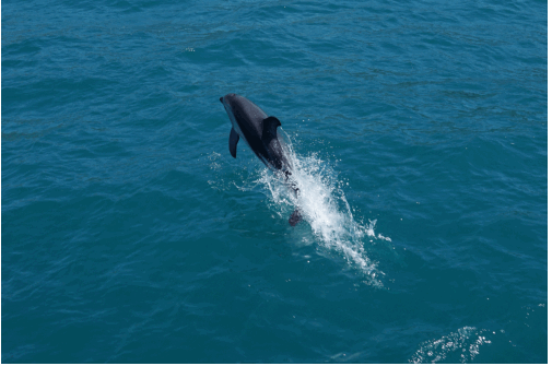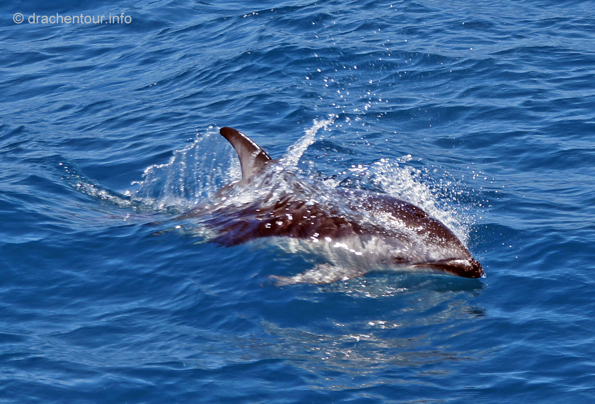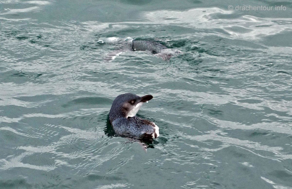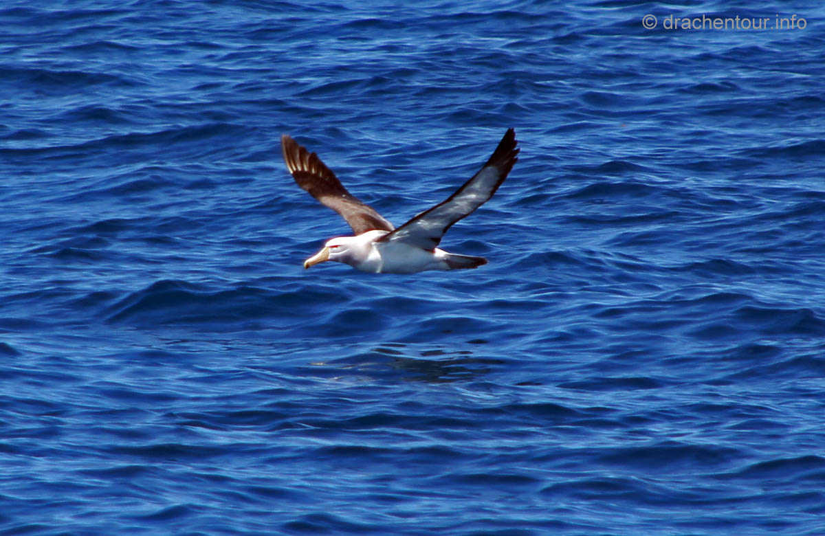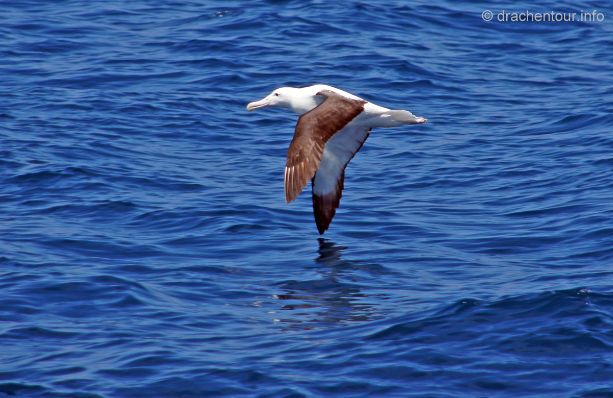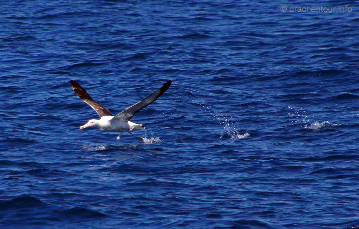 Doch dem nicht genug, wieder heulten die Motoren auf und wir flitzten über die Wellen um erneut einen Blick auf andere Meeressäuger zu ergattern. Auf dem Weg wurden wir von einer ganzen Horde Delphinen begleitet, die übermütig um unser Boot herumtänzelten, mal unter unserem Boot verschwanden um auf der anderen Seite wieder aufzutauchen, sie spielten mit uns und wir waren ihnen dafür sehr dankbar. Die Motoren stoppten und vor uns lag ein Buckelwal im Wasser, der schwer zu erkennen war. Sie sind hier sehr seltene Gäste, nur zweimal pro Jahr kann man sie durchschnittlich sehen, da hatten wir wohl auch wieder großes Glück :-) ! Er drehte sich einmal um seine Achse und tauchte dann langsam und leise ab. Auf dem Rückweg begleiteten uns die Delphine und viele Albatrosse, die elegante Schleifen um das Boot drehten. In Kaikoura wird man garantiert diese größten Meeressäugetiere zu Gesicht bekommen, weil sie in der Bucht von Kaikoura auf ihrer Wanderung Station machen, denn hier finden sie quasi einen gedeckten Tisch vor. Der Grund hierfür ist der Kaikoura-Canyon, ein Meeresgraben, der von tausend Meter Tiefe in Küstennähe auf 3000 Meter und mehr absinkt. Zwei Strömungen, die eine kalt und die andere warm, wirbeln hier ineinander und sorgen für optimalen Nährstoffnachschub in Form von Plankton und Fischen. Überglücklich über das Erlebte schwebten wir vom Boot, bedankten uns tausendmal bei unserer Crew und konnten es kaum erwarten das Gesehene zu verdauen und uns gegenseitig die Fotos zu zeigen, was wir auch bei einem Cappuccino in " unserem " Café machten. Beflügelt und happy waren wir und so neigte sich dieser grandiose Tag seinem Ende zu.
