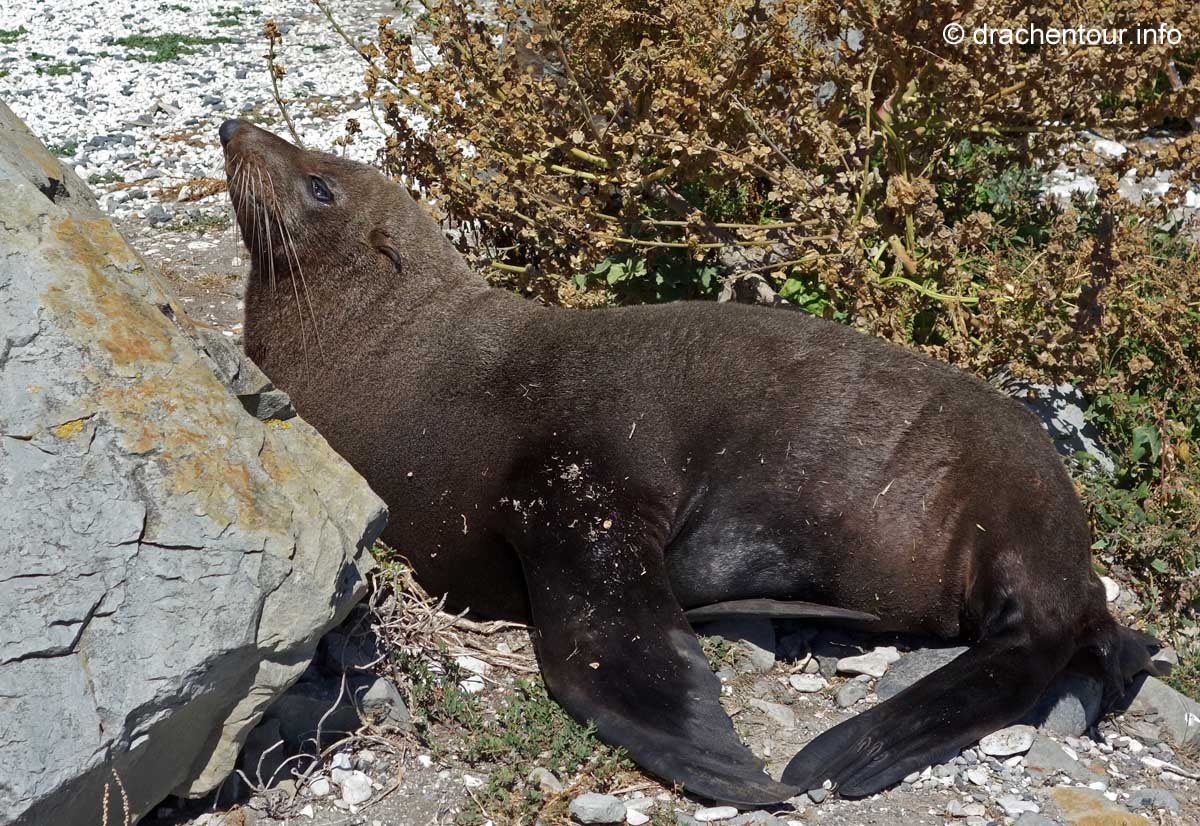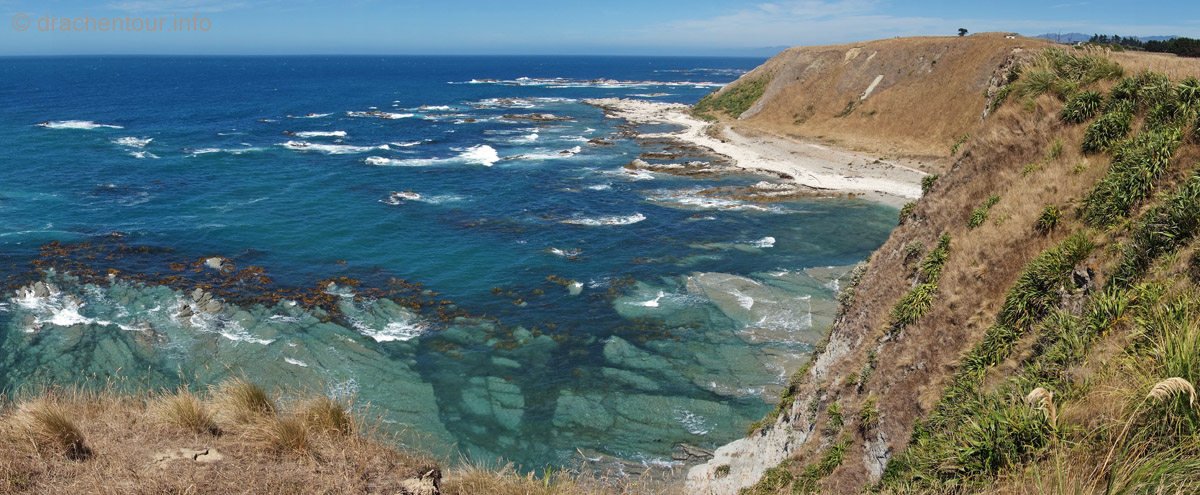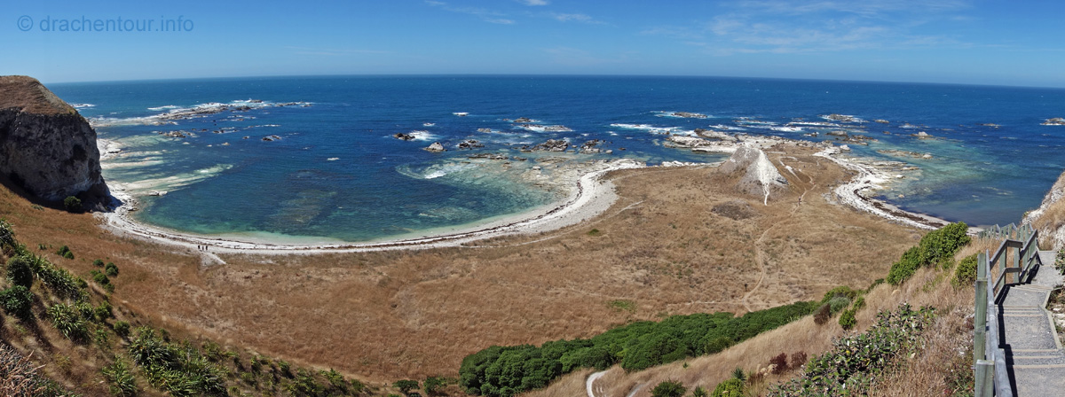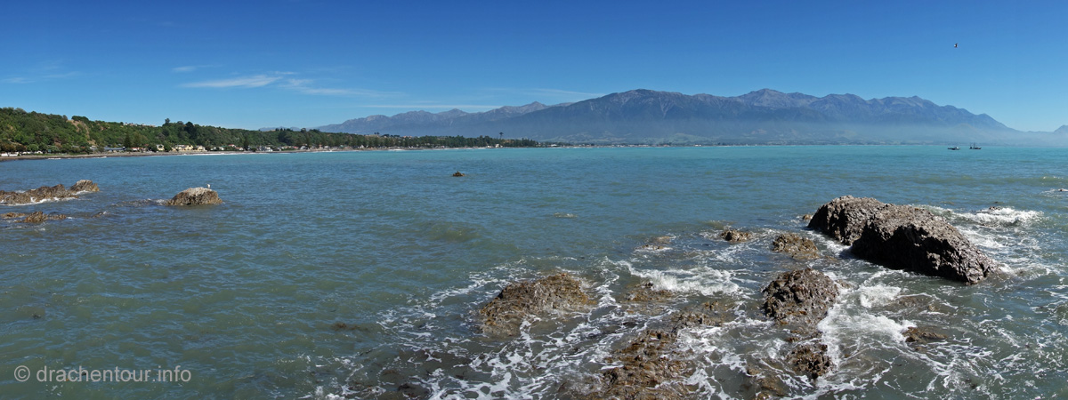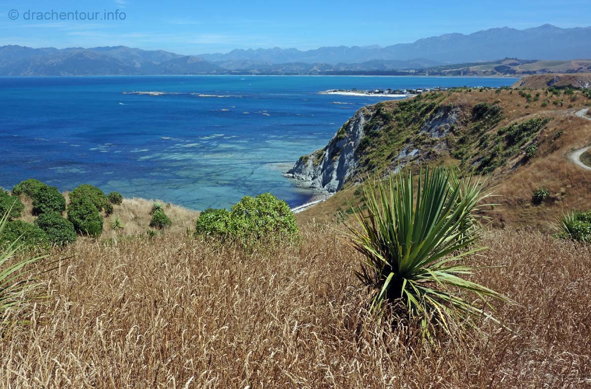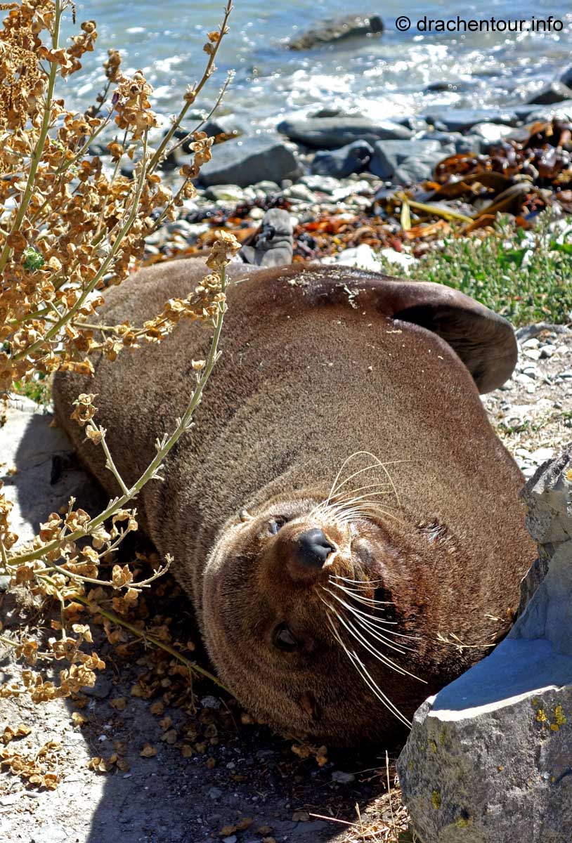Nicht nur das Küstengewässer von Kaikoura ist phänomenal, sondern auch die Landschaft ist spektakulär ! Die Stadt liegt zwischen den zerklüfteten Bergen ( Seaward Kaikoura Range ) und dem pazifischen Ozean und an sie schließt die wunderschöne felsige Halbinsel an. Genau diese umwanderten wir an unserem zweiten Tag hier. Der Rundweg (der Maori Track) führte zunächst am Meer entlang, wo wir auf eine einsame, natürlich schlafende Robbe trafen, die aber nachdem sie aufgewacht war uns als Fotomodell posierte. Dann ging es ein paar Höhenmeter nach oben und wir folgten den Pfad hoch über dem Meer an den Klippen entlang. Von dort hatten wir unsagbar schöne Ausblicke auf grandios gelegene Buchten und riesige Kalksteinformationen. Alle paar Meter mussten wir stehen bleiben, verweilen und den Ausblick zu genießen und zu erfassen - eine einzigartig schöne Landschaft !