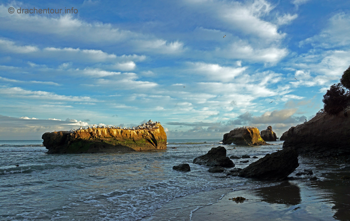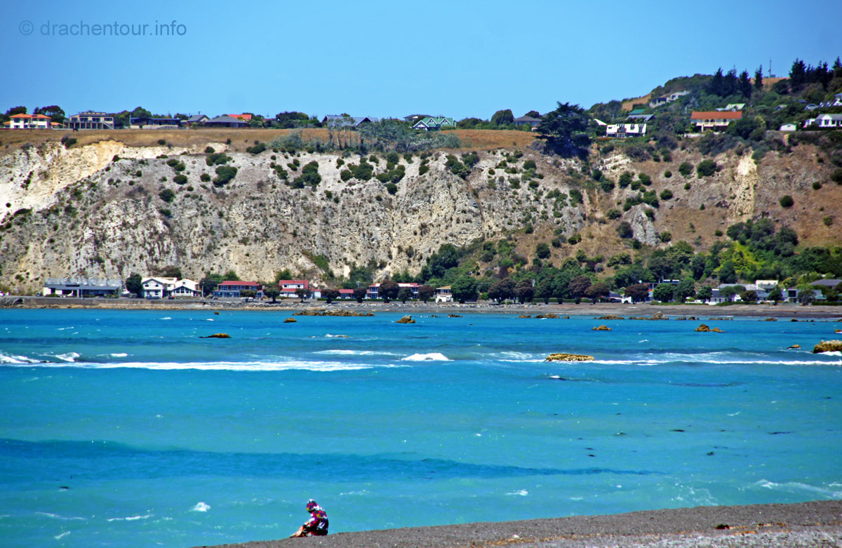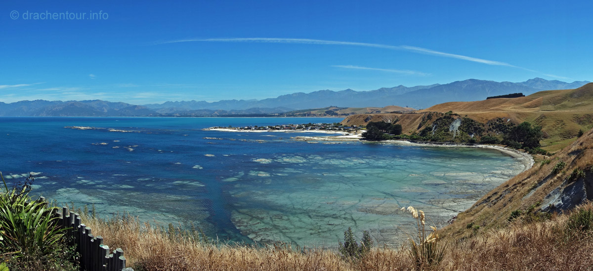 Danach kamen wir wieder ans Meer und folgten einer äußerst spektakulären Küstenstraße, die uns traumhafte Ausblicke auf den wilden Pazifik bescherte. Am frühen Nachmittag erreichten wir unser Tagesziel und checkten in unseren luxuriösen Campingplatz ein. Die malerische Küstenstadt Kaikoura ist der perfekte Ort, um Meeresbewohner - allen voran Wale - zu beobachten und entlang der traumhaft schönen Küste zu wandern. Das erste wollten wir sofort organisieren, so machten wir uns auf den Weg in die Stadt zur i-Site, um uns eine Fahrt für morgen zu sichern. Im Anschluss bummelten wir noch durch das kleine und sehr charmante Örtchen und schlürften einen leckeren Cappuccino in einem netten Café mit deutscher Bedienung. Auf unserem fünf Sterne Campingplatz gab es einen kleinen Pool und zwei Hot Tubes, die wir natürlich ausgiebig nutzten und darin plantschten, so klang der Abend aus. Jeder von uns hatte beim Einschlafen ein leichtes Grinsen im Gesicht, verursacht von der Aussicht auf das morgige Programm !