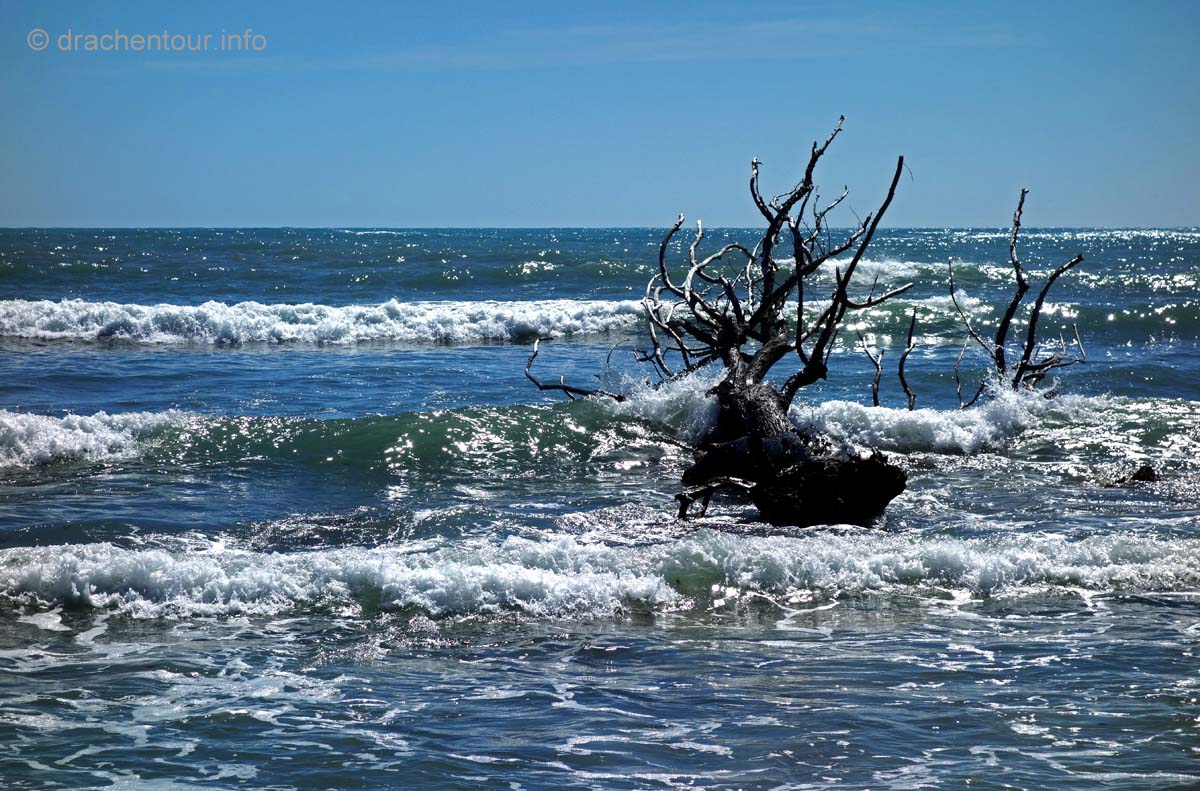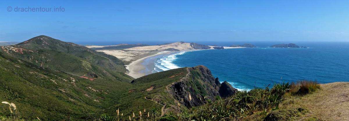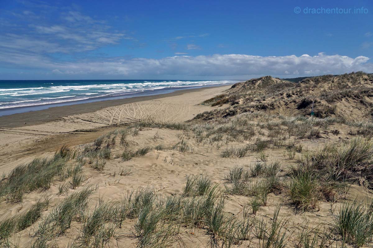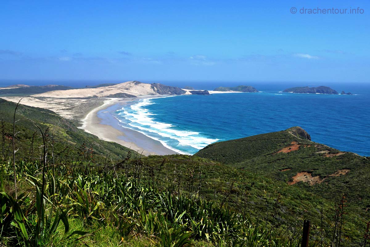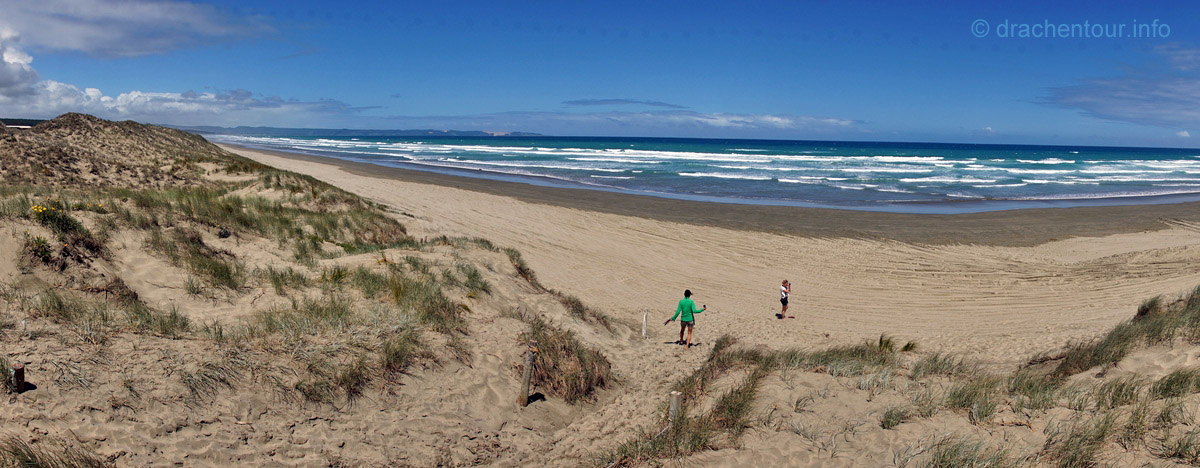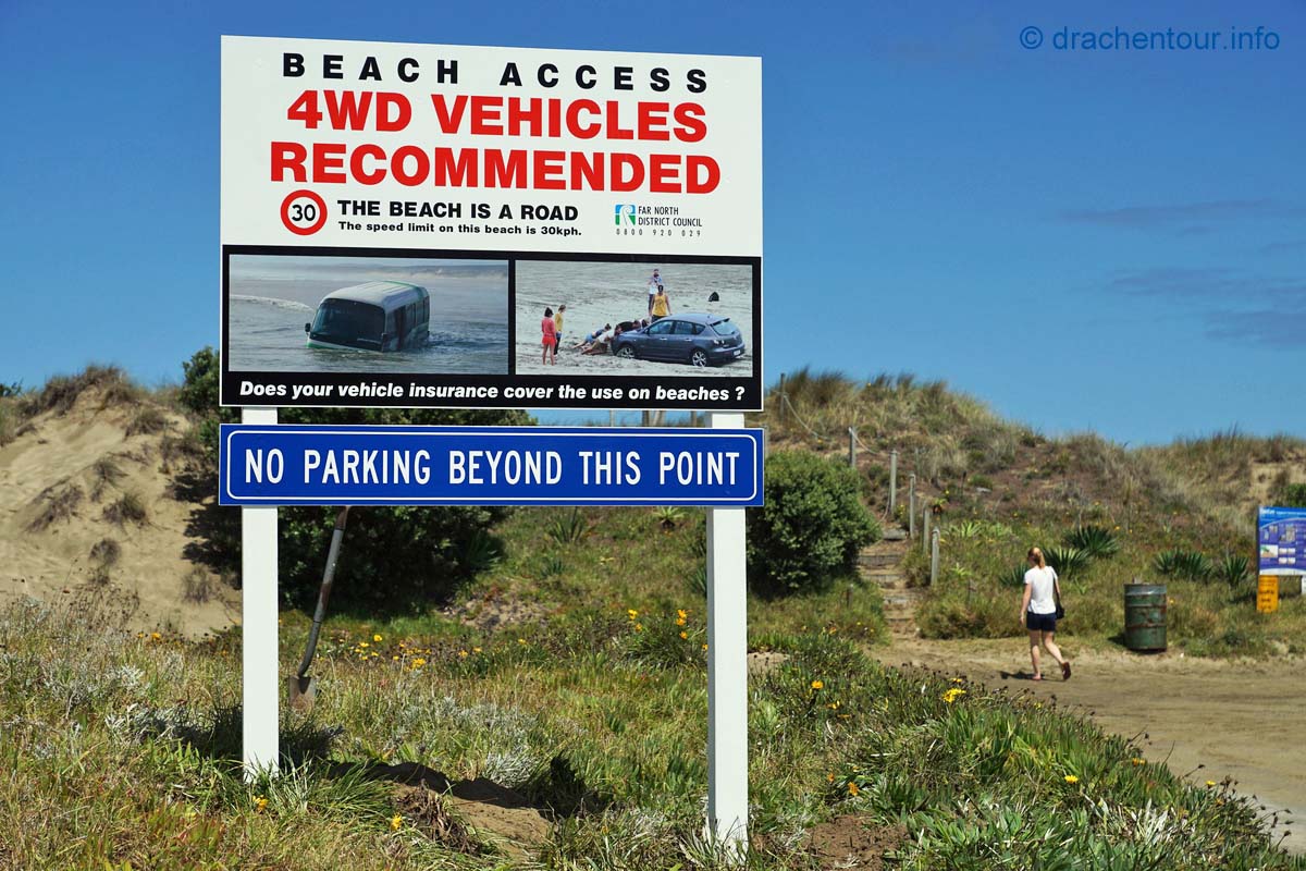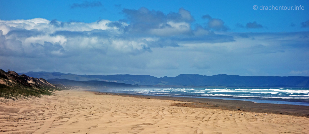 Heute wollten wir hoch hinaus und zwar ganz in den Norden der Nordinsel zum Cape Reinga, d.h. mal wieder werden wir einige Kilometer hinter dem Steuer unserer Juicy verbringen. Wir fuhren zunächst an der landschaftlich sehr schönen Ostküste entlang. Dabei hatten wir immer wieder wunderschöne Aussichten auf malerische Buchten, wie zum Beispiel die Matauri Bay. Kurz hinter Kataia wurde die Straße schmaler und kurviger, wir befanden uns auf dem letzten Zipfel von Neuseeland, auf der Aupori Halbinsel. Es fühlte sich auch an, als ob wir ans Ende der Welt fahren würden, denn es begegneten uns so gut wie keine Autos mehr und auch die kleinen Ortschaften, die wir passierten waren kaum wahrzunehmen. Die Landschaft und die Natur wurden ursprünglicher und wild romantisch. Wir legten noch kurz einen Zwischenstopp am „ Ninety Miles Beach “ ein, dieser begleitete uns die letzten Kilometer an der Westküste bis ganz in den Norden. Der Name des Strandes ist etwas irreführend, denn tatsächlich ist er nur 88 km, was ca. 55 Meilen entspricht, lang. Der Strand ist sogar offiziell ein Teil des Fernstraßennetzes in Neuseeland, die Benutzung erfolgt jedoch auf eigene Gefahr und ist, wenn überhaupt, nur mit einem Allradantrieb zu empfehlen. Bereits auf den Zufahrtsstraßen sind Warnschilder angebracht, die darauf hinweisen, dass man im lockeren Sand stecken bleiben kann. Dieses Risiko wollten wir mit unserer Juicy natürlich nicht eingehen, so entschieden wir uns für die sichere Variante, d.h. wir parkten Juicy auf sicherem und festem Untergrund und spazierten zu Fuß zu dem beeindruckend langen Sandstrand, dessen Ende weder links noch rechts ausfindig zu machen war - was für eine Weite – spitze !