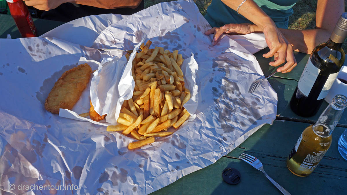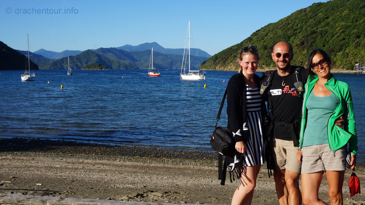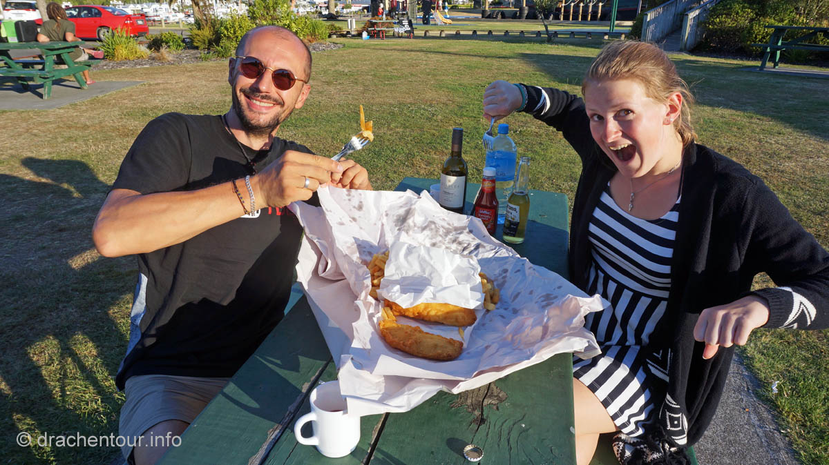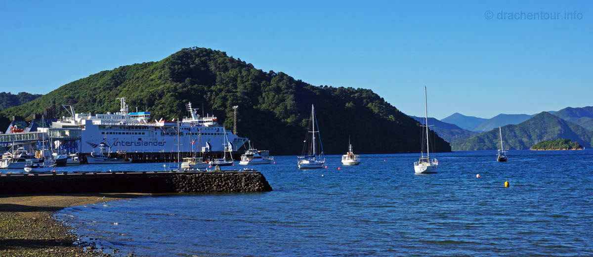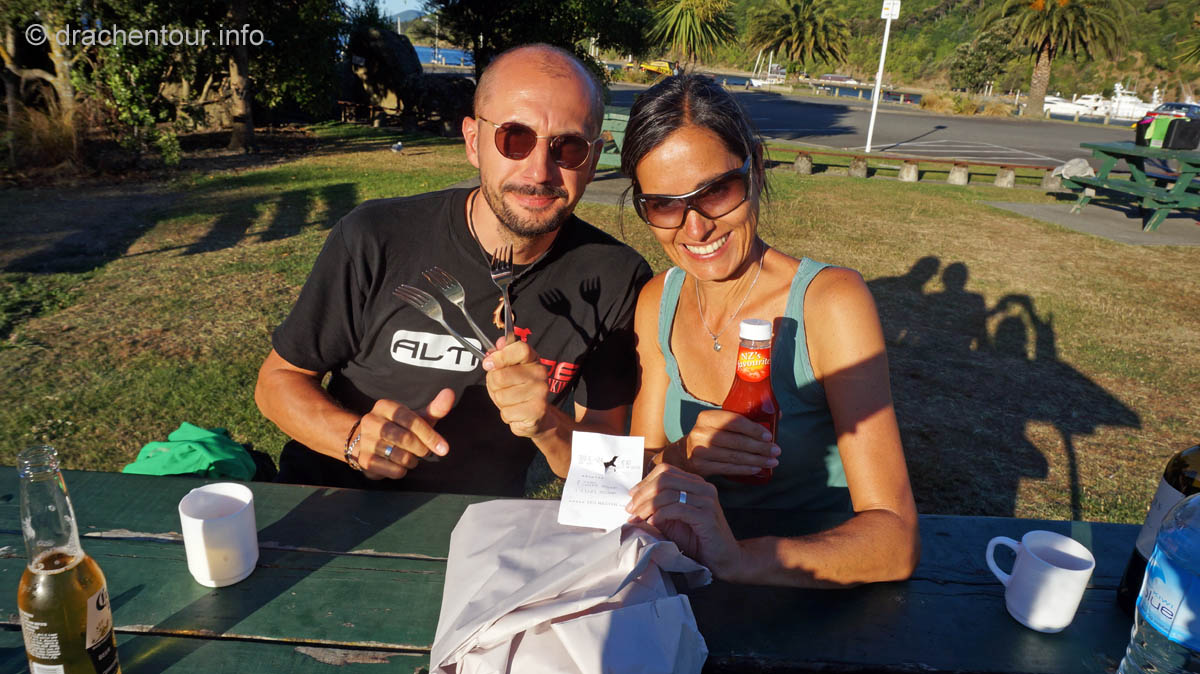 Im Anschluss an diese phänomenale Wanderung setzten wir uns glückselig in unsere Juicy und fuhren nach Picton um rechtzeitig am Abfahrtsort unserer Fähre auf die Nordinsel zu sein, denn der ist bereits Morgen. Am frühen Abend erreichte wir die kleine, fast menschenleere Stadt und suchten als erstes unseren Stellplatz für die Nacht. Den fanden wir auch relativ rasch, direkt am wunderschön gelegenen Hafen. Heute Abend wollten wir unbedingt mal Fish & Chips ausprobieren, gesagt, getan und so aßen wir die so lá-lá schmeckende Besonderheit Neuseelands, während sich die Sonne von uns verabschiedete. Die Nacht sollte etwas aufregend werden, das passierte so: wir haben für unsere Juicy quasi einen Parkplatz fast direkt an der Fähre ausgesucht und da es im Moment in ganz Neuseeland sehr trocken ist, müssen die ganzen Grünflächen bewässert werden, so natürlich auch die Grünfläche bei unserem Parkplatz. Die Düsen waren allerdings so ungeschickt eingestellt, dass sie weitaus häufiger unsere Juicy trafen, als das Grün. An diesem seltsamen Geräusch erwachten wir etwas erschreckt, erkannten die Lage dann aber schnell und waren beruhigt. Alles half nicht, denn wir mussten zu allem dann auch noch aufs Klo, also raus und da erwischte uns die Sprinkleranlage eiskalt - Sachen gibt's:-) ! Den Rest der Nacht verbrachten wir dann ohne weitere Komplikationen.