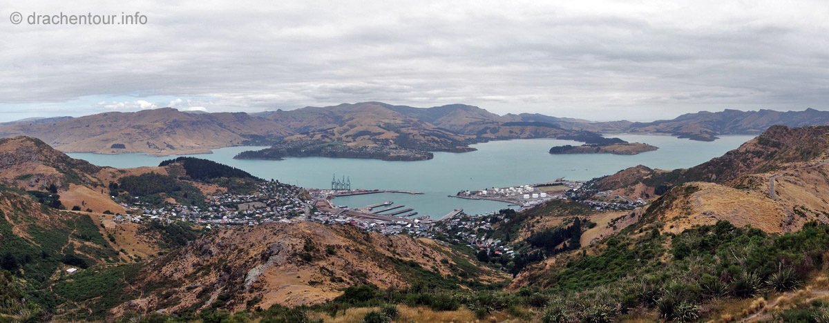 Christchurch und auch unser tolles Hotel " Chateau on the Park " hat uns so sehr gefallen, dass wir dort über eine Woche verweilten. Wir nutzen die Zeit, um unsere Homepage zu pflegen, Yoga zu machen, gemütlich in der Stadt, durch den Botanischen Garten und den Hagley Park zu bummeln. Allerdings brauchten wir dann doch hin und wieder eine Auszeit von der Stadt und so machten wir uns zu einigen kleinen Ausflügen auf. So unternahmen wir zum Beispiel eine kleine Wanderung von Christchurch über eine kleine Bergkette, den Porthills, nach Lyttelton. Von den Hügeln hatten wir eine schöne Aussicht über den Hafen von Lyttelton und die Halbinsel Akaroa.