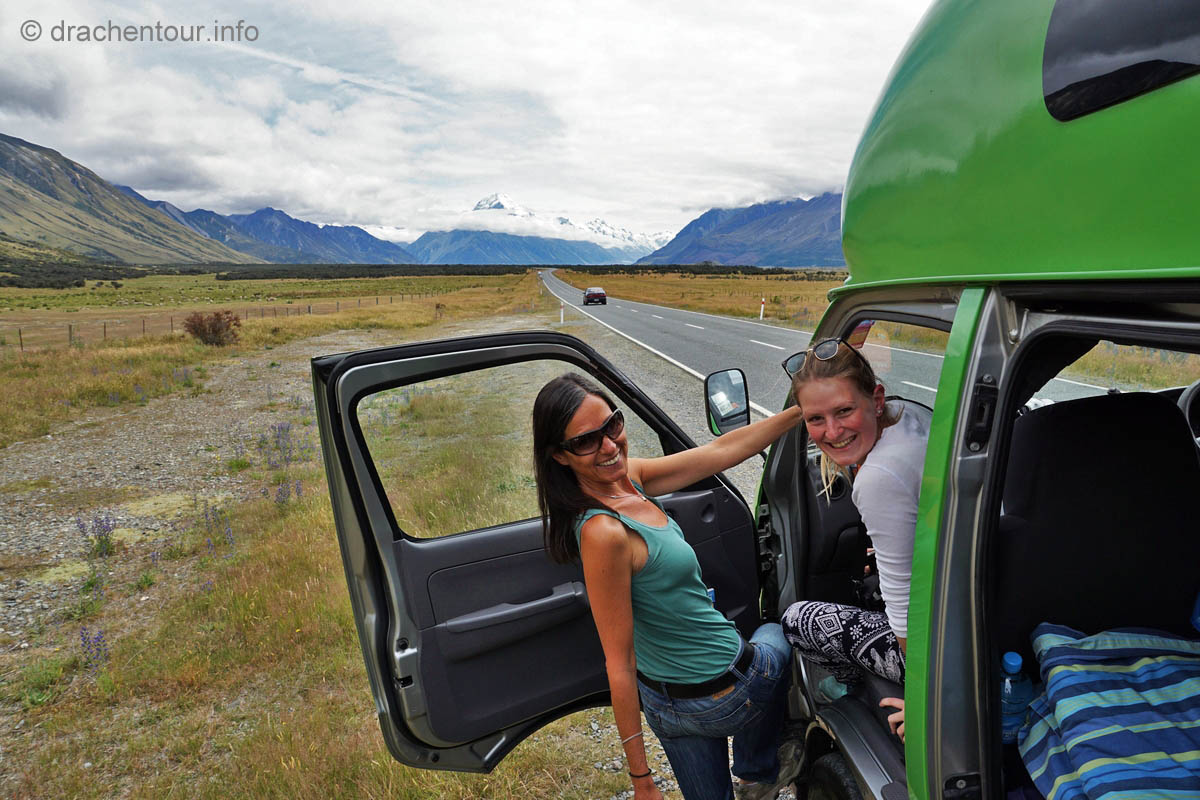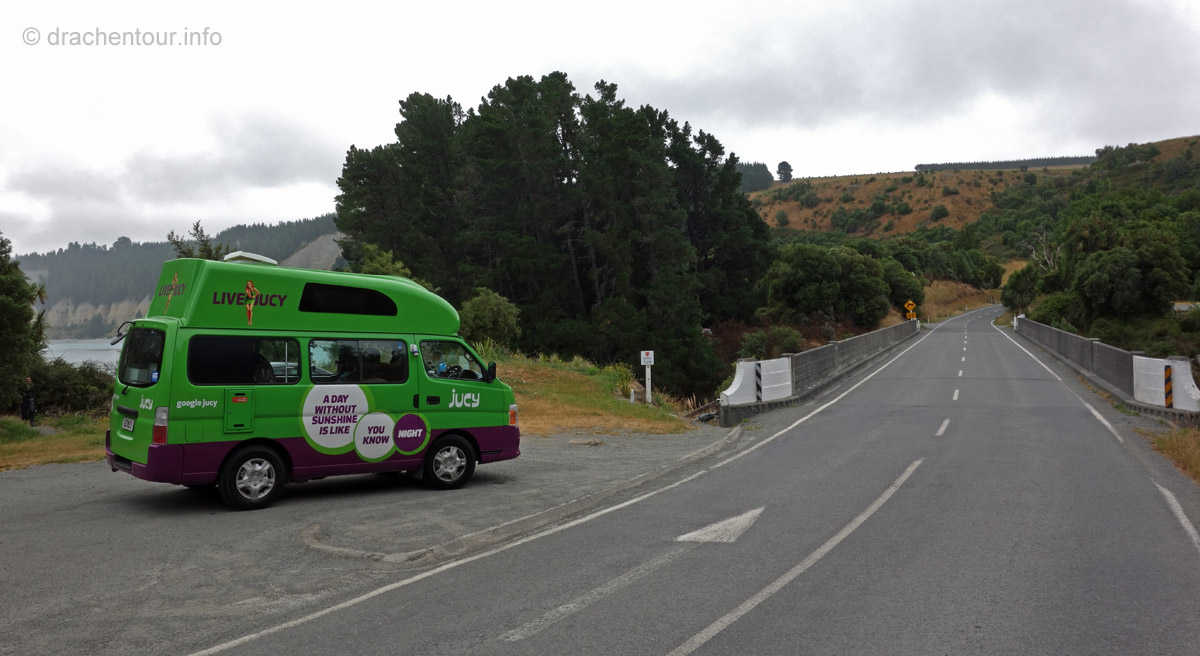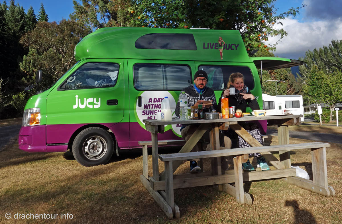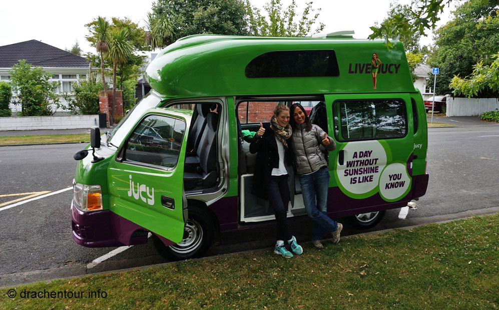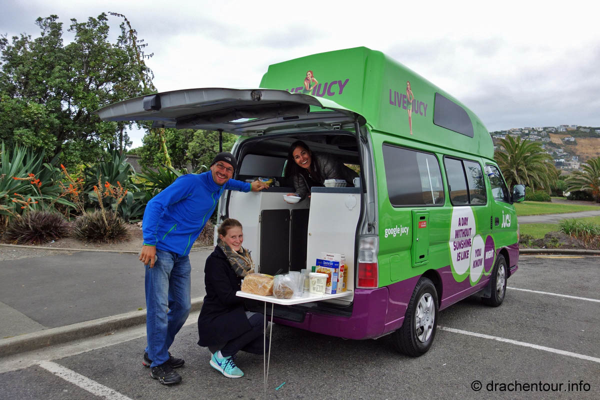 So vergingen die Tage sehr schnell und schwupp die wupp wurden aus zwei Drachs drei Drachen: unsere Nichte Selina bereicherte ab jetzt unsere Neuseelandreise. Und halt nein eigentlich sind wir nun zu viert ! Drei Frauen (der arme - oder glückliche - Marek :-) ), denn auch Jucy Lucy ist jetzt mit am Start. Jucy Lucy ist unser Wohnmobil mit dem wir drei nun die beiden Inseln mit ihren Schätzen entdecken wollen. Nach einer knappen Vorbereitung, bei der wir die Hauptziele miteinander absprachen, konnte unser Road Trip nun beginnen. Die erste Nacht verbrachten wir noch in Christchurch, mit Morgentoilette beim Maces und Outdoor Frühstück an unserem geliebten Sumner Beach, den wir Selina noch gerne zeigen wollten. Dann ging es los und wir tauchten ab in die atemberaubenden Landschaften Neuseelands – jipiii !
