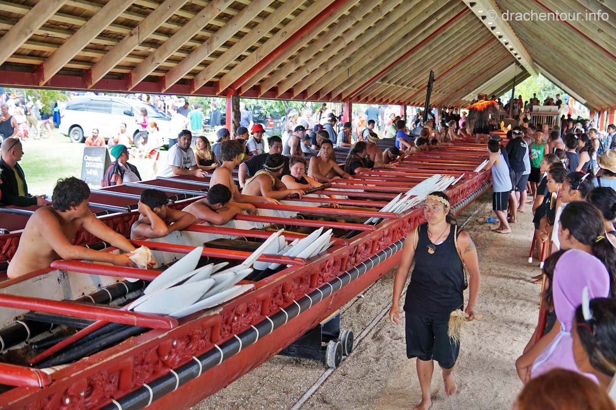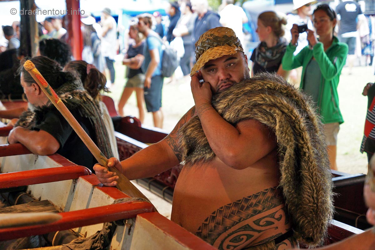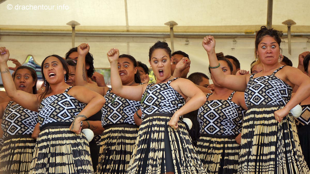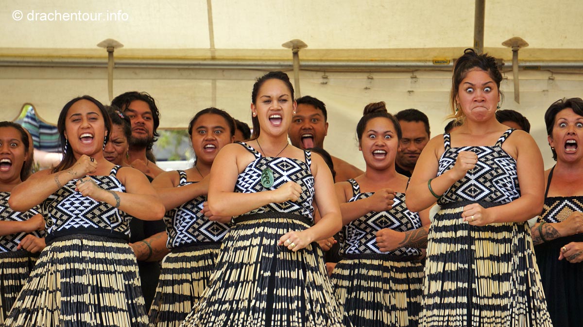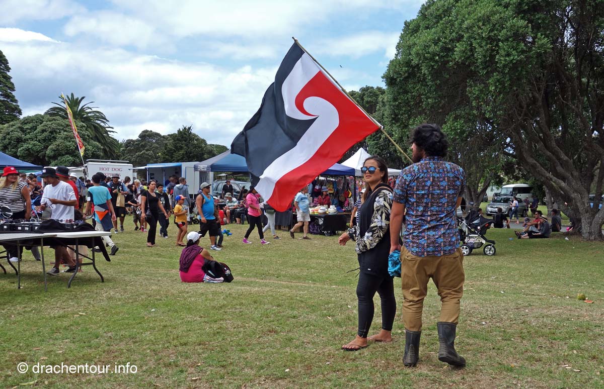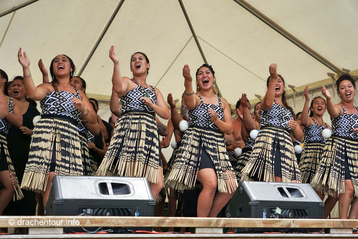 Für eine Nacht fuhren wir am kommenden Tag noch weiter in den Norden, dazu mehr unter „ Cap Reinga “. Auf dem Rückweg legten wir dann nochmals einen Zwischenstopp in Paihia ein, weil am 06.02. der Nationalfeiertag Neuseelands gefeiert wird. In Waitangi, einem kleinen Ort nur wenige Kilometer von Paihia entfernt wurde ein wichtiger Vertrag aufgesetzt, der 1840 von den Briten, sowie von den Maoris unterzeichnet wurde. Dieser Vertrag machte Neuseeland zu einem Teil des britischen Reiches und garantierte den Maoris auch die Rechte auf ihr Land und gab ihnen die Rechte von britischen Bürgern. Klingt sachlich sehr vernünftig und als eine gute Lösung, dennoch ergaben sich aus ihm sehr große Schwierigkeiten, weil die Übersetzungen in die unterschiedlichen Sprachen große Unterschiede aufweisen und folglich zu massiven Problemen führten. Im großen Ganzen kann man sagen, dass die Maoris in ihren Rechten benachteiligt wurden und auch heute noch um Anerkennung ihrer Kultur und ihrer Traditionen kämpfen. So gibt es an diesen Nationalfeiertag viel kulturelles Programm, wie zum Beispiel die Tänze der Maori Frauen. Dabei war es für uns total faszinierend zu sehen, wie die Tänzerinnen ihren Augen einen Wahnsinns Ausdruck verleihen, indem sie sie aufreißen und verdrehen. Oder auch die auf uns sehr befremdlich wirkenden Tätowierungen der Maori am ganzen Körper, die sie stolz zur Schau trugen. Der ganze Ort war in Aufruhr und wir haben es sehr genossen bei diesem Waitangi-Festival dabei zu sein, in der Hoffnung, dass die Maoris auch den gewünschten Stellenwert und die Anerkennung ihres Kulturgutes in der neuseeländischen Gesellschaft erreichen werden.