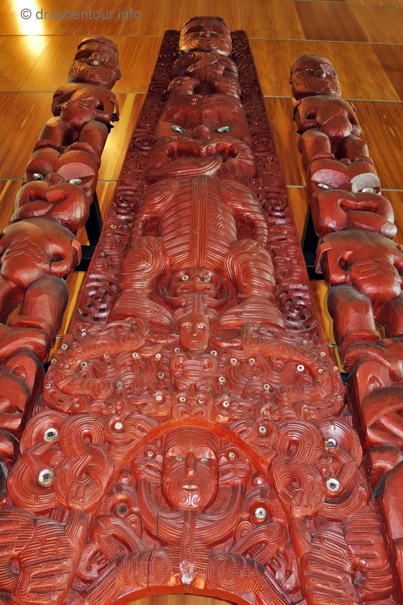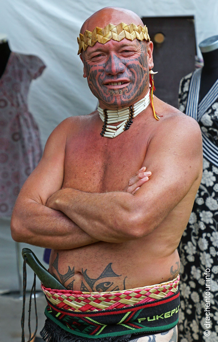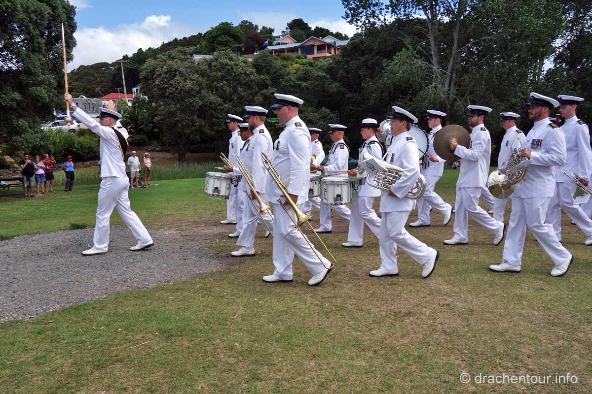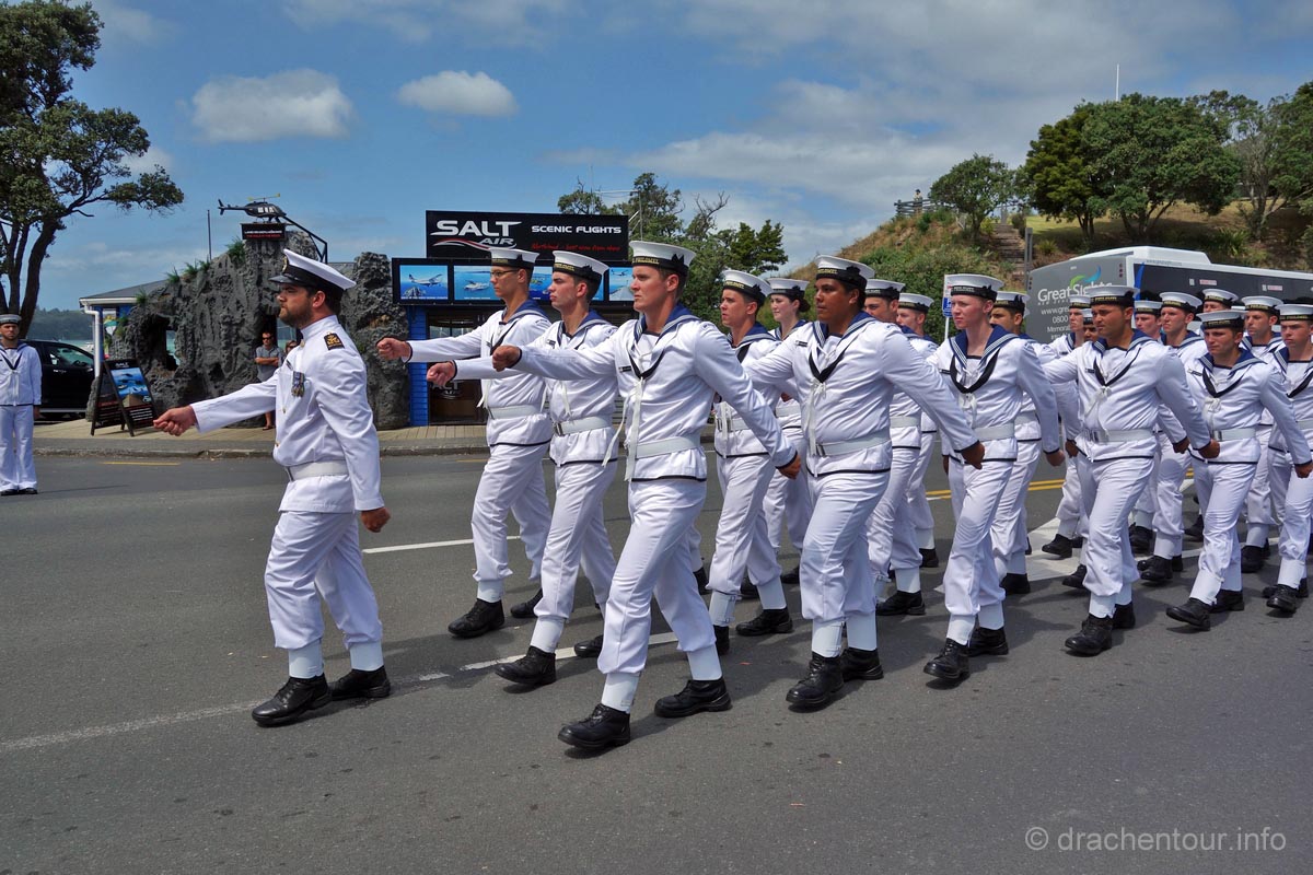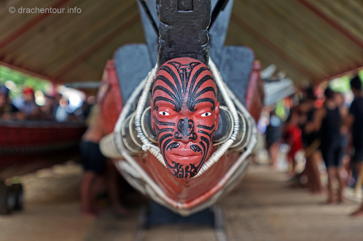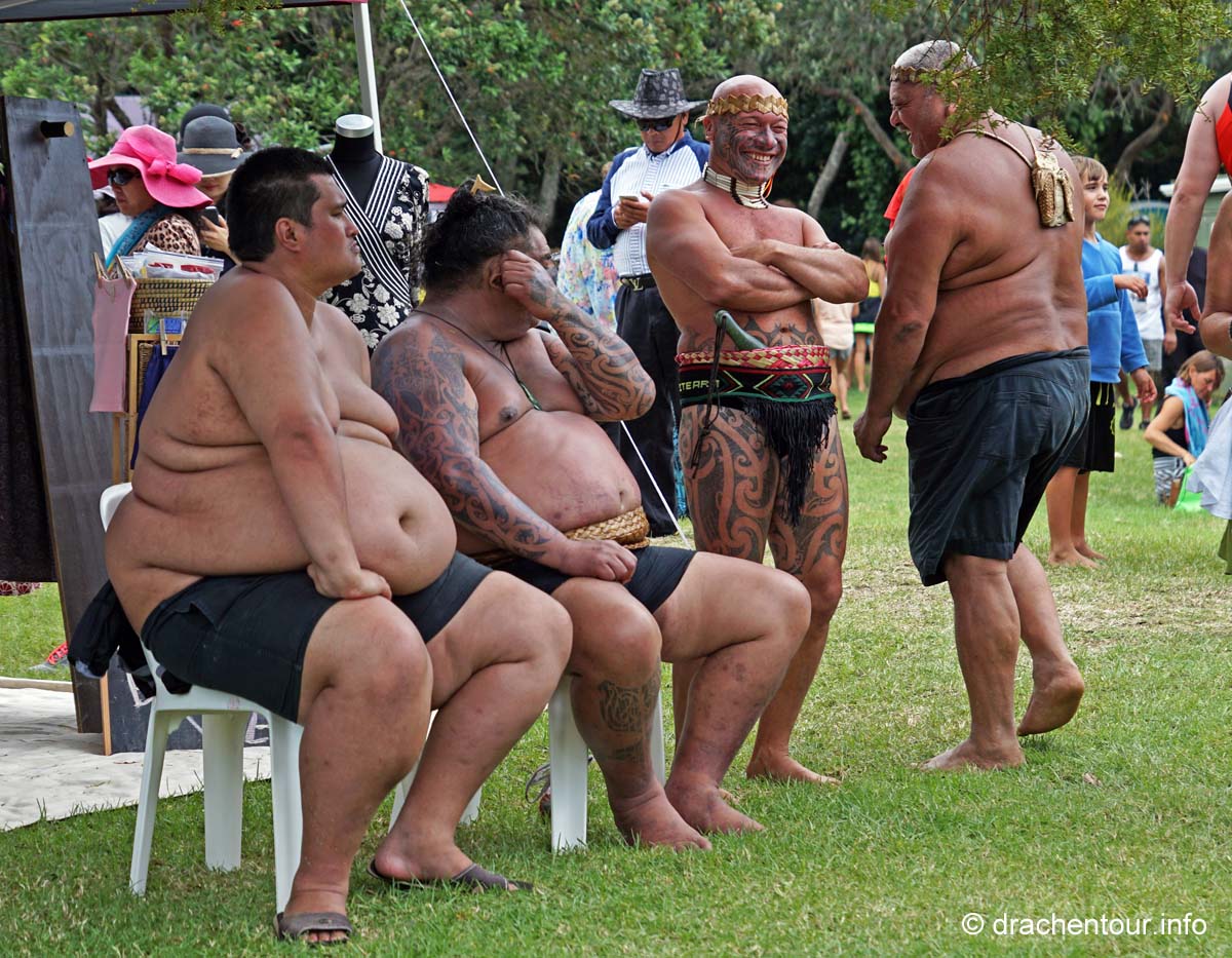 Für eine Nacht fuhren wir am kommenden Tag noch weiter in den Norden, dazu mehr unter „ Cap Reinga “. Auf dem Rückweg legten wir dann nochmals einen Zwischenstopp in Paihia ein, weil am 06.02. der Nationalfeiertag Neuseelands gefeiert wird. In Waitangi, einem kleinen Ort nur wenige Kilometer von Paihia entfernt wurde ein wichtiger Vertrag aufgesetzt, der 1840 von den Briten, sowie von den Maoris unterzeichnet wurde. Dieser Vertrag machte Neuseeland zu einem Teil des britischen Reiches und garantierte den Maoris auch die Rechte auf ihr Land und gab ihnen die Rechte von britischen Bürgern. Klingt sachlich sehr vernünftig und als eine gute Lösung, dennoch ergaben sich aus ihm sehr große Schwierigkeiten, weil die Übersetzungen in die unterschiedlichen Sprachen große Unterschiede aufweisen und folglich zu massiven Problemen führten. Im großen Ganzen kann man sagen, dass die Maoris in ihren Rechten benachteiligt wurden und auch heute noch um Anerkennung ihrer Kultur und ihrer Traditionen kämpfen. So gibt es an diesen Nationalfeiertag viel kulturelles Programm, wie zum Beispiel die Tänze der Maori Frauen. Dabei war es für uns total faszinierend zu sehen, wie die Tänzerinnen ihren Augen einen Wahnsinns Ausdruck verleihen, indem sie sie aufreißen und verdrehen. Oder auch die auf uns sehr befremdlich wirkenden Tätowierungen der Maori am ganzen Körper, die sie stolz zur Schau trugen. Der ganze Ort war in Aufruhr und wir haben es sehr genossen bei diesem Waitangi-Festival dabei zu sein, in der Hoffnung, dass die Maoris auch den gewünschten Stellenwert und die Anerkennung ihres Kulturgutes in der neuseeländischen Gesellschaft erreichen werden.