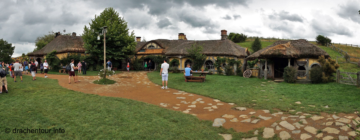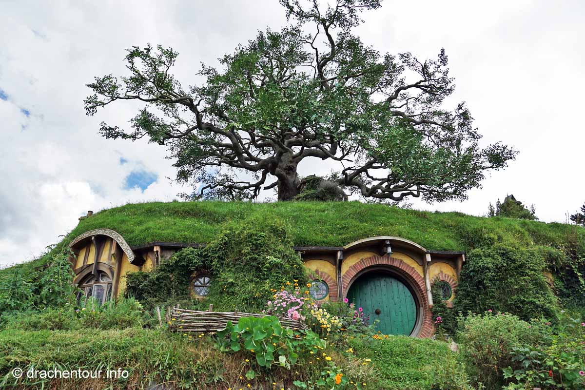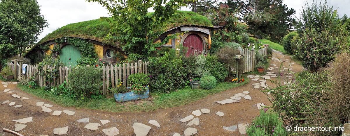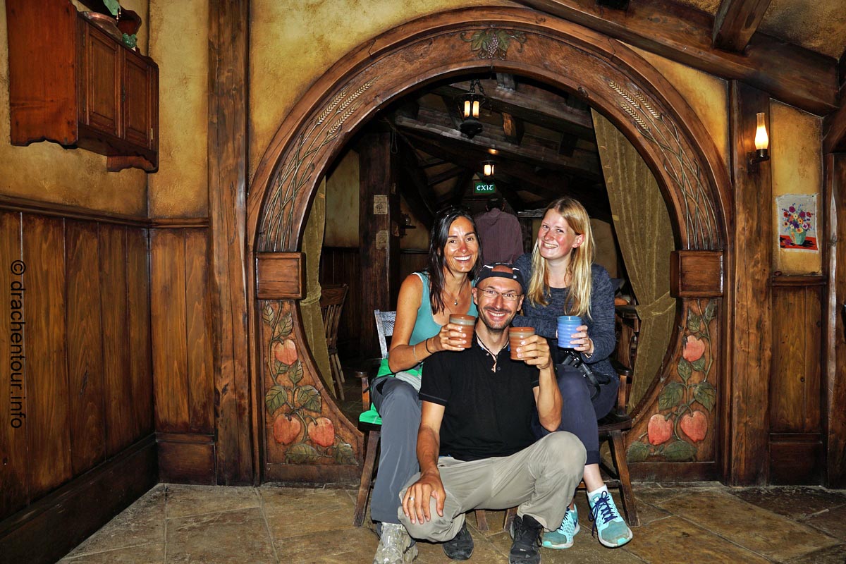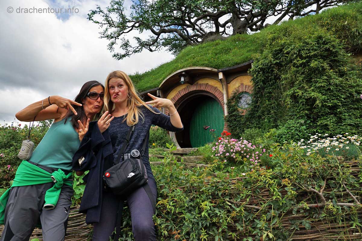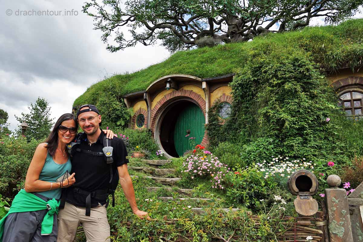 Diese Tatsache verhalf dem Örtchen zu einem hohen Bekanntheitsgrad und aus Matamata wurde " Hobbiton " und genau deswegen haben auch wir uns hierher aufgemacht um diese süßen und goldigen Erdhäuser, die sanft geschwungenen Hügel, den See, die Mühle und die Kneipe Green Dragon, sowie weitere Highlights aus den Filmen live zu sehen ! Klar, dass Marek komplett aus dem Häuschen war und sich sogar mal kurzzeitig verfahren hatte, aber selbst Seli und ich, die zur Spezies " Normale Hobbit Fans " gehören, freuten uns sehr auf die uns bevorstehende Tour. Wie immer hatten die Kiwis alles bestens organisiert und wir drei und noch ca. 40 weitere " Freaks " fuhren mit einem Bus zu den Filmsets. Mit jedem Kilometer, den wir dem Set näher kamen, veränderte sich die Landschaft sichtlich in Richtung Hobbit-Land - gigantisch - die Natur sieht hier wirklich so aus. Dann begann die eigentliche Führung, wir wurden von einer jungen Dame, die echt gute Nerven hatte, mitten durch das Hobbit-Land geführt. Wir kamen an vielen wunderbar bunt gestalteten Erdhäusern vorbei und mit viel Engagement und Liebe zum noch so winzigsten Detail wurde der ganze Ort dekoriert. Wir hatten das Gefühl, dass jeden Moment Frodo oder Bilbo Beutlin um die Ecke oder aus einer der Türen kommen könnte – toll ! Die Tour war absolut lohnend und wir drei waren hin und weg, wie realistisch die gesamten Kulissen in Stand gehalten werden, wir waren quasi für zwei Stunden zu Hobbits mutiert und fühlten uns wie in eine andere Welt gebeamt – spitzenmäßig !