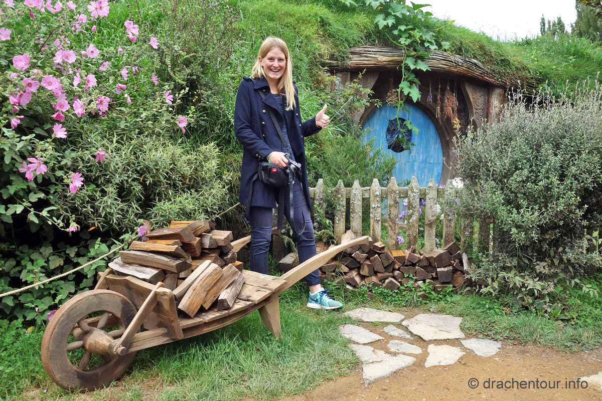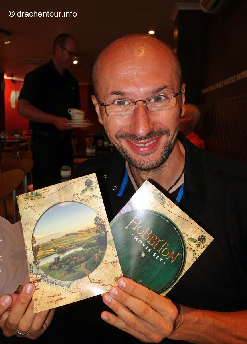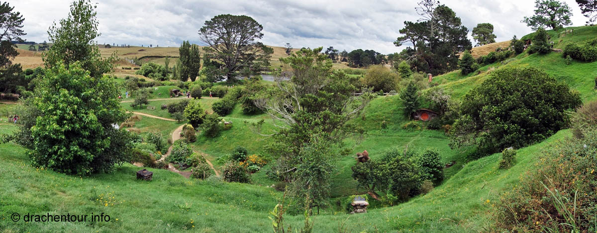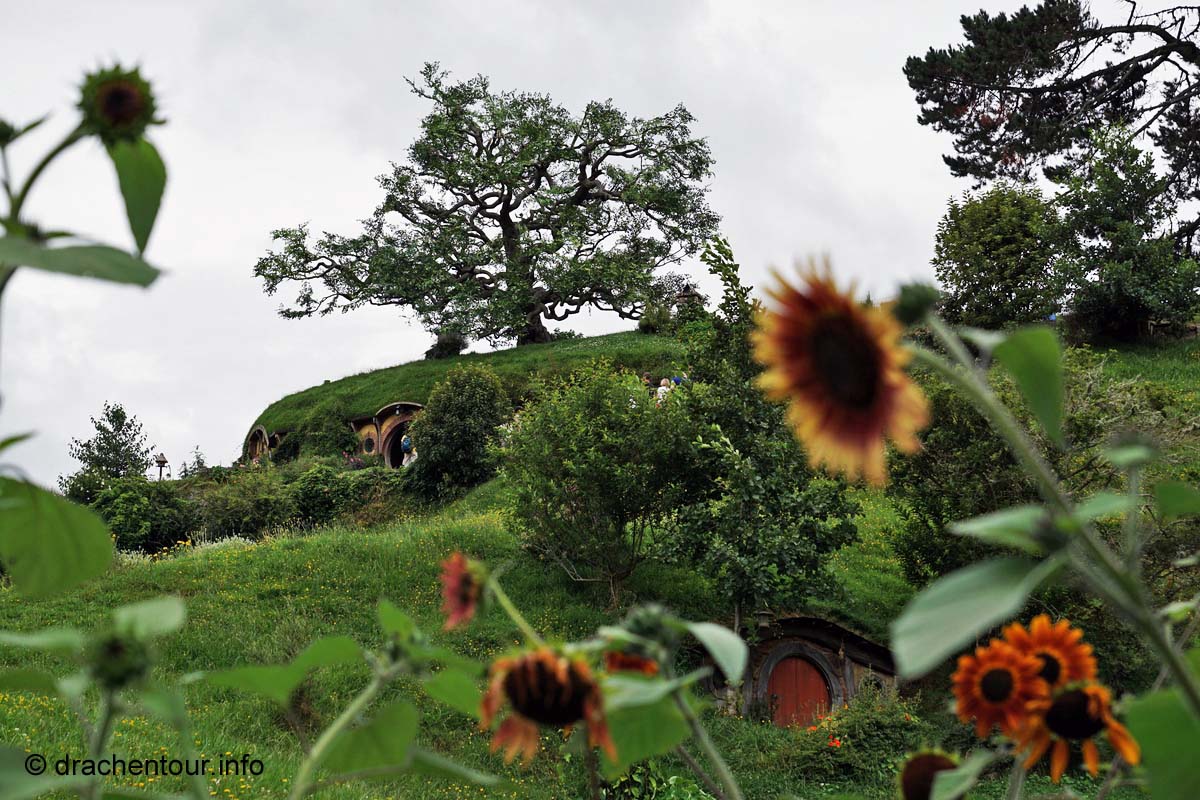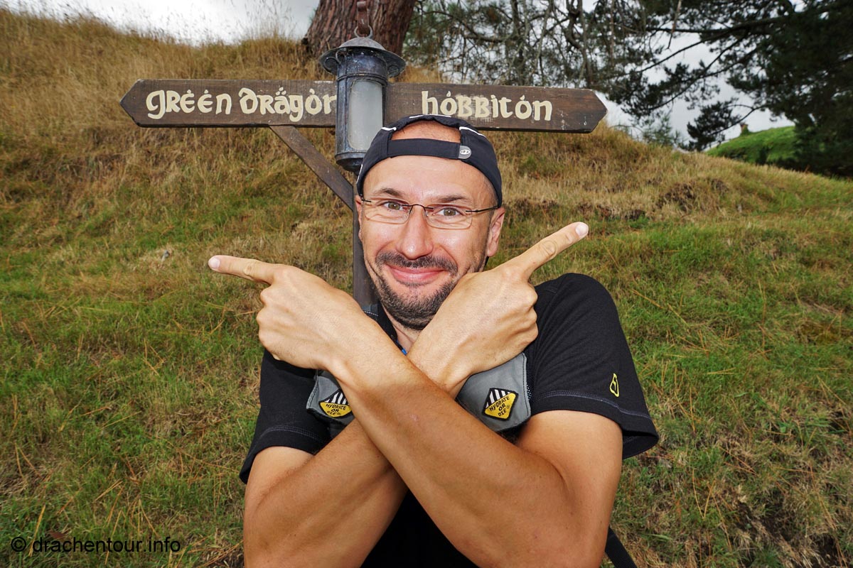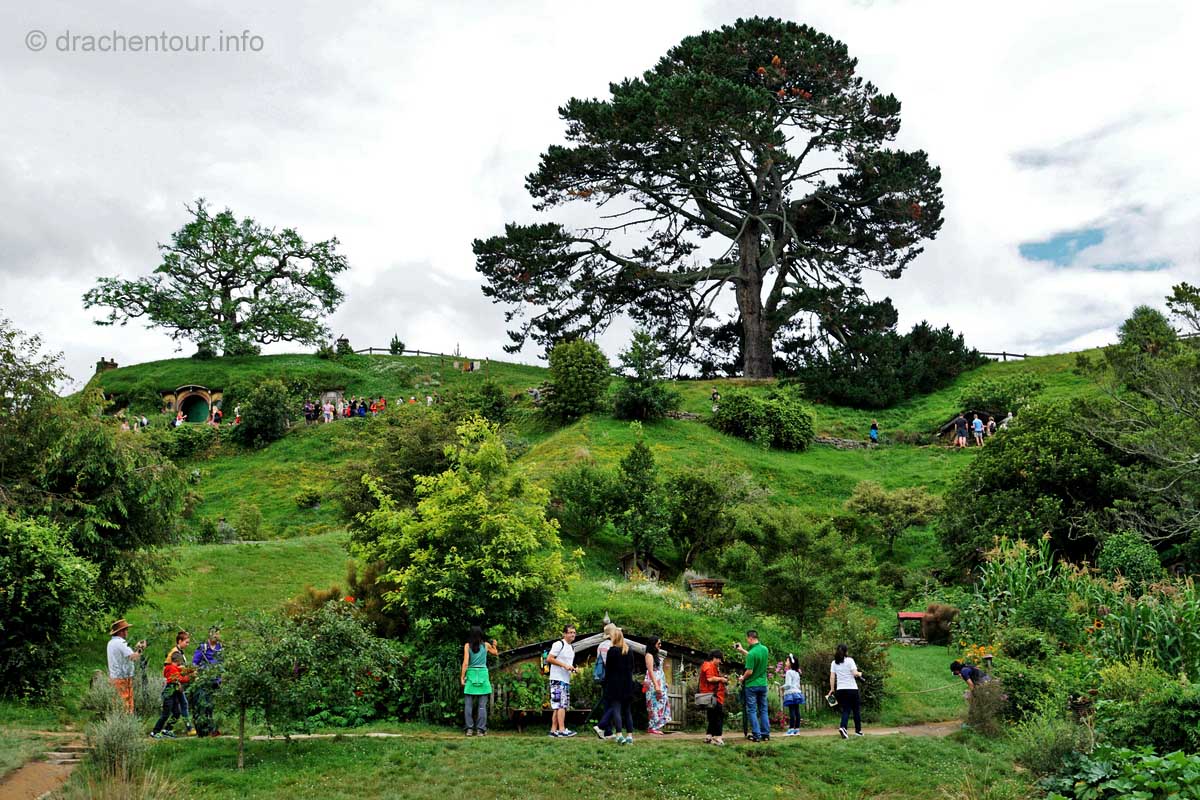 Diese Tatsache verhalf dem Örtchen zu einem hohen Bekanntheitsgrad und aus Matamata wurde " Hobbiton " und genau deswegen haben auch wir uns hierher aufgemacht um diese süßen und goldigen Erdhäuser, die sanft geschwungenen Hügel, den See, die Mühle und die Kneipe Green Dragon, sowie weitere Highlights aus den Filmen live zu sehen ! Klar, dass Marek komplett aus dem Häuschen war und sich sogar mal kurzzeitig verfahren hatte, aber selbst Seli und ich, die zur Spezies " Normale Hobbit Fans " gehören, freuten uns sehr auf die uns bevorstehende Tour. Wie immer hatten die Kiwis alles bestens organisiert und wir drei und noch ca. 40 weitere " Freaks " fuhren mit einem Bus zu den Filmsets. Mit jedem Kilometer, den wir dem Set näher kamen, veränderte sich die Landschaft sichtlich in Richtung Hobbit-Land - gigantisch - die Natur sieht hier wirklich so aus. Dann begann die eigentliche Führung, wir wurden von einer jungen Dame, die echt gute Nerven hatte, mitten durch das Hobbit-Land geführt. Wir kamen an vielen wunderbar bunt gestalteten Erdhäusern vorbei und mit viel Engagement und Liebe zum noch so winzigsten Detail wurde der ganze Ort dekoriert. Wir hatten das Gefühl, dass jeden Moment Frodo oder Bilbo Beutlin um die Ecke oder aus einer der Türen kommen könnte – toll ! Die Tour war absolut lohnend und wir drei waren hin und weg, wie realistisch die gesamten Kulissen in Stand gehalten werden, wir waren quasi für zwei Stunden zu Hobbits mutiert und fühlten uns wie in eine andere Welt gebeamt – spitzenmäßig !