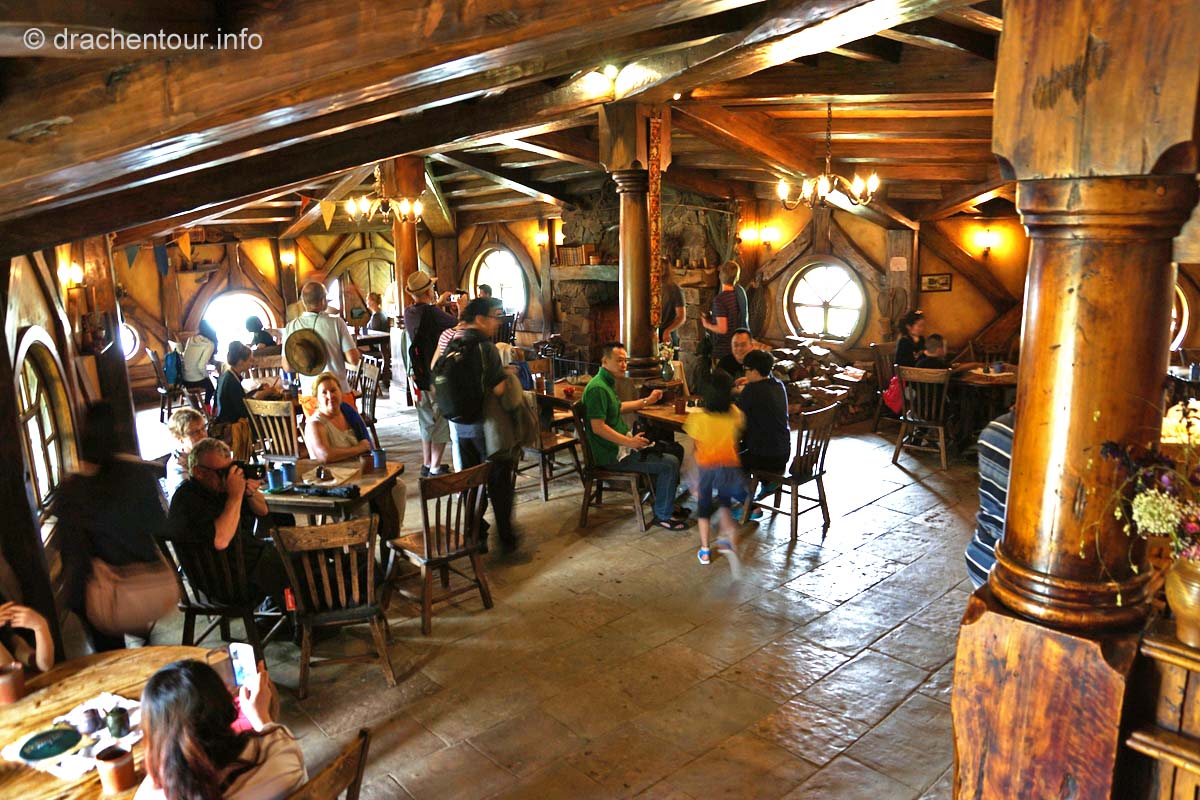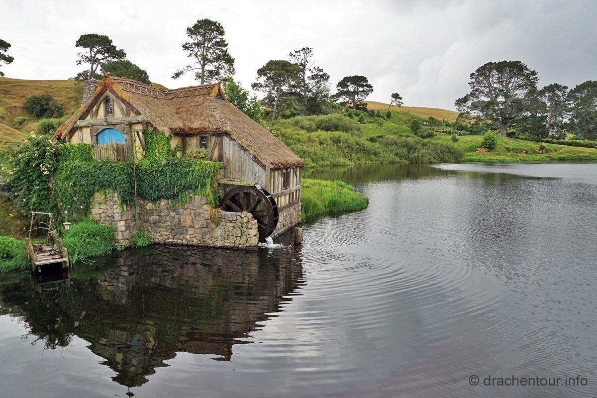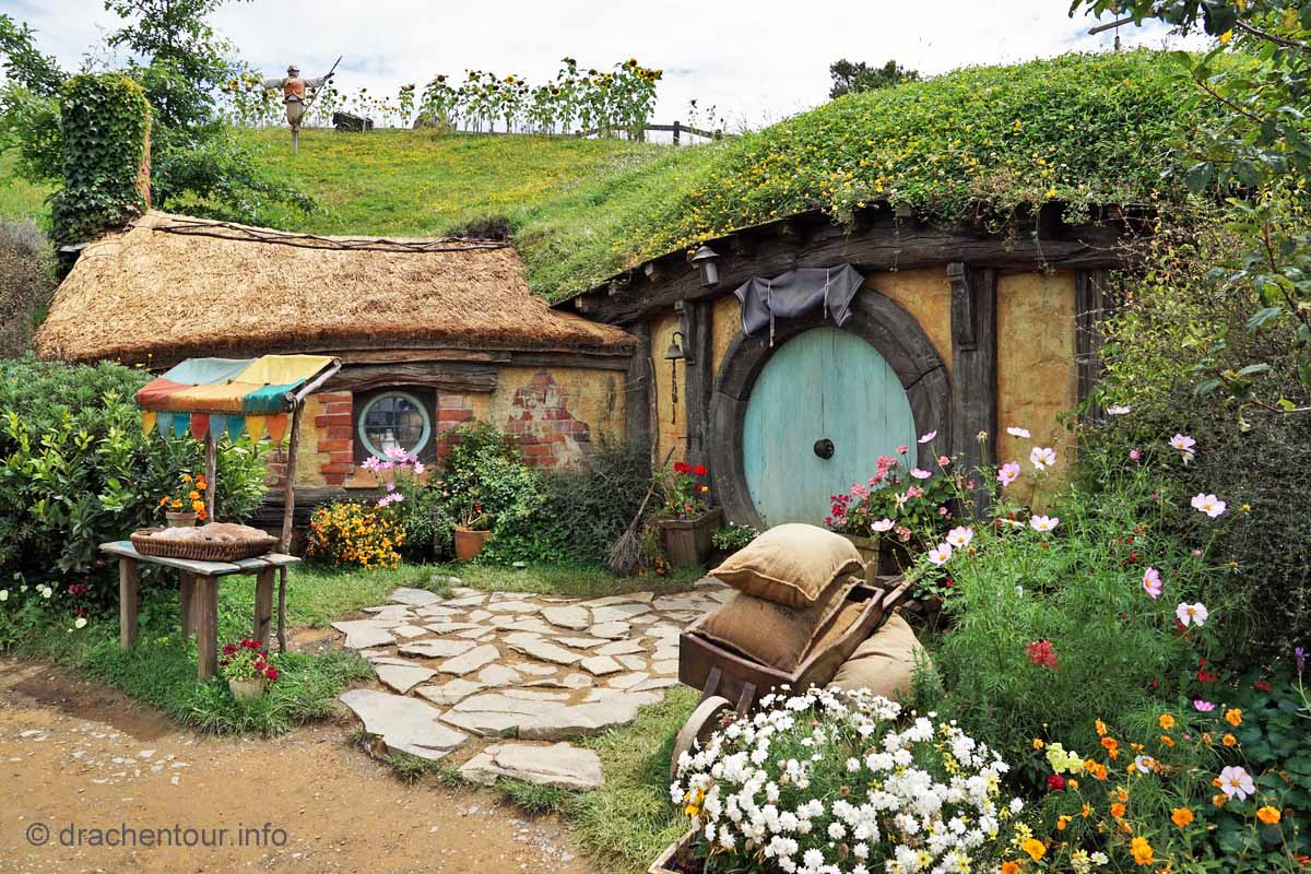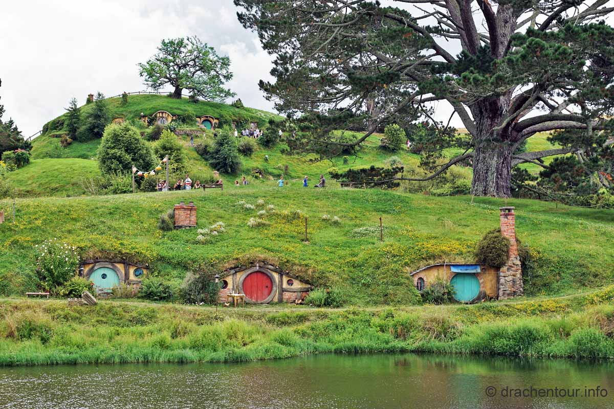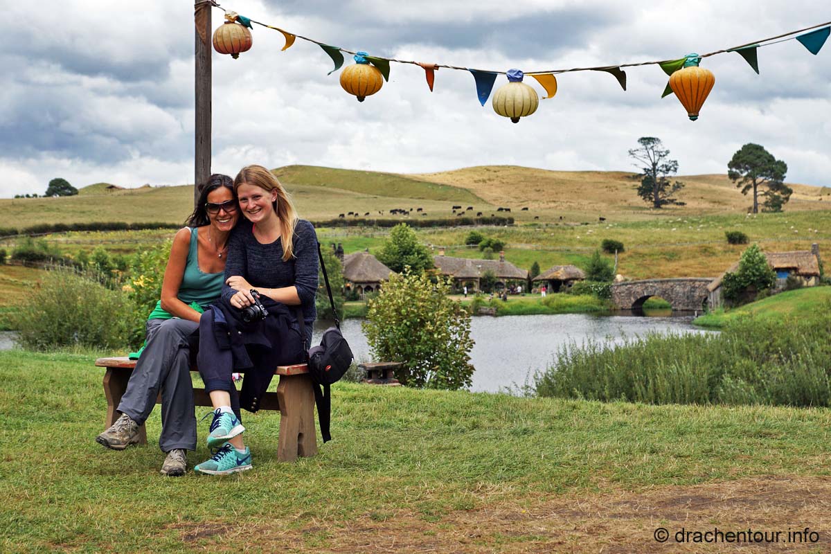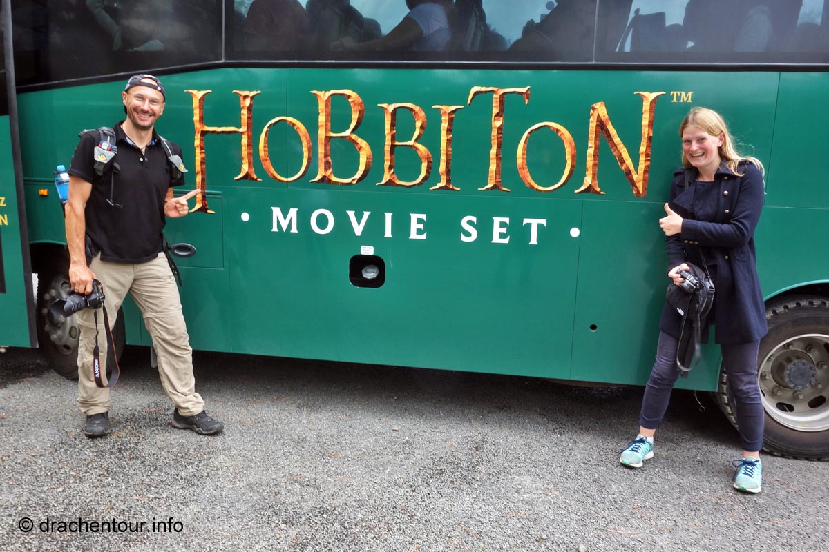 Diese Tatsache verhalf dem Örtchen zu einem hohen Bekanntheitsgrad und aus Matamata wurde " Hobbiton " und genau deswegen haben auch wir uns hierher aufgemacht um diese süßen und goldigen Erdhäuser, die sanft geschwungenen Hügel, den See, die Mühle und die Kneipe Green Dragon, sowie weitere Highlights aus den Filmen live zu sehen ! Klar, dass Marek komplett aus dem Häuschen war und sich sogar mal kurzzeitig verfahren hatte, aber selbst Seli und ich, die zur Spezies " Normale Hobbit Fans " gehören, freuten uns sehr auf die uns bevorstehende Tour. Wie immer hatten die Kiwis alles bestens organisiert und wir drei und noch ca. 40 weitere " Freaks " fuhren mit einem Bus zu den Filmsets. Mit jedem Kilometer, den wir dem Set näher kamen, veränderte sich die Landschaft sichtlich in Richtung Hobbit-Land - gigantisch - die Natur sieht hier wirklich so aus. Dann begann die eigentliche Führung, wir wurden von einer jungen Dame, die echt gute Nerven hatte, mitten durch das Hobbit-Land geführt. Wir kamen an vielen wunderbar bunt gestalteten Erdhäusern vorbei und mit viel Engagement und Liebe zum noch so winzigsten Detail wurde der ganze Ort dekoriert. Wir hatten das Gefühl, dass jeden Moment Frodo oder Bilbo Beutlin um die Ecke oder aus einer der Türen kommen könnte – toll ! Die Tour war absolut lohnend und wir drei waren hin und weg, wie realistisch die gesamten Kulissen in Stand gehalten werden, wir waren quasi für zwei Stunden zu Hobbits mutiert und fühlten uns wie in eine andere Welt gebeamt – spitzenmäßig !