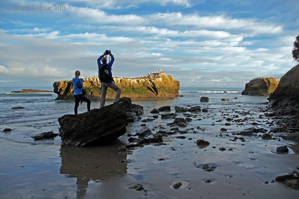 Wie bereits versprochen, starteten wir heute eine spezielle Mission, und dass sehr früh am Morgen, denn bereits um 4 Uhr klingelte unser Wecker !!! Schlaftrunken ( außer natürlich unserem Fahrer Marek ) fuhren wir noch ein paar Kilometer bis zum Ende der Straße, parkten unsere Juicy und machten uns zu Fuß auf den Weg. Es herrschte noch finstere Nacht, weshalb wir uns mit Stirn - und Taschenlampen ausrüsteten, und dass war auch sehr notwendig, denn der Weg war sehr unbequem und es ging über Steine und echt große Felsen. Unser Ziel war das Cape Kidnappers, von dem uns noch 11 km trennten, dennoch nahmen wir jede Anstrengung auf uns und kletterten sogar an manchen schwierigen Passagen über Felsbrocken oder wichen ins Wasser aus, es war echt ein richtiges Abenteuer. Dicht an den steil empor ragenden Kalkstein-Klippen kamen wir langsamen, aber sicheren Schrittes unserem begehrten Ziel näher. Wir wollten es unbedingt schaffen zum Sonnenaufgang am Cape zu sein, denn genau dann konnten wir Zeugen eines einzigartigen Wunders der Natur werden. Und wenn die Wanderung auch sehr anstrengend war und wir einige Male überlegten, ob wir umdrehen sollten, weil der Weg sich so dermaßen in die Länge zog, hielten wir letztendlich durch und sollten dafür großartig beschenkt werden. Da waren sie, der Grund dieser Strapazen, Tausende von krächzenden Tölpeln ! Vor uns, hinter uns, rechts und links einfach überall und wir waren mittendrin ! Das alleine ist schon Hammer und als dann noch dieses warme und weiche Licht der aufgehenden Sonne hinzukam, konnten wir unser Glück fast nicht fassen - so unglaublich friedlich und so faszinierend ! Mit voller Hingabe fotografierten und beobachteten wir diese schönen Tiere. Beim genaueren betrachten konnten wir sogar sehen, dass einige Pärchen ihre Jungen groß zogen. In dieser einzigartigen und wunderschönen Atmosphäre durften wir die größte Tölpelkolonie der Welt ( die man von Land beobachten kann ) erleben - und wir waren die einzigsten menschlichen Wesen :-). Wir verloren uns so in der Zeit, dass wir erst merkten als wir mit unseren Füßen im Wasser standen, dass wir dringend zurückkehren sollten, denn die Flut setzte langsam wieder ein und unser Weg könnte dann vom Meer abgeschnitten werden. Also nahmen wir Abschied von einem der tollsten Orte und Momente der Welt und machten uns auf den Heimweg. Erst jetzt, bei Tageslicht, sahen wir diese riesigen Klippen, wie gigantisch hoch und weiß sie sind - toll. Der Rückweg war dann auch wieder ganz schön lang und wir waren froh und ziemlich hungrig als wir endlich unsere Juicy erreichten. So suchten wir ein nettes Plätzchen am Meer und frühstückten zunächst mal in aller Ruhe, denn jeder von uns brauchte nun etwas Zeit um die wunderbaren und unvergleichlichen Eindrücke zu verarbeiten - was für ein toller Ausflug !