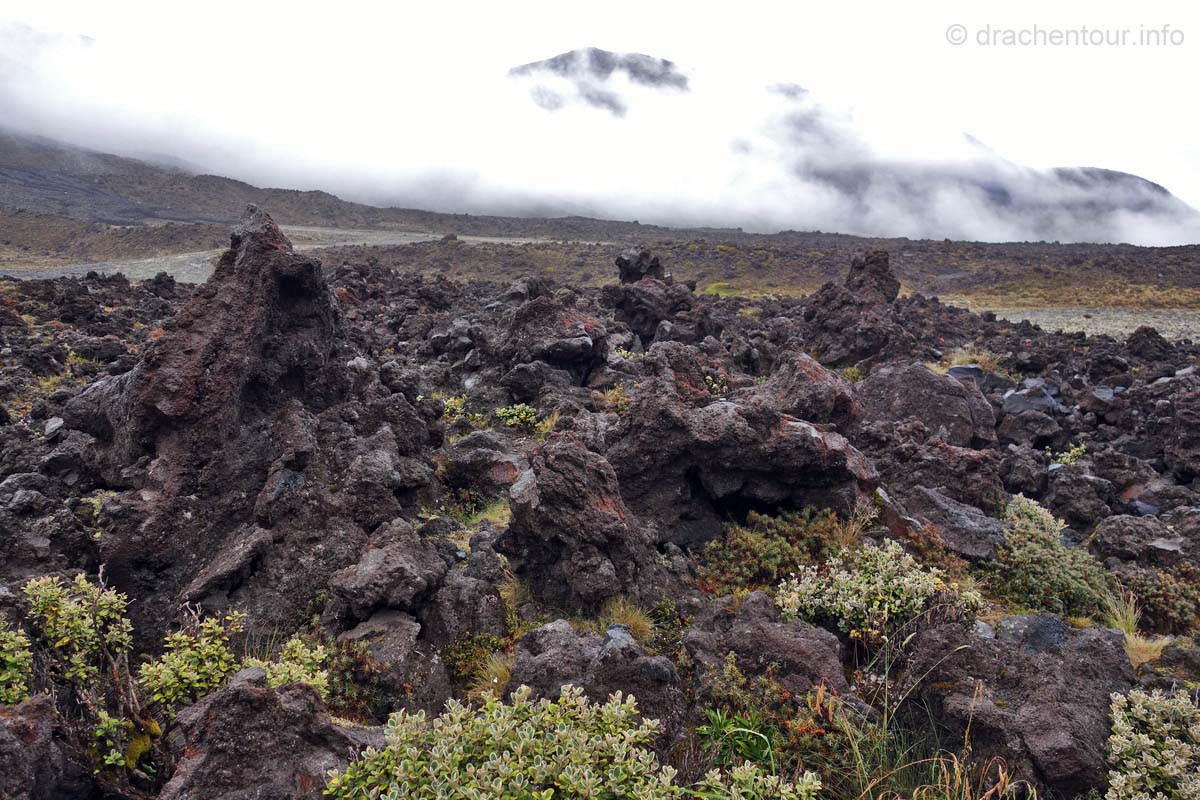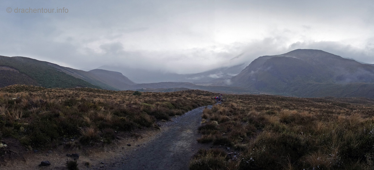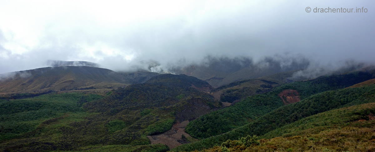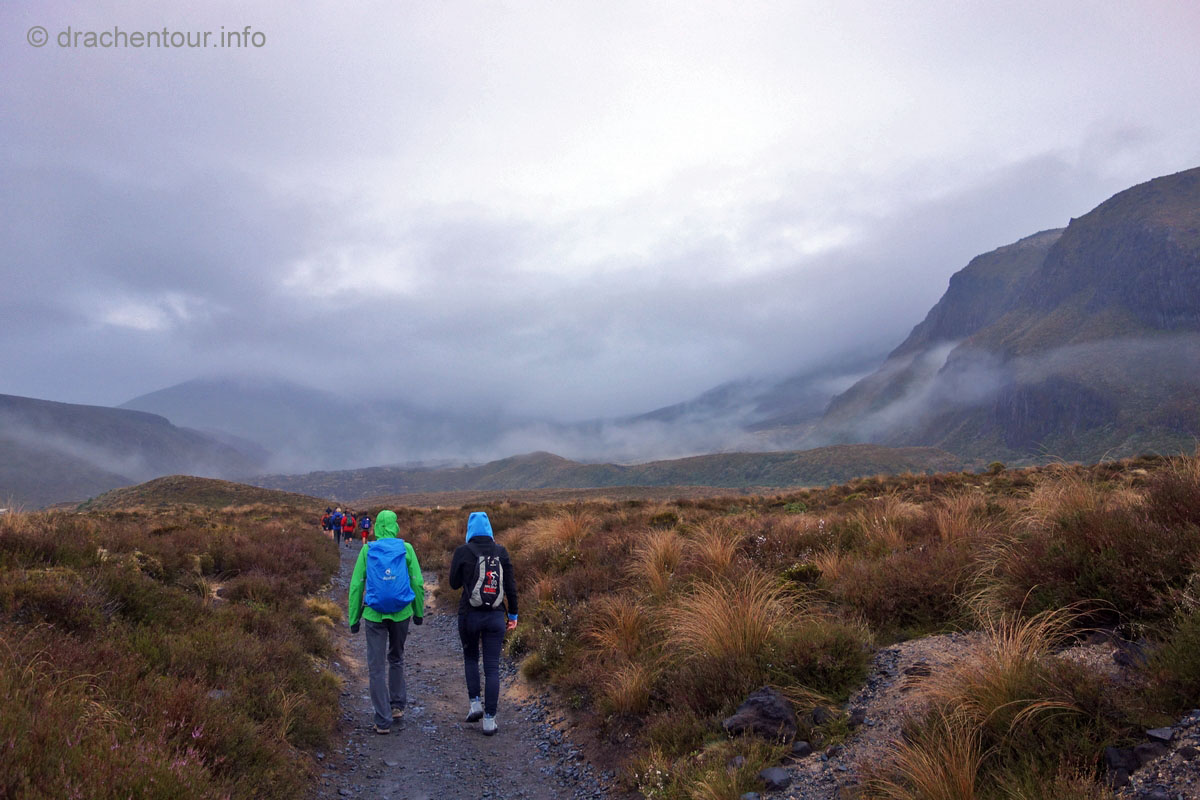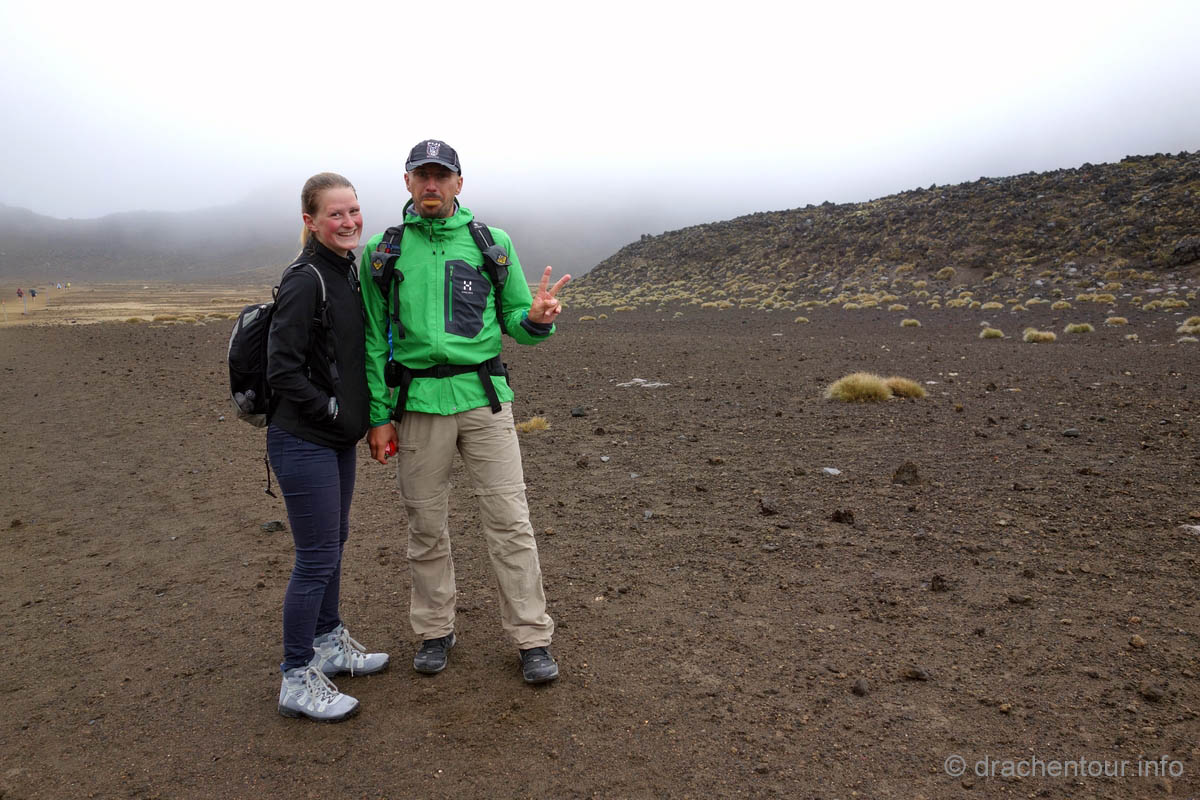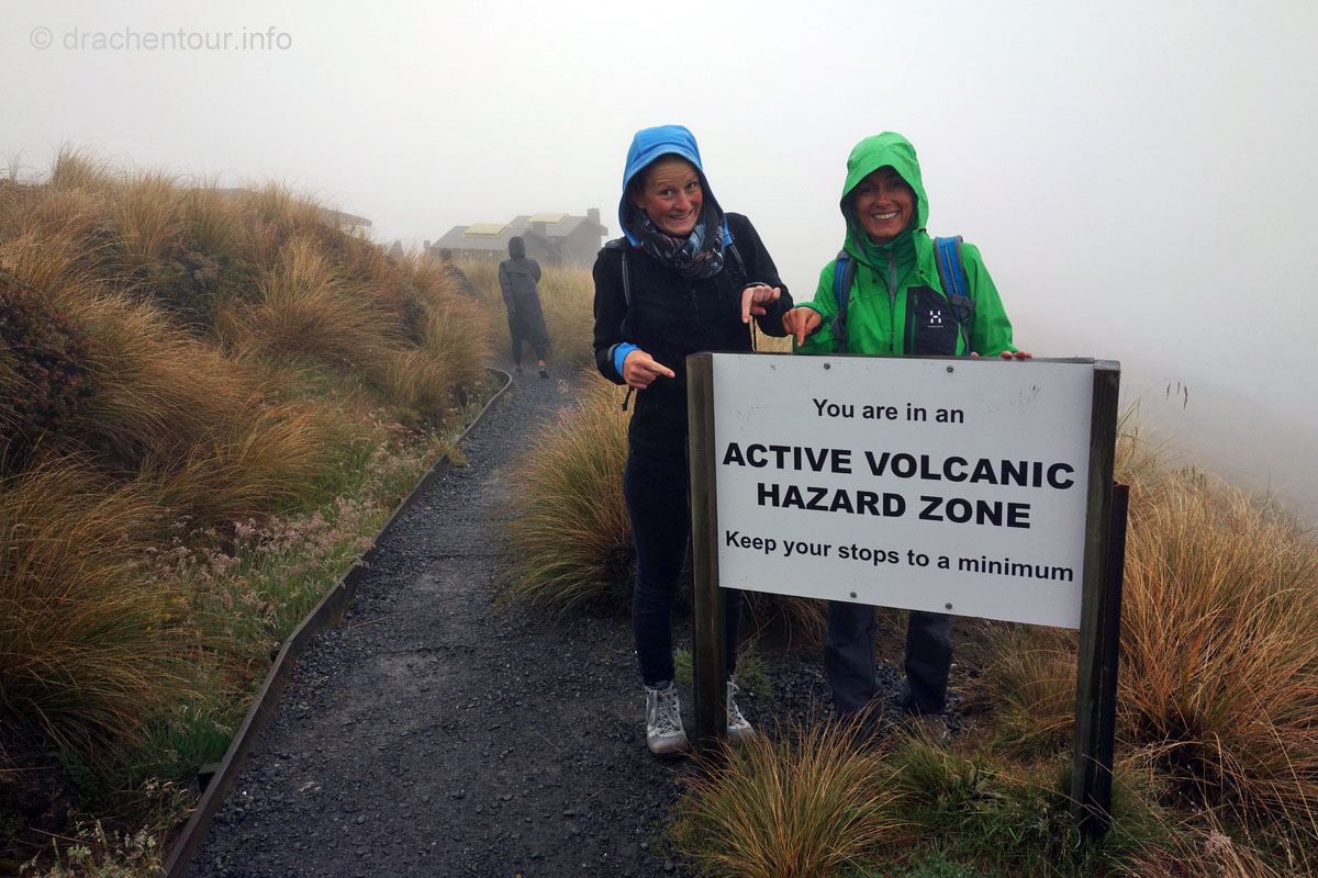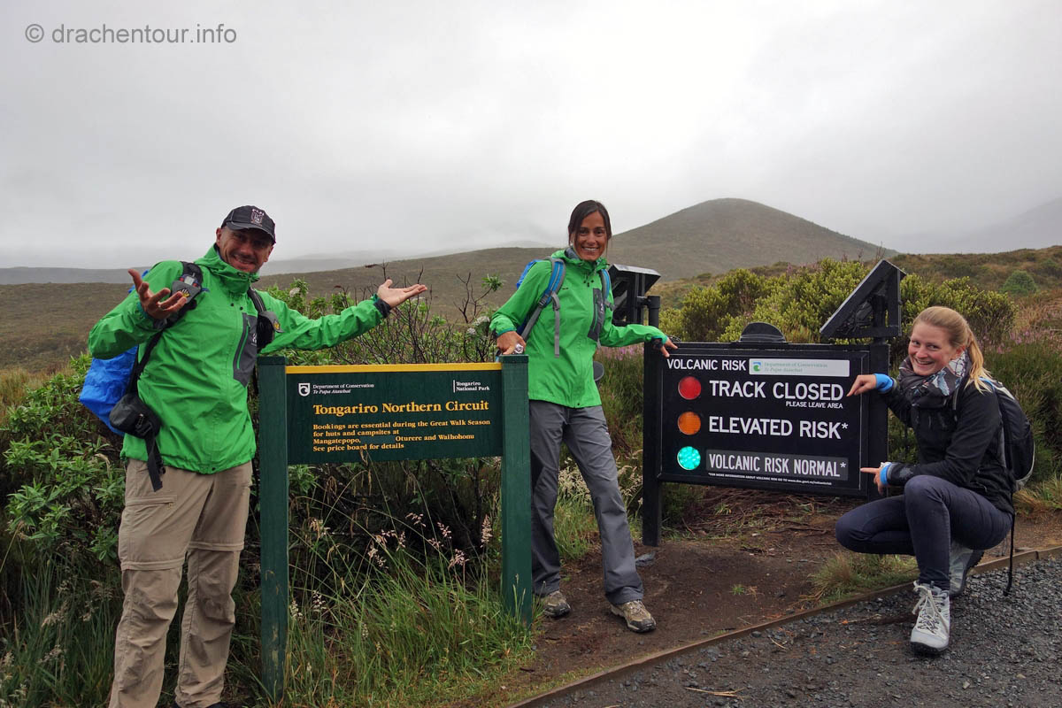 Mal wieder sind wir mit dem Klingeln des Weckers aufgestanden: 5 Uhr stand auf dem Display - ja sag mal, sind wir denn noch im Urlaub:-) ! ? Natürlich hatte das wieder einen tieferen Sinn, wir unternahmen eine der schönsten 1-Tages-Wanderungen, die uns unser Planet zu bieten hat. Die Alpine Crossing Tour liegt im ältesten Nationalparks Neuseeland, im Tongariro Nationalpark. Hier sind Neuseelands Vulkane zuhause ( ein besonderer Leckerbissen für mich – jipii ! ). Zunächst fuhren wir mit unserer Juicy zu einem Parkplatz, auf dem bereits unser Shuttlebus und die weiteren Mitfahrer geduldig auf uns warteten, denn wir waren 15 Minuten zu spät – ups ! Mit dem Bus wurden wir zum Startpunkt der Wanderung gebracht. Leider war der Himmel total mit dichten Wolken bedeckt und die Vulkanberge versteckten sich ebenfalls hinter schwarzen dichten Wolken und zu allem Elend regnete es auch noch - so ein Ärger ! Wir machten uns gegenseitig Mut, zogen unsere Regenklamotten an und vesperten unsere Frühstücks-Weckle und los ging´s. Positiv ist eigentlich nur, dass die Ampel am Beginn der Tour grün anzeigte und das vulkanische Risiko als " normal " eingeschätzt werden kann - wenigstens was ! Ein wenig missmutig gingen wir dann die ersten Schritte, zum Einen wegen der Regenwolken und zum Anderen hatten wir auch noch schwere Beine von der gestrigen Wanderung !