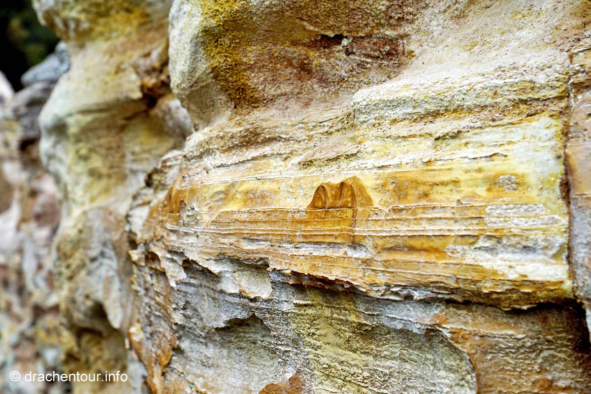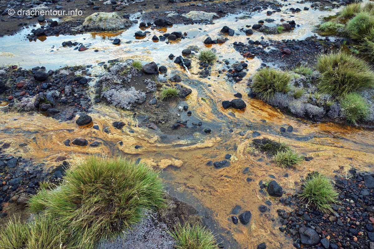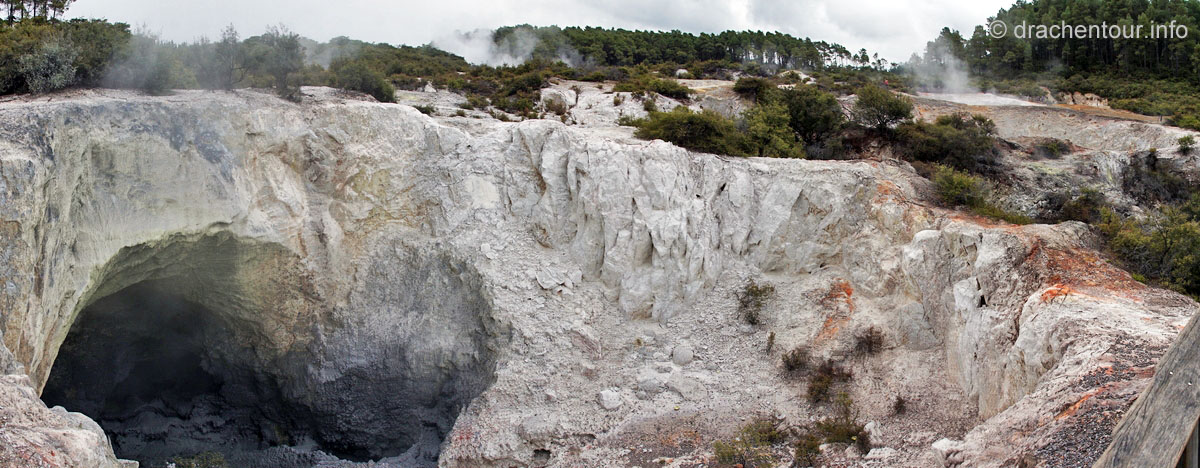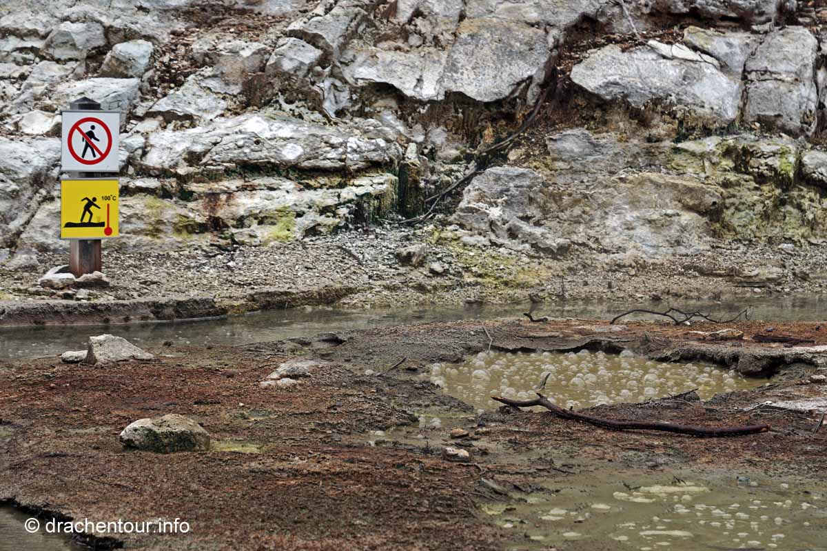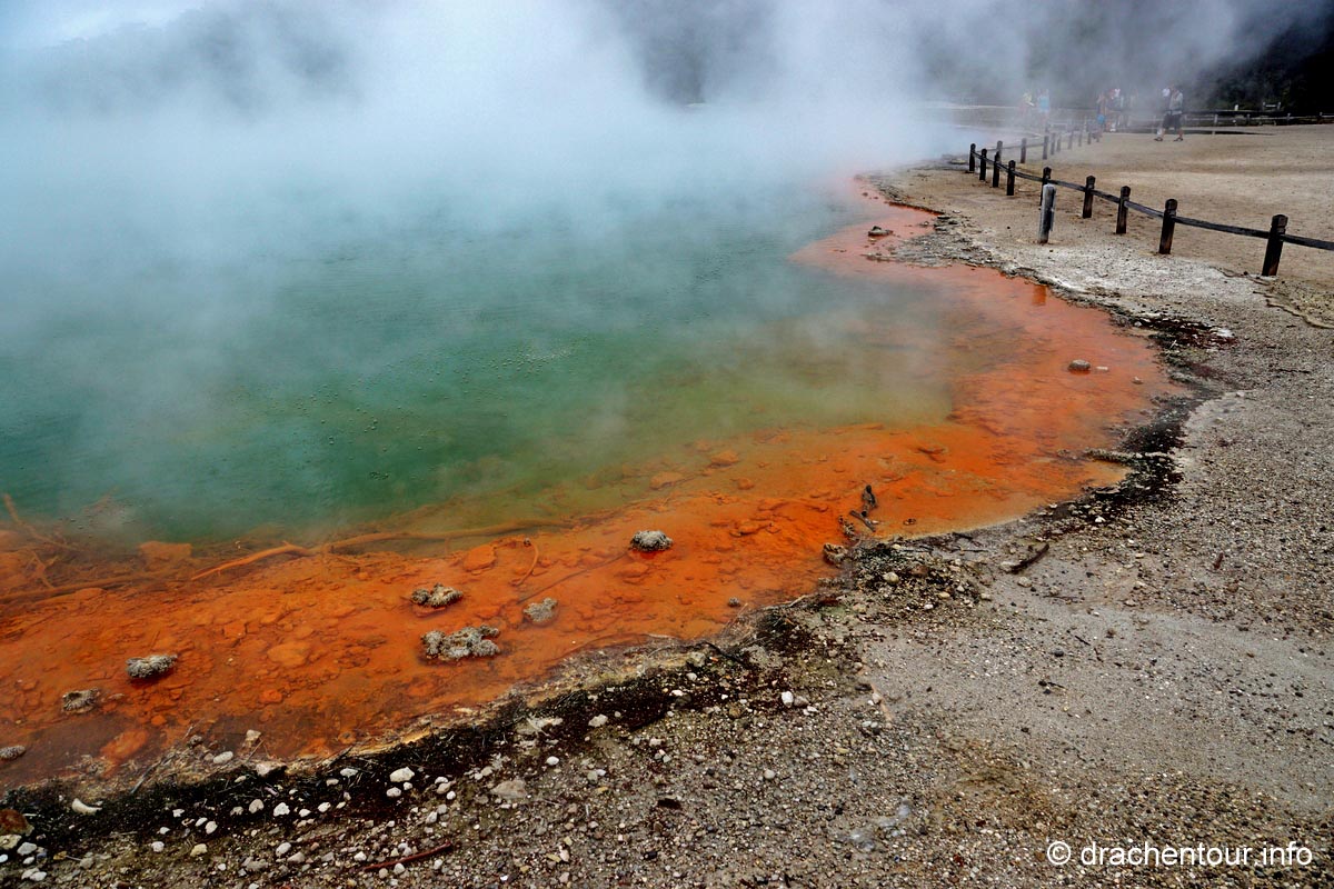 Unser erstes Highlight war der Lady Knox Geysir, auf sie ist Verlass, denn sie entfaltete ihre ganze Pracht jeden Morgen um 10:15 Uhr - pünktlich. Das ist jedoch kein natürlicher Prozess, diesem Schauspiel wird nachgeholfen, indem ein Parkmitarbeiter ein auf Lauge basierendes Mittel in den Schlund schüttet, woraufhin der Geysir überschäumt und dann eine bis zu 20 Meter hohe Wasserfontäne gen Himmel ausstößt. Das Ganze ist ein richtiger, bis ins kleinste Detail inszenierter " Touri-Nep " und damit alle alles gut mitverfolgen können, wurde um den Geysir ein kleines Amphitheater errichtet - total überdreht. Wir kamen uns sehr fehl am Platz vor und die ganze Aktion hatte doch etwas sehr befremdliches für uns und schoss unserer Meinung komplett am Ziel vorbei. Anschließend fuhren wir wieder zum eigentlichen Park, denn die Lady lag etwas außerhalb und schauten uns die restlichen Attraktionen an, die hoffentlich natürlicher sind. Neben dem beißenden Geruch sind die Farben, die den Boden und die Seen prägen beeindruckend. Sie kommen von Metallen und Mineralien, die hier aus dem Erdinneren an die Oberfläche kommen. Die bunte Farbpalette reicht von Gelb (Schwefel), Orange (Stibnit und Realgar), Grün (Orpiment), über Violett (Permanganat) bis hin zu Rot und Braun (Eisenoxid) und das Schwarz des Kohlenstoffes, wahnsinnig grandios, was die Natur so alles zustande bringt. Auf einem sehr gut angelegten Rundweg konnten wir das alles bestaunen. Besonders hervorzuheben ist der bekannte Champagne-Pool, den wir aufgrund des stinkenden Dampfes fast nicht zu sehen bekamen. Er besticht durch sein beeindruckendes dunkelgrünes, heißes Wasser und im Kontrast dazu das orangefarbene Ufer - komplett surreal ! Heiß ist dabei nicht übertrieben, denn überall im Park stehen Schilder mit dem Hinweis, die angelegten Pfade und Stege nicht zu verlassen, da selbst der Boden 100 Grad Celsius heiß ist !!! Zwar sind einige Reisegruppen unterwegs, doch wir nahmen uns viel Zeit und hatten somit die Möglichkeit diese außergewöhnlichen Geschehnisse allein, oder fast alleine in Ruhe bewundern zu können. Wir liefen an kargen Felsen, Sinterterrassen, Erdspalten und Höhlen vorbei aus denen es rauschte und laut gurgelte. Doch irgendwann hatten wir im wahrsten Sinne des Wortes die Nase voll und setzten uns in das Café des Parks und erholten uns bei einem Cappuccino von den beißenden Gerüchen.