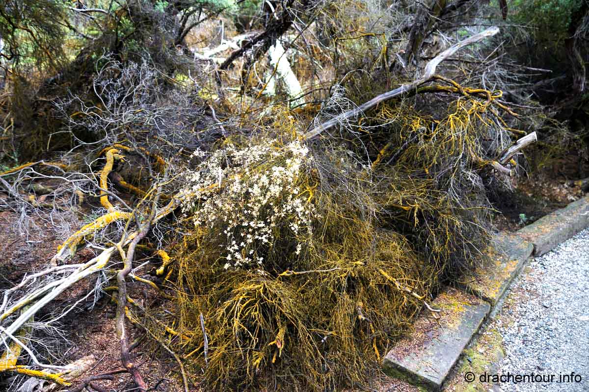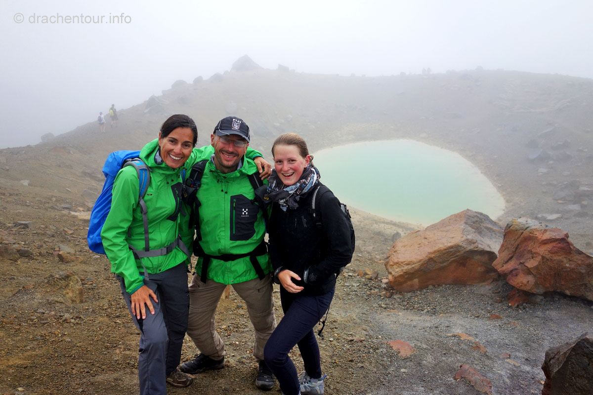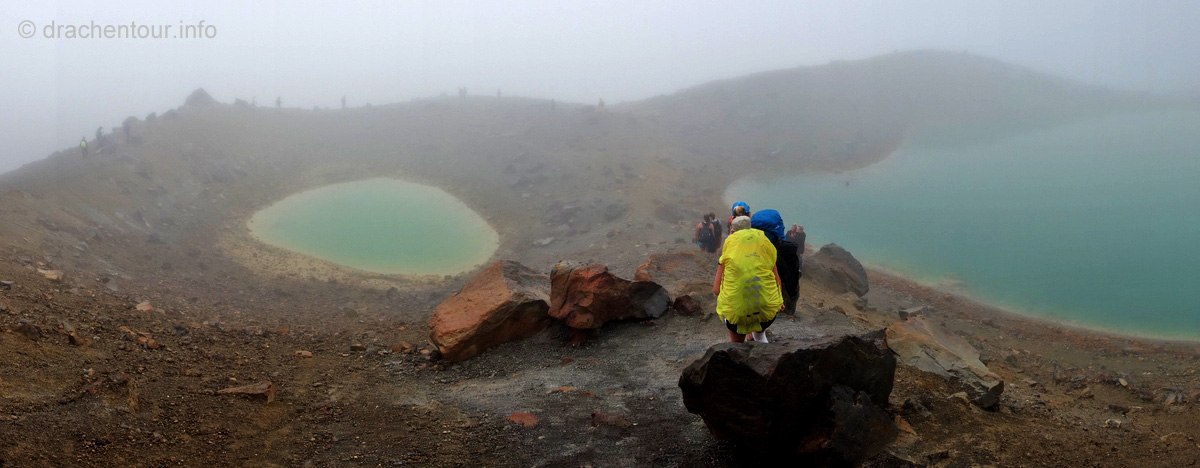 Dennoch konnten wir uns langsam wieder amüsieren, wie zum Beispiel als wir die schlecht ausgerüsteten Touris, zum Teil mit Sandalen, kurzen Hosen und Trägershirts, sahen ! So kämpften wir uns im Nebel langsam nach oben und hatten leider überhaupt gar keine Aussicht auf die schön geformten Vulkankegel, die Mondlandschaft mit Kratern und die teils vegetationslose Landschaft. Die erste Etappe führte uns über die "Devil` Staircase" ( „ Stairways to heaven “ wäre uns da doch lieber :-) ) zum South Crater. Wir befinden uns direkt am Mount Ngauruhoe, dem Schicksalsberg aus "Herr der Ringe", allerdings stehen wir wie vor einer undurchdringlichen weisen Wand und sehen - rein gar nichts. Nochmals ging es dann steil zum „ Red Crater “ nach oben und wir sind auf 1886 Meter angelangt und der Wind pfeift uns um die Ohren. Weiter geht´s an den Bergen Mount Tongariro und dem Mount Ruapehu ( ist etwas weiter entfernt ) vorbei - von denen wir leider auch nichts sehen können - zu den schillernden „ Esmerald Lakes “. Und in der Tat können wir auch bei diesem Nebelwetter deutlich das Grün und das Blau der Seen erkennen -jipii, welch Hoffnungsschimmer ! Hier ist auch der Schwefelgeruch am intensivsten und überall dampft es aus der Erde. Nach diesem besonderen Blick begannen wir mit dem langen Abstieg und der Regen wurde immer schlimmer, vorbei ging es am „ Blue Lake “ und die Vegetation nahm langsam aber stetig zu. Eine gefühlte Ewigkeit schlängelte sich der Weg hinab und es hörte - ganz zu unserer Freude - auf zu regnen und wir konnten wenigstens einen kleinen Eindruck der phänomenalen Landschaft erhaschen. Allmählich geht es in den Regenwald hinein und der Weg windet sich und ein Ende ist nicht abzusehen. Endlich erkennen wir zwischen den Bäumen die ersten Autos, wir haben es geschafft der Parkplatz, auf dem unsere Juicy wartete ist erreicht. Wir haben die fast 20 km in einer Rekordzeit von nur 6 Stunden geschafft, aber auch nur deshalb, weil das Wetter uns nicht zum Verweilen eingeladen hat ! Geschafft waren wir allerdings auch !!