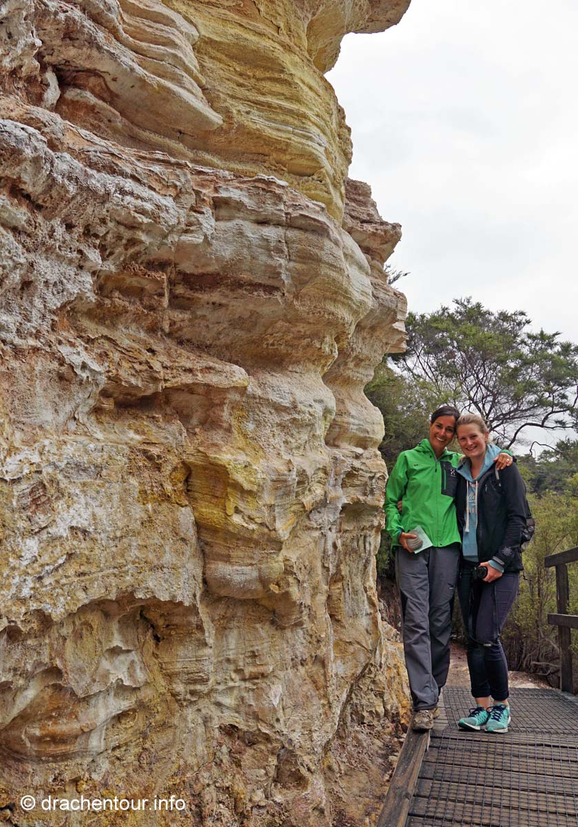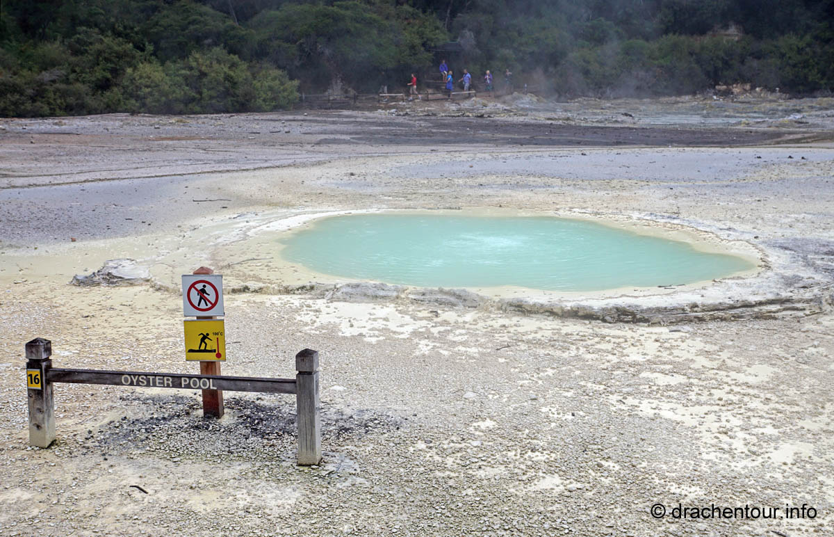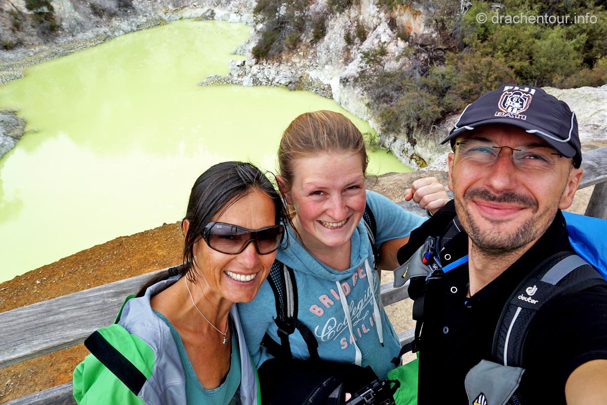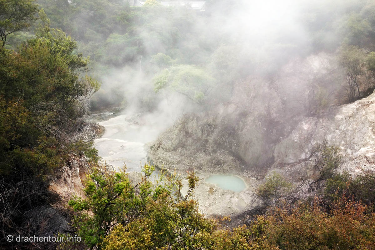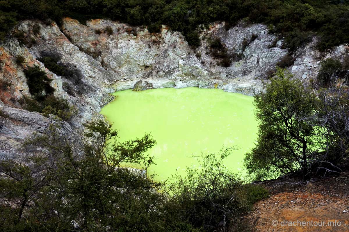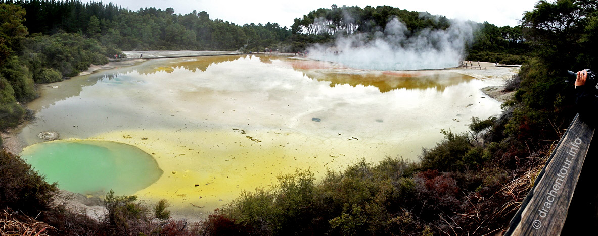 Rotorua ist ein Ort, an dem man die unvorstellbaren Kräfte aus dem Erdinneren deutlich hören, riechen und sehen kann - bereits an den Toren der Stadt kamen wir in den "Genuss" dieser Kräfte. Überall stank es nach faulen Eiern, was dem Schwefel zu verdanken ist und es dampft und brodelt an allen Ecken und Enden. Das liegt an der besonderen Lage der Stadt, denn sie sitzt mitten auf dem Pazifischen Feuerring und weist deshalb eine der höchsten geothermischen Aktivitäten der Welt auf. Natürlich wollten wir uns diese spektakulären Geschehnisse nicht entgehen lassen und widmeten ihnen einen kompletten Tag. So fuhren wir zum Wai-O-Tapu-Wonderland, in der Tat ein vulkanisches Wunderland, denn auf engstem Raum kommen hier sämtliche vulkanische Tätigkeiten in Feinstform vor. Wai-O-Tapu ist Maori und bedeutet übersetzt "heiliges Wasser", diese Region ist vor ca. 160 000 Jahren entstanden: heiße Quellen, Krater aus denen Schwefeldämpfe steigen, die unseren Geruchssinn ganz schön auf die Probe stellten, Geysire und blubbernde Schlammtümpel sind das Markenzeichen des Parks. Doch der Reihe nach.