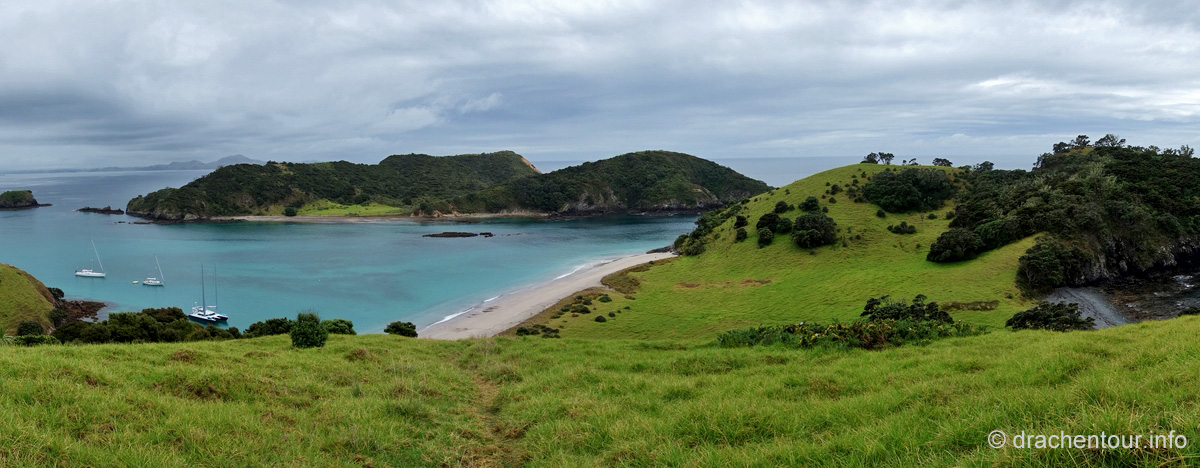 Die Bay of Islands ist eines der bekanntesten Urlaubsorte in gesamt Neuseeland, kein Wunder, dass wir uns dieses, mit mehr als 144 wunderschönen Inseln umrandet von türkisfarbenem und glasklarem Wasser, gesegnete Fleckchen Erde nicht entgehen lassen wollten. Wir freuten uns sehr auf Sonne, Strand und Meer - also Erholung pur und chillen stand auf unserer heutigen "to-do-Liste". Getreu dem Motto schliefen wir zunächst ewig lange aus und gönnten uns unsere ersten beiden Kaffees noch im Bett - wie gemütlich ! Das Wetter zeigte sich nicht von seiner besten Seite, so beschlossen wir das Baden hinten anzustellen und machten uns erstmal auf, das drei Kilometer entfernte Örtchen Paihia zu erkunden. Es wird als eine sehr mondäne und hippe Küstenstadt beschrieben, da freuten wir uns drauf. Zunächst liefen wir einen kleinen Pfad am Meer entlang zum Zentrum, das wir allerdings vergebens suchten, denn irgendwie waren nur ungemütliche Kneipen und Geschäfte mit unschönen Dingen willkürlich aneinandergereiht. Da waren wir doch ziemlich enttäuscht, denn die Versprechungen aus den Reiseführern ließen mehr erhoffen ! Bei einem Eis und ein paar Kniffelspielen erholten wir uns dann und konnten uns sogar ein wenig mit dem Ort anfreunden, so dass wir sogar einen ganzen Mittag dort verbringen konnten. Abends auf dem Campingplatz ließen wir es wieder extrem ruhig angehen und ich legte sogar mal wieder eine Yoga Session ein, Marek sortierte Bilder und Seli vernetzte sich mit Deutschland. So fand der Tag bei einem super leckeren Abendessen mal wieder einen sehr schönen Ausklang.