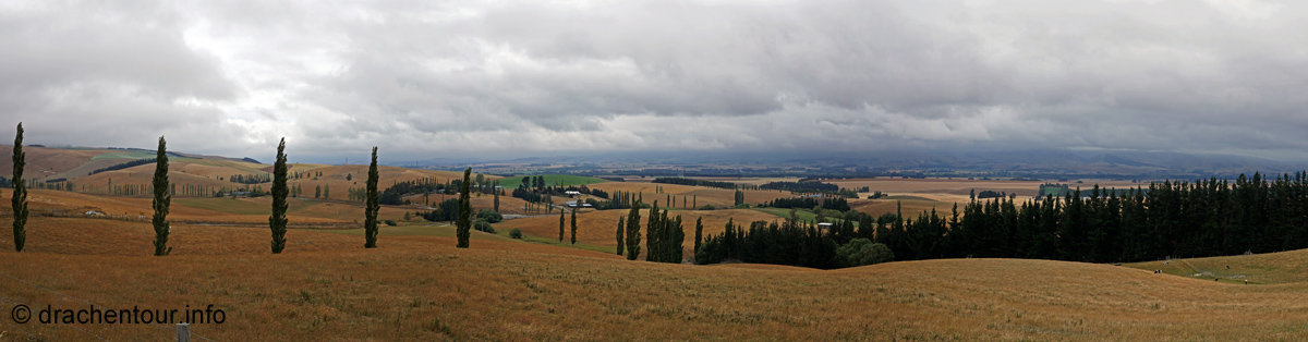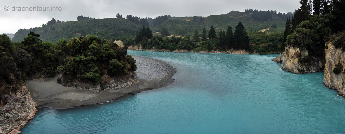 Dennoch erfreuten wir uns an der schönen Landschaft, wie zum Beispiel an den auffällig akribisch gerade geschnittenen Thuja, die als Zäune dienen, an den goldgelben Kornfeldern und vor allem an der Weite. Wir bekamen auch einen ersten Eindruck von den mächtigen Seen und Flüssen mit ihren tollen blauen Färbungen als wir den Fluss Rakaia überquerten. Trotz des anhaltenden schlechten Wetters leuchtet er leicht.