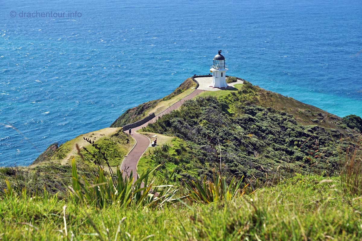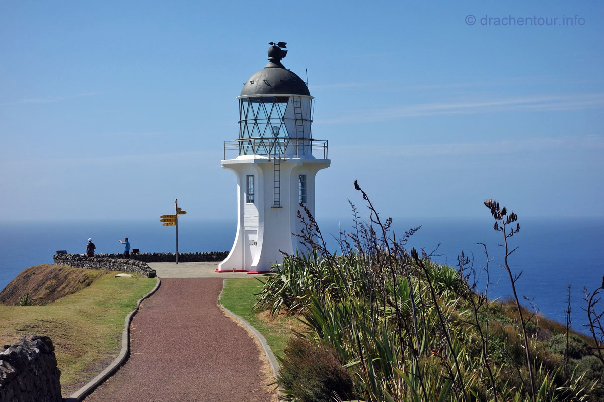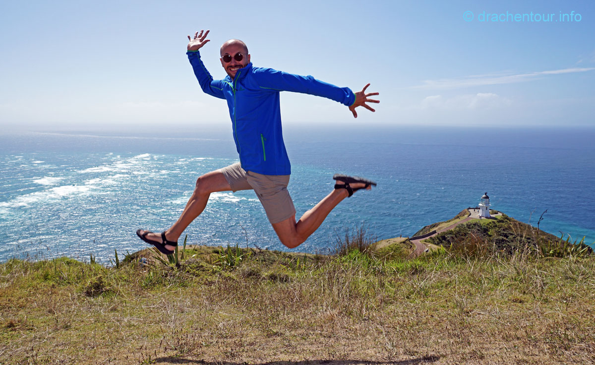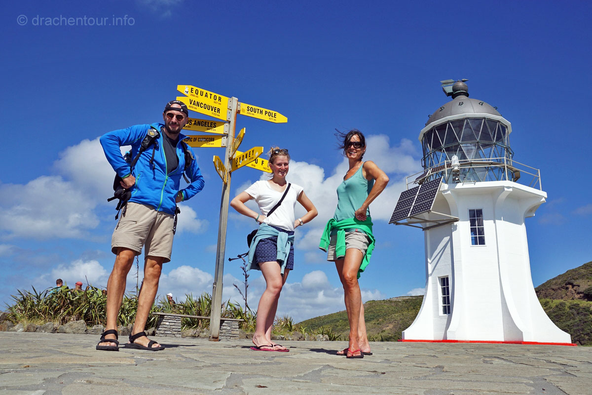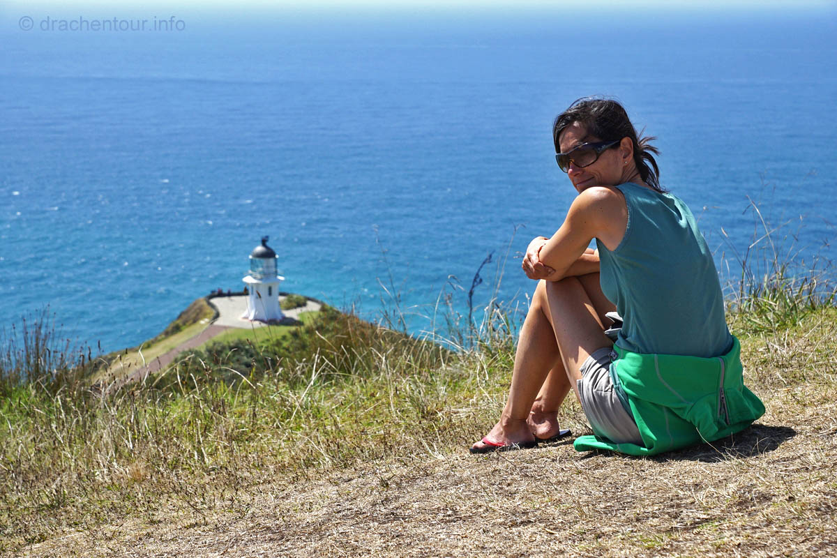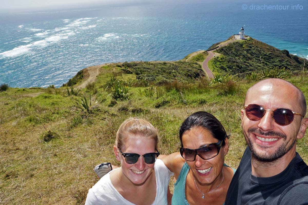 Das letzte Stück zum Cape Reinga zog sich ganz schön in die Länge und die Straße wurde noch kurviger und die Vegetation noch wilder - unsagbar schön durch die Einsamkeit zu cruisen und plötzlich waren wir am Ziel: der fast nördlichste Punkt von Neuseeland - wir haben ihn erreicht. Vom Parkplatz aus, wie immer spitzenmäßig gut angelegt, gelangten wir über einen gut ausgebauten Wanderweg mit vielen Infotafeln hinunter zum Leuchtturm. Der Blick von der Plattform auf die endlose Weite der beiden Meere hat uns lange festgehalten und fasziniert, man fühlt sich ganz klein in Anbetracht der mächtigen Ozeane und auch ganz bei sich und zufrieden. So hing jeder seinen Gedanken nach und wir bewunderten eine gefühlte Ewigkeit, mit welcher Wucht die beiden Meere hier aufeinander treffen: die Tasman Sea im Westen und der Pazifik im Osten. Es entstehen mächtige Verwirbelungen und riesige Wellen, ein phänomenal großartiges Naturschauspiel. Kein Wunder, dass die Maoris diesem Ort eine ganz besondere Bedeutung zusprechen: Die Seelen der Toten pilgern den langen Weg entlang des „ Ninety Miles Beach “ und verlassen hier Neuseeland um zurückzukehren in ihre alte Heimat in der Südsee. Das diesem Ort eine Art Magie innewohnt, das haben wir alle wahrgenommen und gespürt.