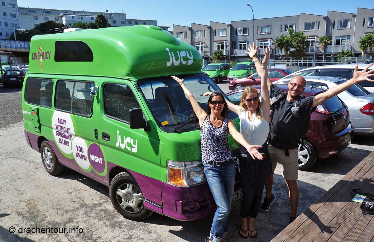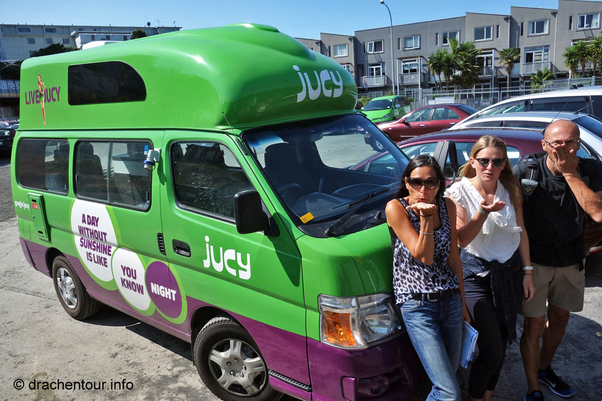 Unser letzter Juicy-Tag bricht an und die letzten Kilometer mit der Treuen stehen uns bevor - von Paihia nach Auckland - ganz gemütlich kosteten wir diese Strecke aus und genossen es nochmals einen so zuverlässigen fahrbaren Untersatz, Hotel und Restaurant in einem zu haben. Wie im Flug verging die Zeit und ruck zuck erreichten wir unser letztes Ziel in Neuseeland: Auckland ! Zuerst steuerten wir unsere Bleibe für die nächsten drei Nächte an, eine gemütliche Cottage auf zwei Etagen mit Küche. Sie lag zwar etwas außerhalb, dennoch hatten wir eine gute Anbindung an das öffentliche Verkehrssystem, so konnten wir problemlos mit dem Zug in das Herz der City gelangen. Wir verfrachteten unser gesamtes Gepäck in unser schmuckes kleines Häuschen und fuhren dann zum Juicy-Office. Dann hieß es Abschied nehmen von unserer Juicy, die wir, obwohl es ein Camper ist, in unsere Herzen geschlossen haben. Wir sind so froh, dass wir sie hatten, denn sie war mit ein Garant dafür, dass unsere Reise in Neuseeland ein so phänomenales Ereignis wurde. Des Weiteren sind wir auch unwahrscheinlich dankbar, dass uns auf den insgesamt 4999 gefahrenen Kilometern nichts, aber auch rein gar nichts passiert ist – toll ! Der Abschied rückt näher: also Tschüss, danke und mach´s gut ! und weg !