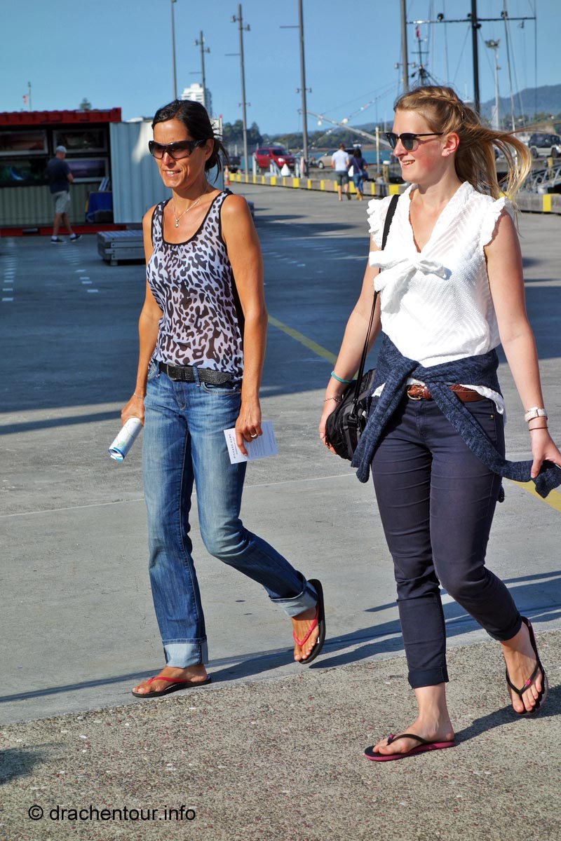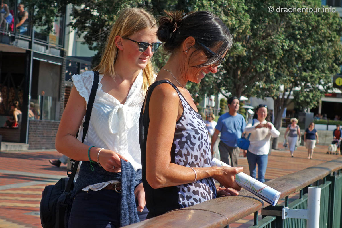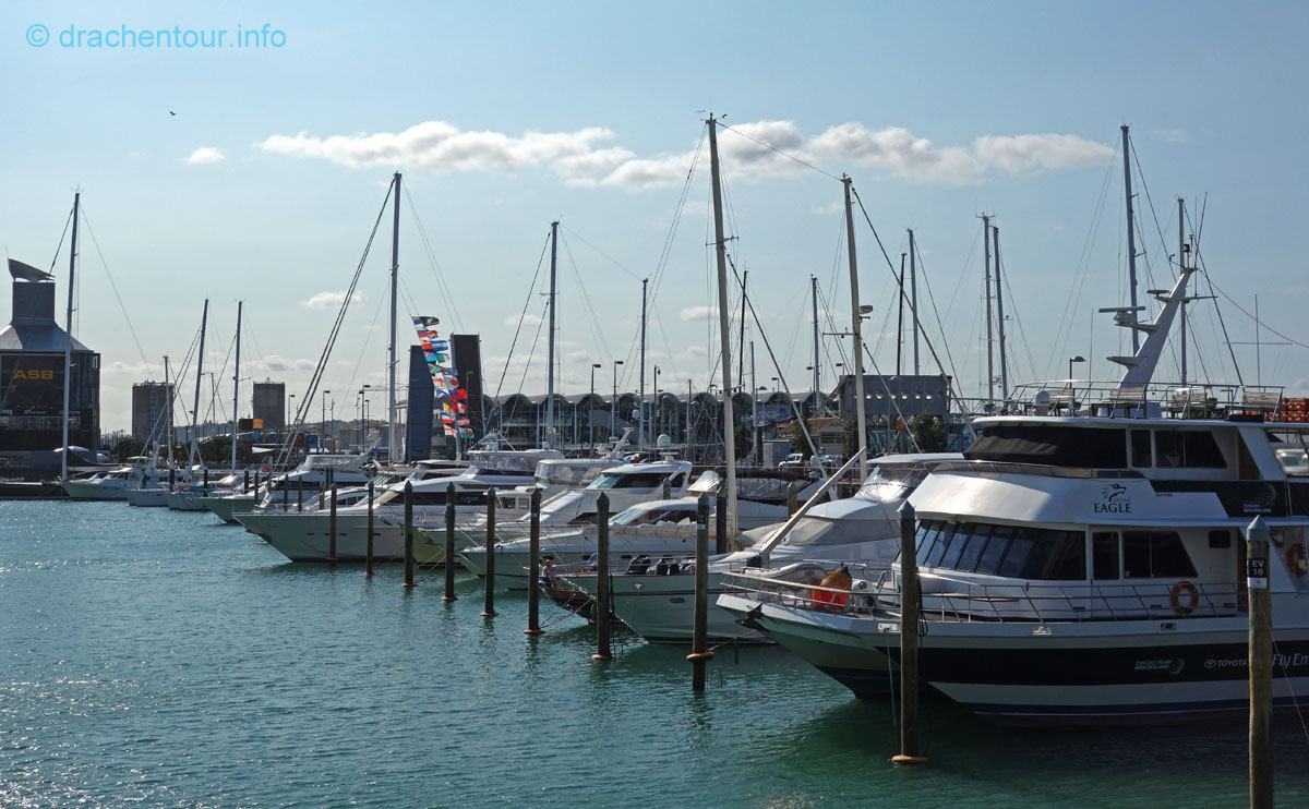 So waren wir jetzt wieder zu Fuß unterwegs und spazierten gemütlich an die „Waterfront“ Aucklands, um bei untergehender Sonne noch die Abendstimmung am Hafen zu erleben. "Aucki", wie es fast schon liebevoll genannt wird, ist quasi fast ringsherum vom Meer umgeben und so spielt sich hier alles auf dem oder am Wasser ab. Und als wir uns so den Hafen, der fast überquoll von wunderschönen Booten und Yachten, betrachteten wurde uns vollkommen klar, warum diese Metropole den Spitznamen "City of Sails" trägt ! Es lagen hier erstaunlich riesige Kreuzfahrtschiffe im Hafen, unter anderem auch die "Albatross", die ich aus Sendungen, die mittags im TV laufen (die schaue ich manchmal, um mich vom Wahnsinn des Schulalltags zu erholen), kenne - lustig - ich erkannte sogar das ein oder andere Crewmitglied ! Überhaupt hat uns die gesamte Hafenpromenade mit den unzählig vielen netten Kneipen und Restaurants und seine komplette Atmosphäre so gut gefallen, so dass wir es uns dort gemütlich machten, die unterschiedlichsten Menschen beim Flanieren beobachteten und eine Runde Kniffel spielten. So war es relativ schnell Abend und wir machten uns auf den Heimweg. Nach einem Abendessen freuten wir uns mal wieder auf ein richtiges Bett – zzzzzhhh ! Sweet dreams !
