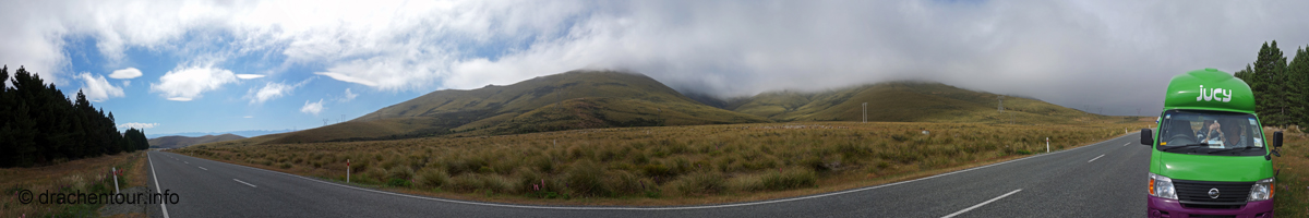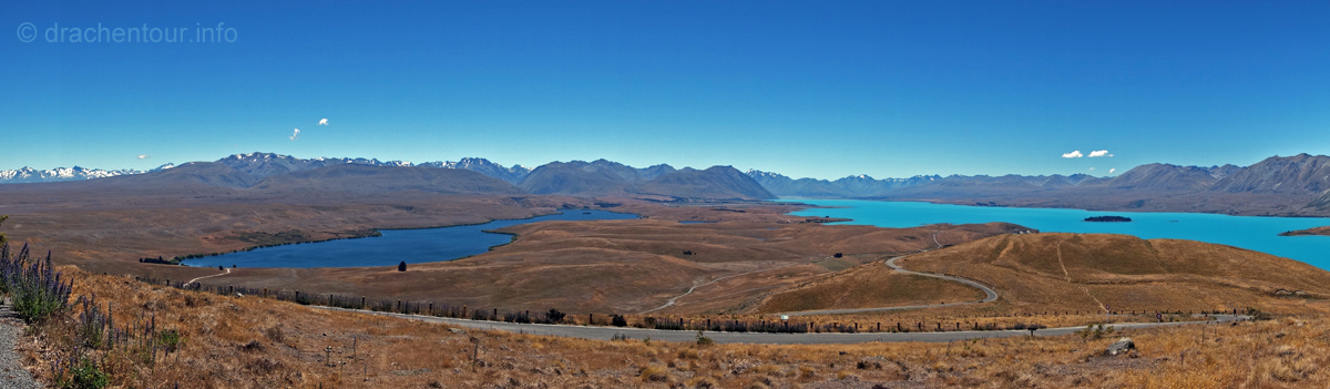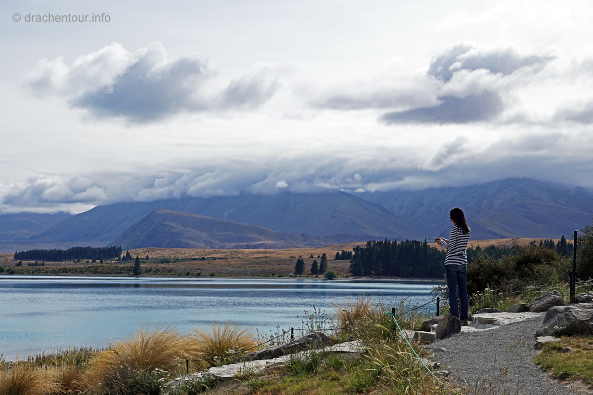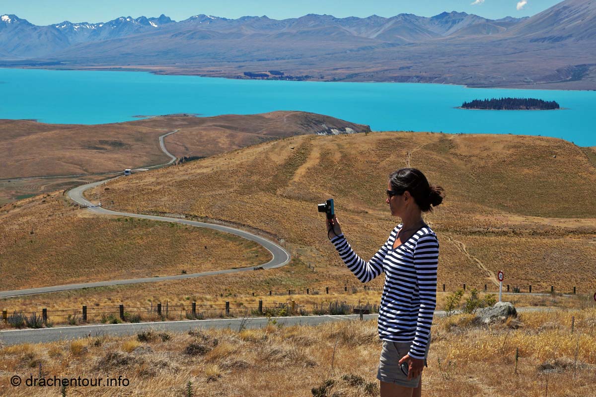 Unterwegs machten wir einen kurzen Stopp in Geraldine bei der i-Site ( DIE Touristeninformation in Neuseeland, mit sehr freundlichen Mitarbeitern, die immer weiterhelfen können ), um unsere Campsite (Campinplatz) zu reservieren, denn wir hatten noch keine Vorstellung davon, ob man bereits im Voraus buchen muss oder relativ spontan sein kann. Die "i-Site -Heather" machte telefonisch alles klar und fragte zum Abschluss des Telefonats noch: " Wie ist denn das Wetter bei euch ? " Sie wiederholte die Antwort laut :" sunny and 28 ! " Die Neuseeländer haben schon einen guten Sinn für Humor und wissen wie sie die Touris bei diesem Regenwetter bei guter Laune halten können. So ging die Fahrt mit dem Ziel in der Tasche noch für 30 Minuten weiter und wir folgten der landschaftlich wunderschönen Straße (A8) und überquerten einen kleinen Pass. Und dann wurde die Prophezeiung der Heather-Weather ( wie wir sie nun nannten ) wahr, die Wolken verschwanden urplötzlich und die Sonne erstrahlte an einem wunderschönen blauen Himmel. Dieser “ Satteleffekt “ war unglaublich und wir freuten uns sehr. Nach einer weiteren kurzen Fahrt hatten wir auch den ersten Ausblick auf den Lake Tekapo - wahnsinnig schön im Quadrat !!!