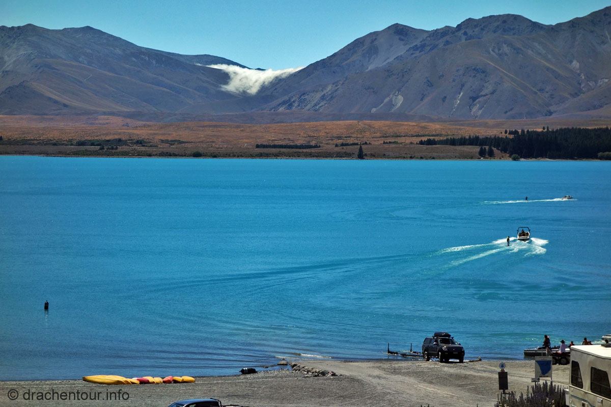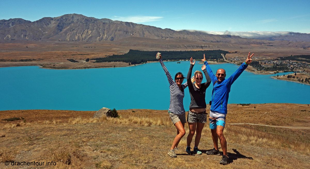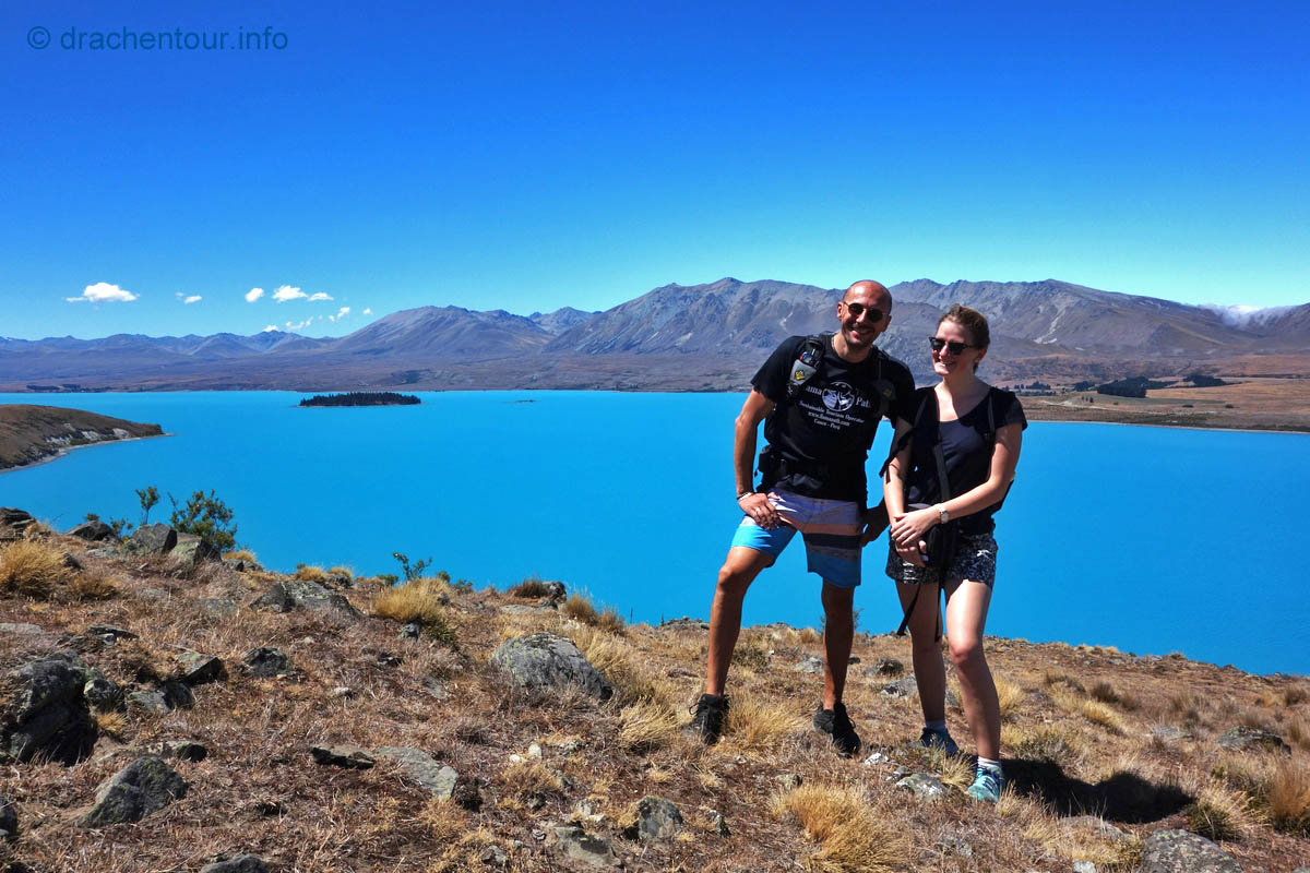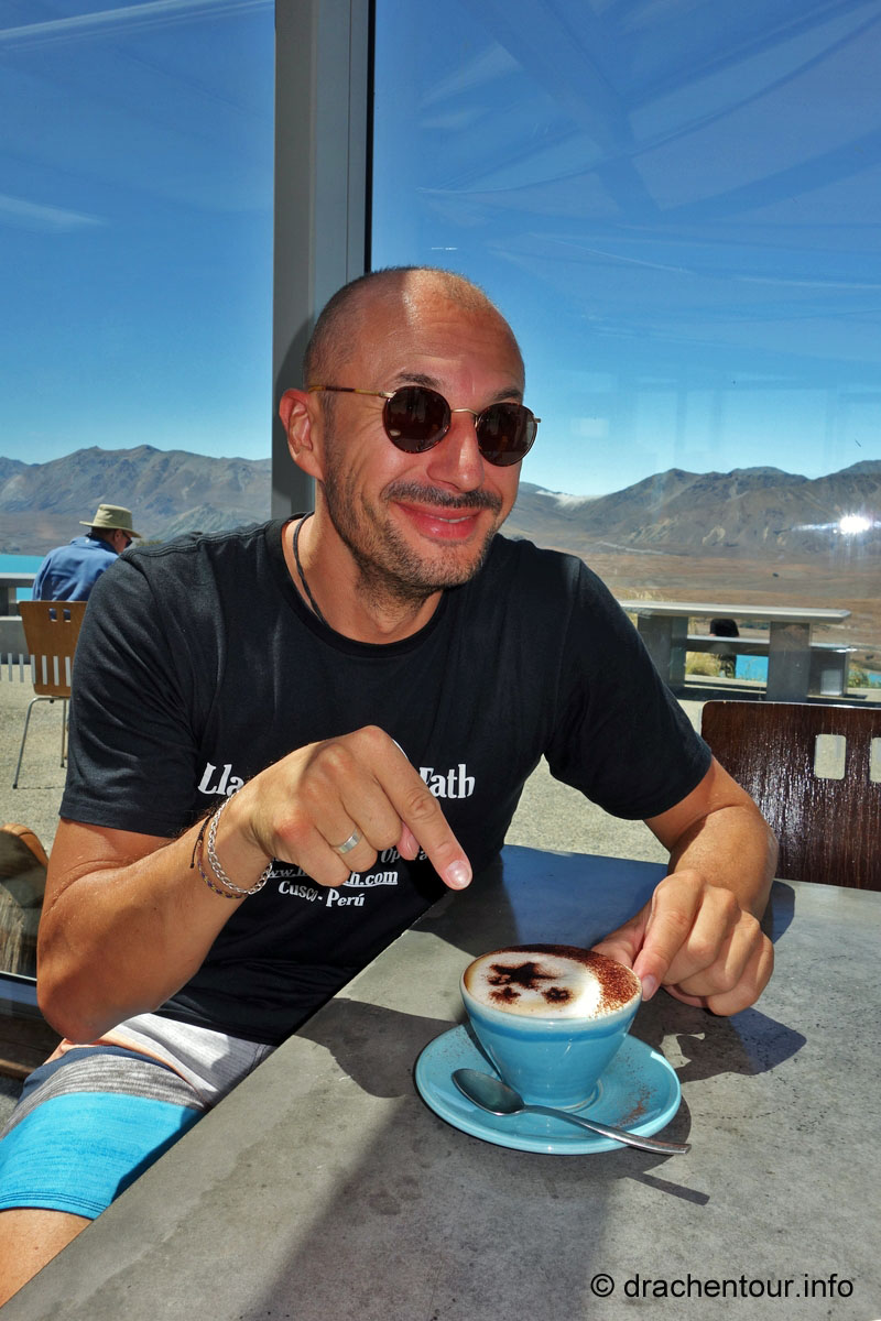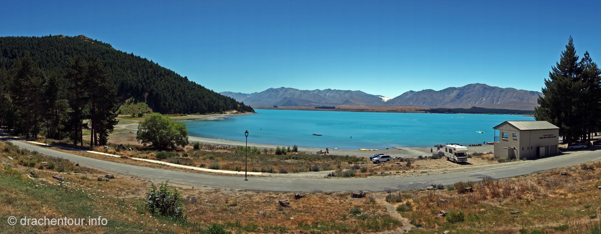 Für den kommenden Tag hatten wir eine kleine Wanderung in der friedlichen und beeindruckenden Umgebung geplant. So spazierten wir erst auf den Mount John, auf dessen Gipfel ein bekanntes Observatorium steht und ein Cafe ( mit äußerst interessanten Hinweisen, wie die Toilette zu benutzen ist :-) ) An dieser Stelle sei unbedingt mal erwähnt, dass der Kaffee in Neuseeland spitzenmäßig schmeckt, sie verstehen echt ihr Handwerk, welch ein Glück für uns :-). Ebenso spitzenmäßig war der Ausblick auf den wunderschönen See, er erstrahlte in einem knalligen Türkis, welches sich phänomenal schön zu der kargen Umgebung abhebt und im Hintergrund thronen die Neuseeländischen Alpen mit ihren weißen Zipfelmützen - ein atemberaubender Anblick. Er bekommt seine intensive, milchig - türkise Färbung durch feinen Felsstaub, der durch Gletscherbewegungen zermahlen und durch das Wasser des Sees in der Schwebe gehalten wird. Anschließendend komplettierten wir unsere Wanderung entlang des Seeufers, mit ständigem Blick auf das unwirklich anmutende türkise Wasser, wieder zurück zum Campingplatz. Dort angekommen packten wir unsere Badesachen und erholten uns in den Hot Springs von den "Strapazen", indem wir relaxt im Wasser herumhingen und uns von der Schwerelosigkeit und der Wärme des Wassers tragen ließen - ein perfekter Tag neigt sich dem Ende zu, so dass ein neuer kommen kann !