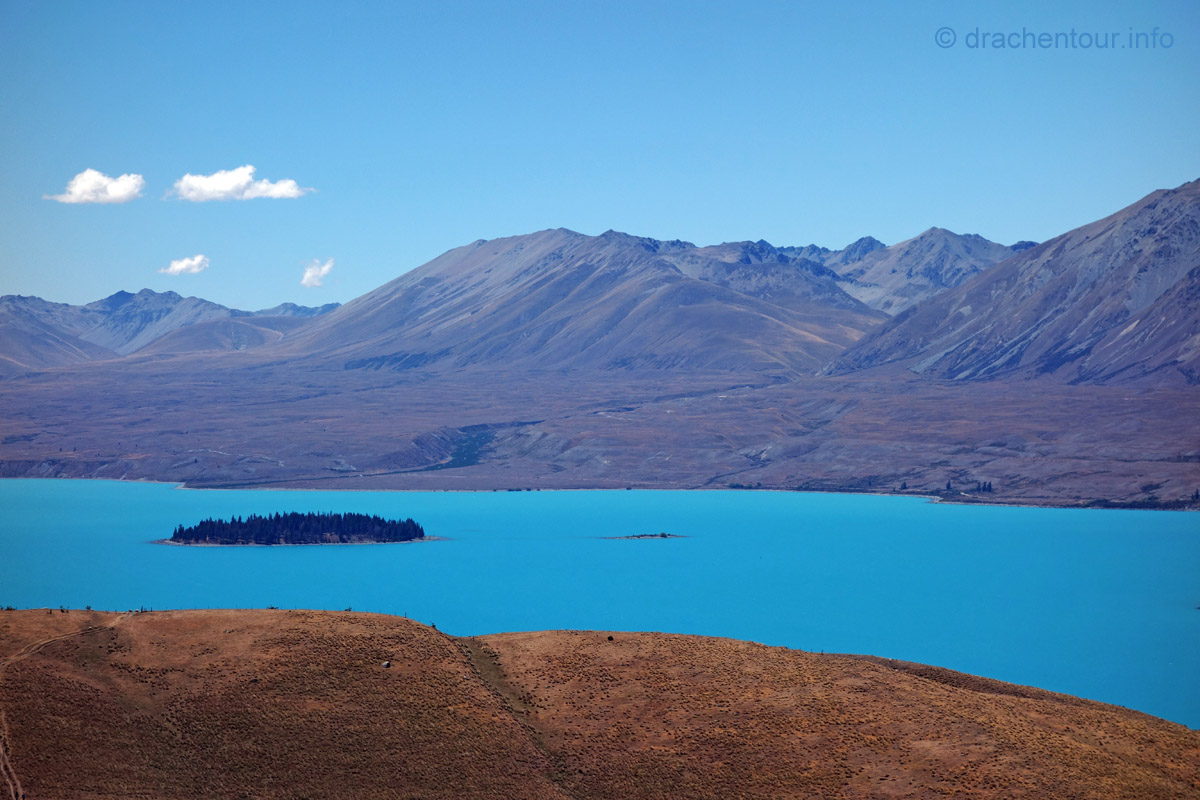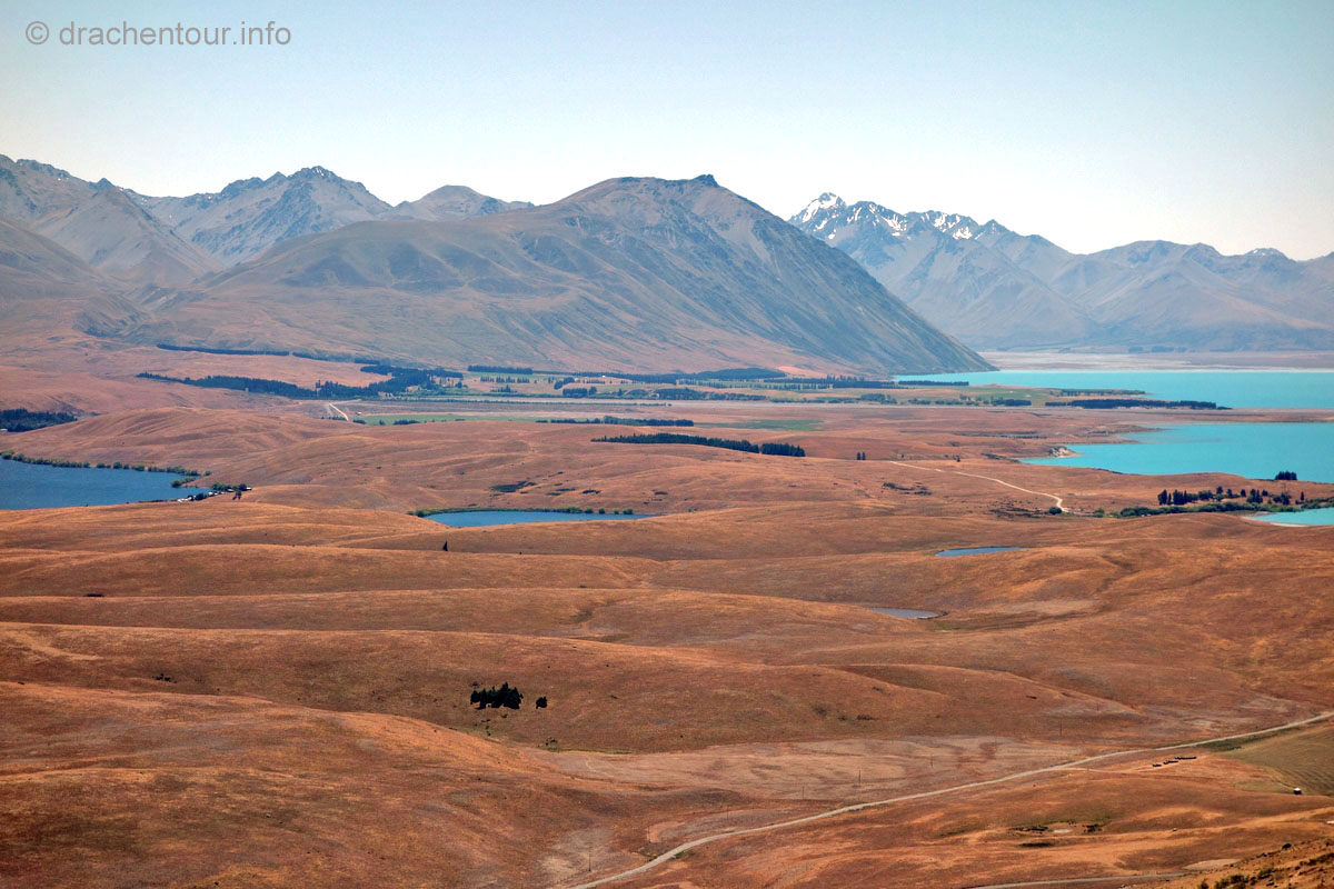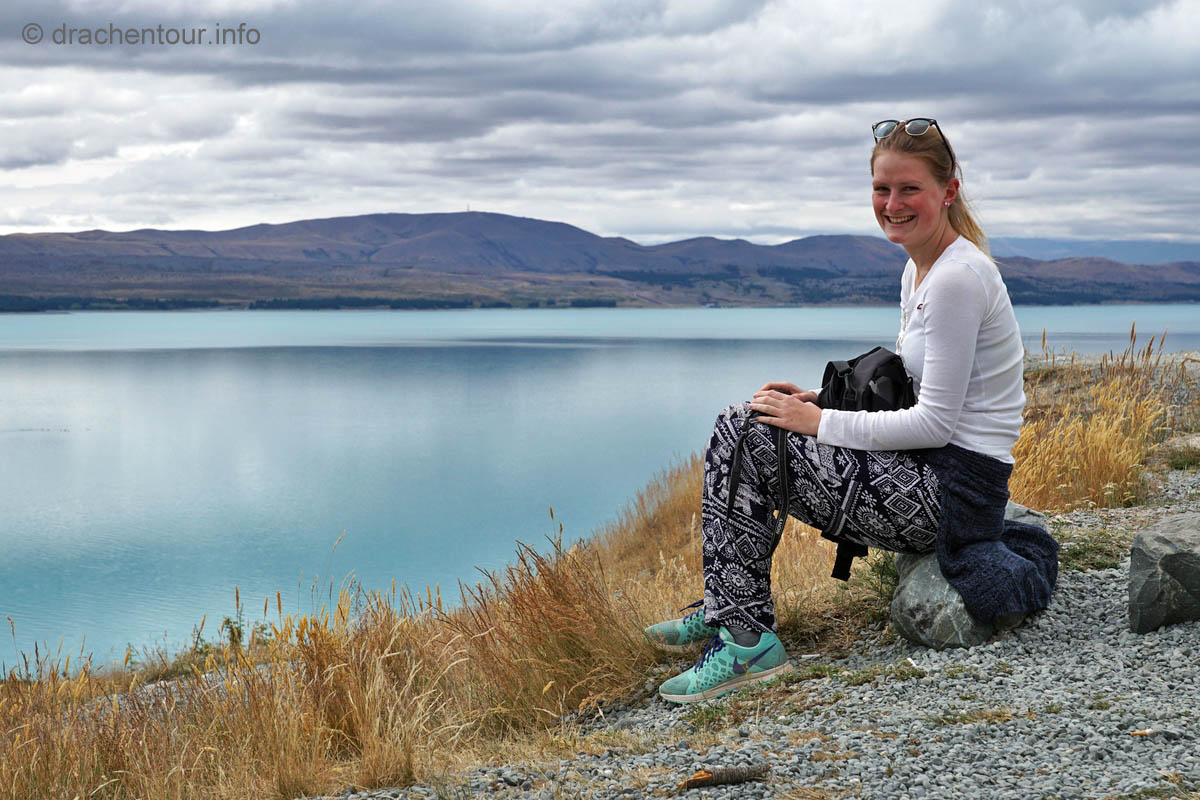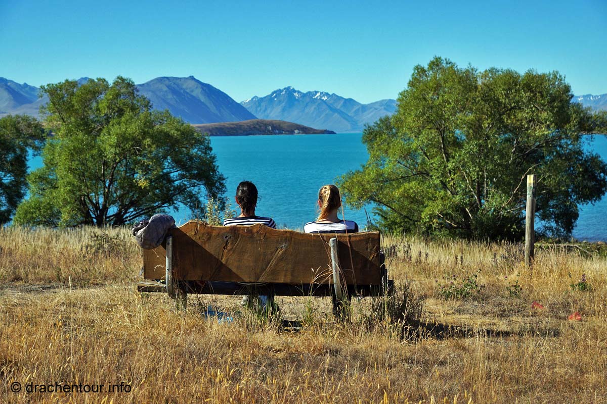 Für den kommenden Tag hatten wir eine kleine Wanderung in der friedlichen und beeindruckenden Umgebung geplant. So spazierten wir erst auf den Mount John, auf dessen Gipfel ein bekanntes Observatorium steht und ein Cafe ( mit äußerst interessanten Hinweisen, wie die Toilette zu benutzen ist :-) ) An dieser Stelle sei unbedingt mal erwähnt, dass der Kaffee in Neuseeland spitzenmäßig schmeckt, sie verstehen echt ihr Handwerk, welch ein Glück für uns :-). Ebenso spitzenmäßig war der Ausblick auf den wunderschönen See, er erstrahlte in einem knalligen Türkis, welches sich phänomenal schön zu der kargen Umgebung abhebt und im Hintergrund thronen die Neuseeländischen Alpen mit ihren weißen Zipfelmützen - ein atemberaubender Anblick. Er bekommt seine intensive, milchig - türkise Färbung durch feinen Felsstaub, der durch Gletscherbewegungen zermahlen und durch das Wasser des Sees in der Schwebe gehalten wird. Anschließendend komplettierten wir unsere Wanderung entlang des Seeufers, mit ständigem Blick auf das unwirklich anmutende türkise Wasser, wieder zurück zum Campingplatz. Dort angekommen packten wir unsere Badesachen und erholten uns in den Hot Springs von den "Strapazen", indem wir relaxt im Wasser herumhingen und uns von der Schwerelosigkeit und der Wärme des Wassers tragen ließen - ein perfekter Tag neigt sich dem Ende zu, so dass ein neuer kommen kann !