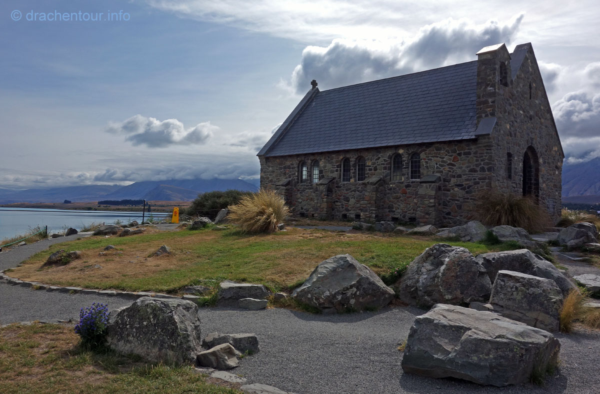 Nach einem leckeren Frühstück mit Rührei, Müsli, Obstsalat, Käse mit Senf und Honig ( letzteres klingt zwar etwas exotisch, schmeckt aber lecker, gell Seli :-) ! ) und Brot machten wir uns bei strahlendem Wetter wieder auf den Weg in Richtung Queenstown. Den ersten Stopp machten wir bereits nach einer fünf minutigen Fahrt am Ortsausgang von Lake Tekapo bei der meist fotografiertesten Kirche Neuseelands der "Church of the Good Sheperd". Und das ist sie nicht zu Unrecht, denn sie liegt romantisch am Ende des Sees mit einer wundervollen Bergkette als Hintergrundkulisse.