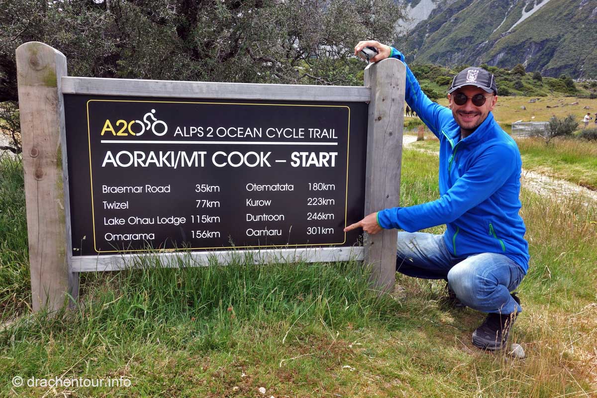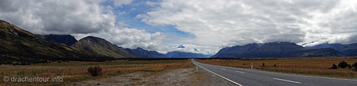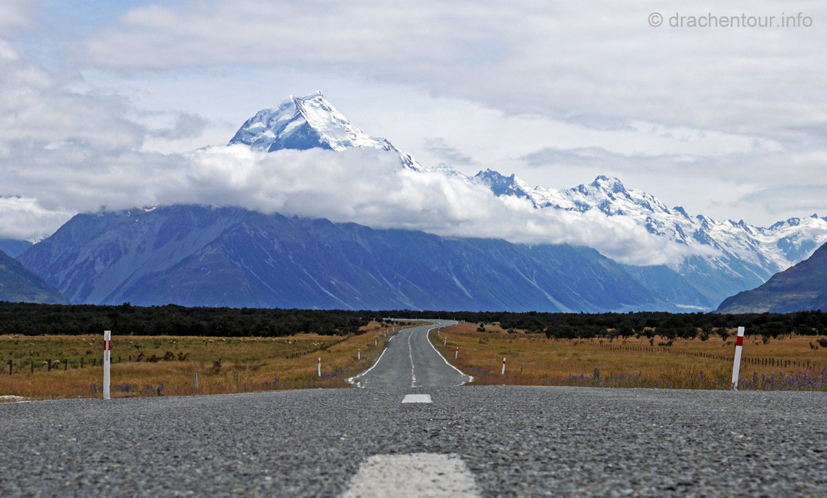 Langsam rückte der atemberaubende milchig, türkis schimmernde Lake Takepo aus unserem Blickfeld, da tauchte vor uns schon das nächste Schmuckstück auf: der Lake Pukaki. Auch dieser See lag romantisch eingebettet in die Landschaft mit dem Blick auf die herrlichen Berge der Neuseeländischen Alpen. Wiedermal war es faszinierend, dass keinerlei Spuren der Zivilisation zu erkennen waren, d.h. keine Häuser oder Hotels am Seeufer und keine Boote auf dem Wasser, Natur pur ! Leider versteckten sich die Berggipfel und somit auch der höchste Berg Neuseelands, der Mount Cook ( 3724 m !!! ) noch hinter den Wolken und wir konnten ihre vollständige Schönheit zunächst nur erahnen. Wir fuhren gemütlich die landschaftlich sehr schöne Straße am Westufer des Sees entlang bis wir in den Nationalpark gelangten, in dessen Zentrum der Mount Cook ist. Mittlerweile hatte sich die Wolkendecke auch so gut wie aufgelöst und uns eröffnete sich ein toller Anblick auf die schneebedeckten Zipfelmützen und auch auf den großen Mount Cook.