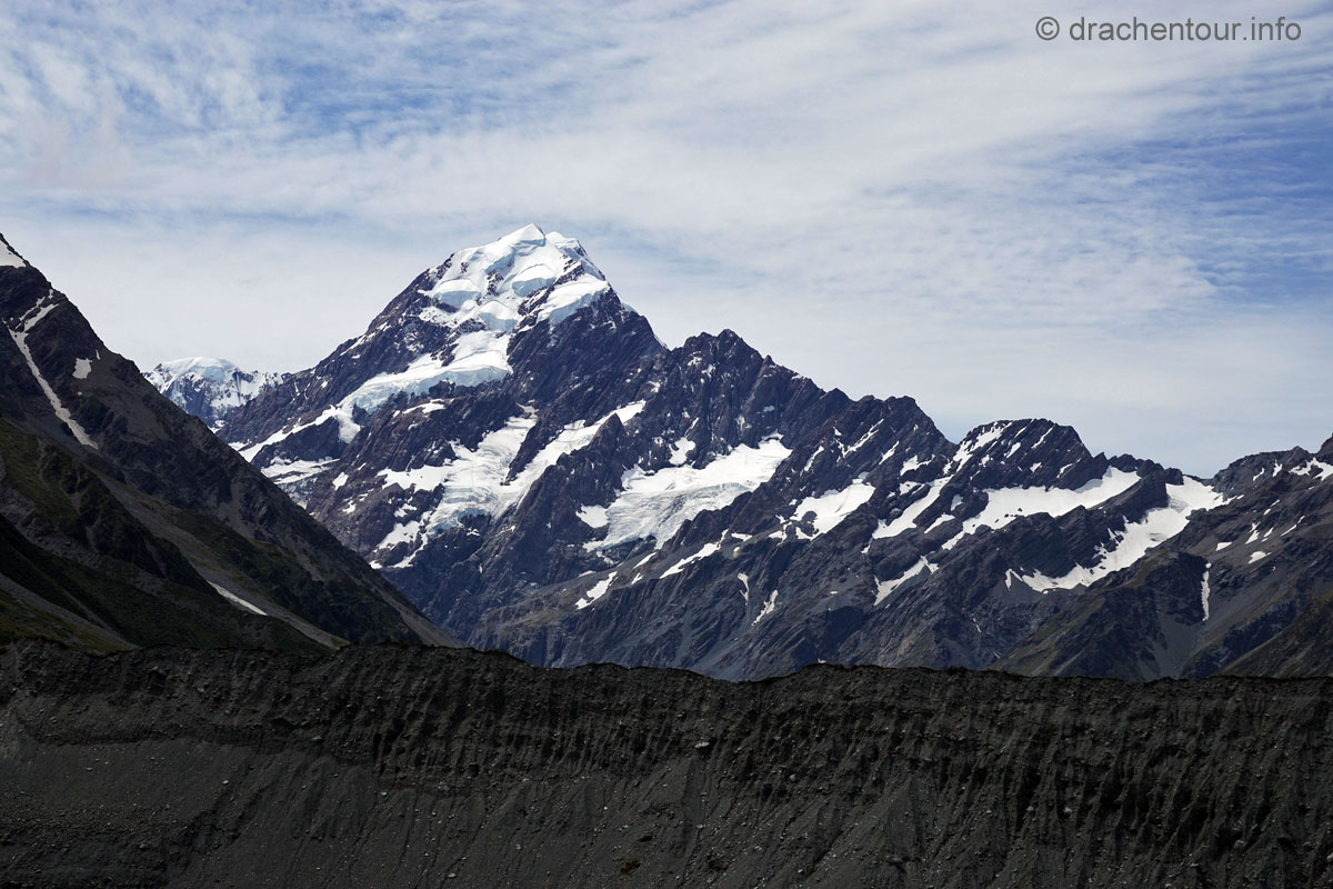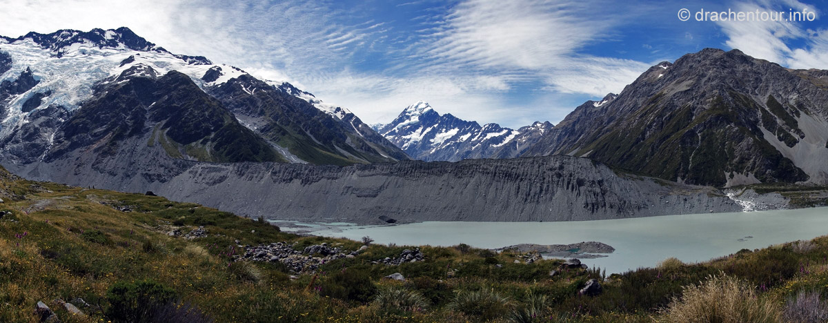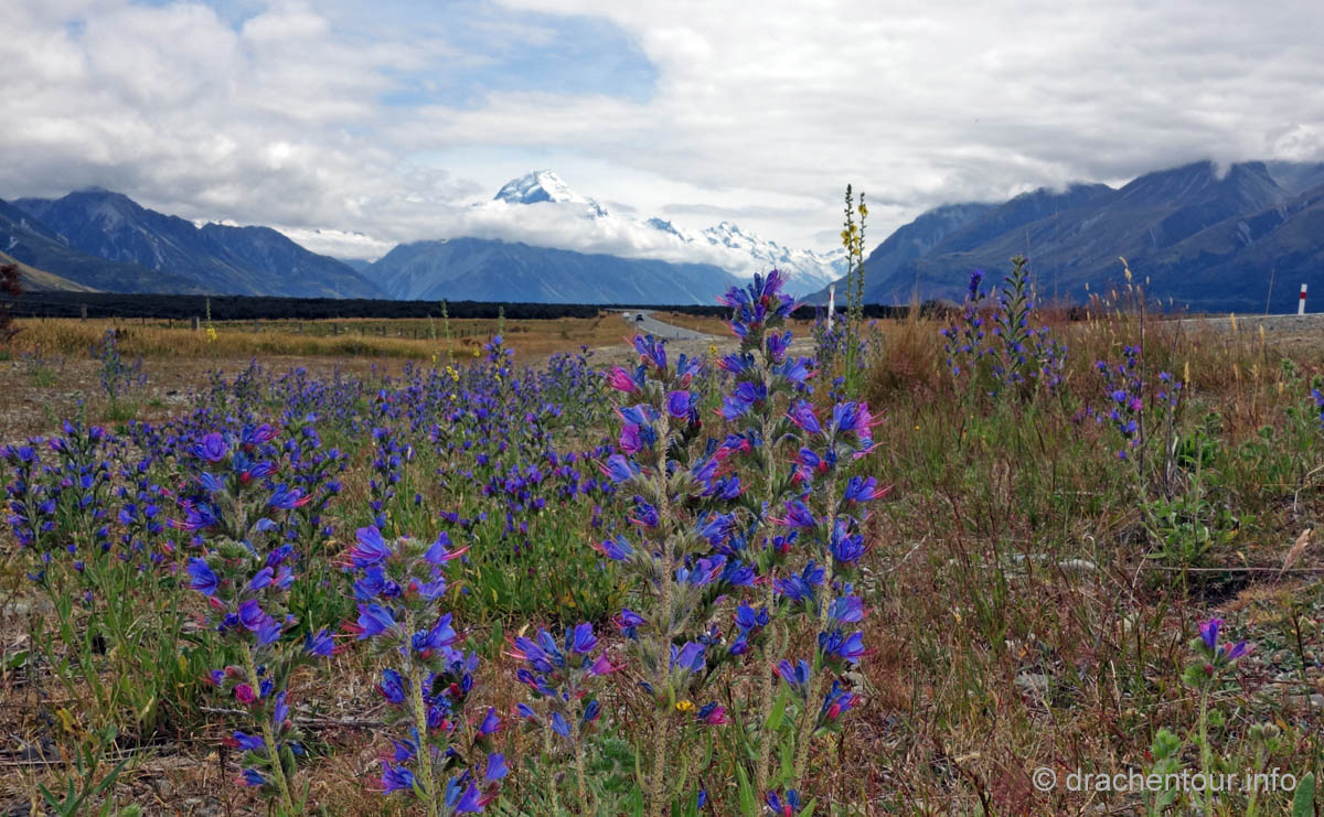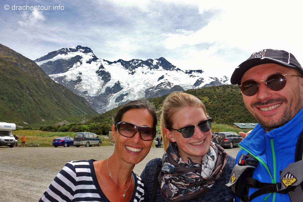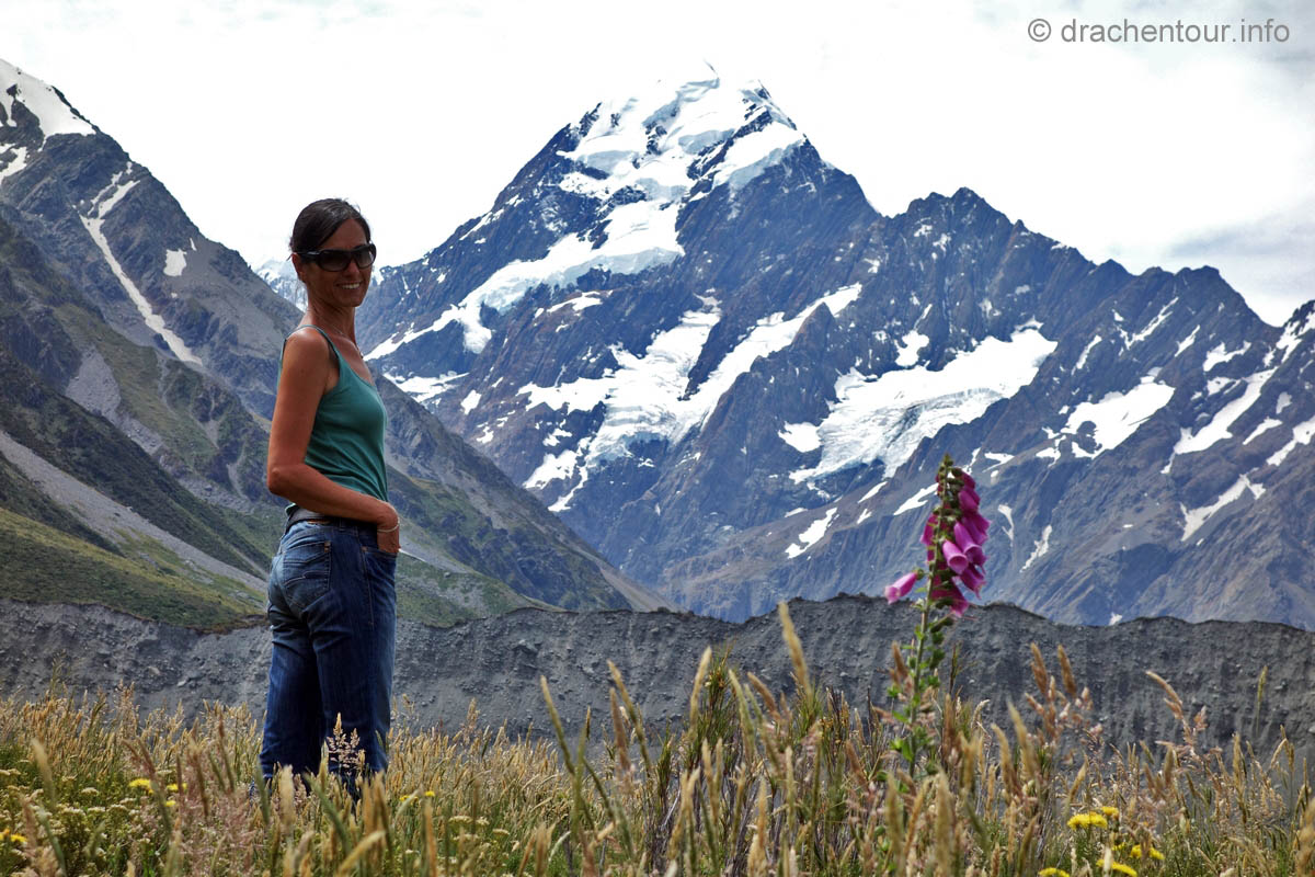Den wollten wir noch mehr aus der Nähe bewundern, deshalb beschlossen wir eine kurze Wanderung zu einem Aussichtspunkt zu unternehmen. Der Weg führte uns an einem Flussbett und blumigen Wiesen, die uns an unsere Alpen erinnerten, entlang, dabei waren wir ständig auf der Suche nach dem Schönen. Leider konnten wir ihn aber nicht entdecken, wir vermuteten ihn hinter einer kleinen Wolkenschicht oder hinter einem kleineren Berg und hatten so die Hoffnung, ihn in seiner ganzen Pracht oben am Aussichtspunkt zu sehen. Diese Hoffnung erfüllte sich dann auch, d.h. eigentlich hatte sie sich die ganze Zeit schon erfüllt, denn er war während der gesamten Wanderung direkt vor unserer Nase, wir haben ihn in der falschen Richtung vermutet - kann ja mal passieren ;-) ! An unserem Ziel angekommen, hatten wir nicht nur einen atemberaubenden Blick auf die mächtigen Riesen, sondern auch auf den Tasman Gletscher, der mit seinen 27 km Länge und 3 m Breite der größte seiner Art in den Neuseeländischen Alpen ist - super beeindruckend, wie es quasi am Berg "hängt" !