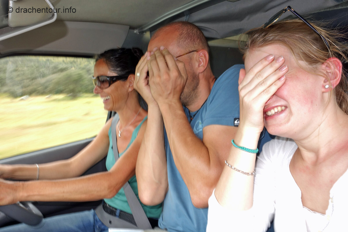 Bereichert mit diesem Erlebnis ging unsere Fahrt wieder auf derselben wunderschönen Straße zurück, allerdings mit einem Fahrerwechsel, denn jetzt übernahm ich das Steuer. Langsam musste ich mich an die Handhabung der Juicy gewöhnen und noch erschwerend kam der Linksverkehr und die Automatik hinzu, aber so schlimm, wie unten auf dem Bild war es dann doch nicht :-) !
