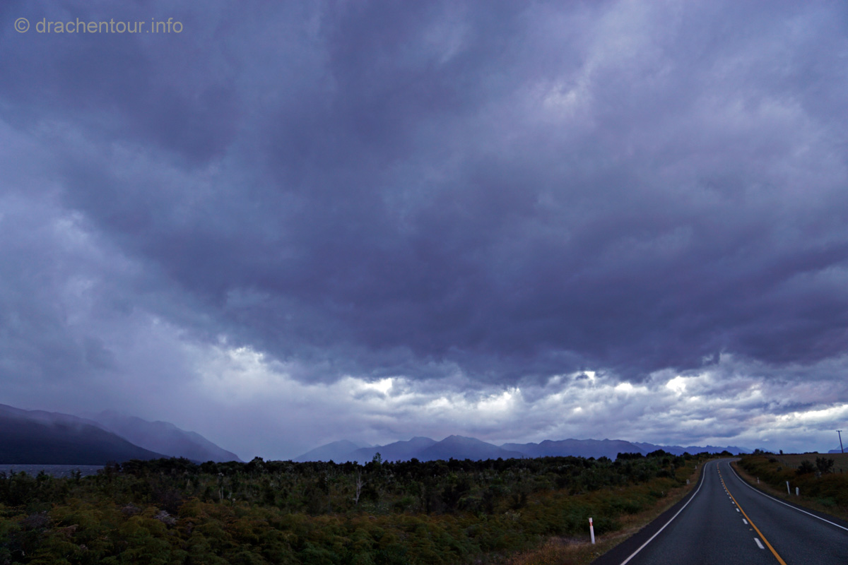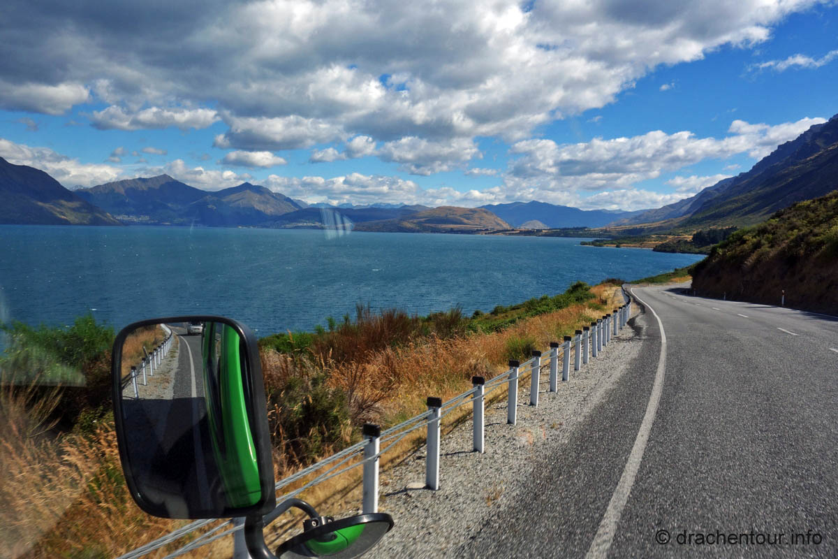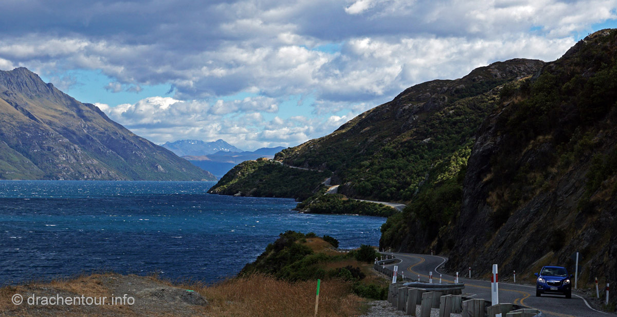 Von diesem Ereignis freudig erfüllt, fuhren wir weiter in Richtung Te Anau. Die Fahrt war für meine Mitreisende vielleicht wieder ein kleiner Adrenalinkick, da ich das Steuer übernommen hatte :-) ! Die Straße führte uns erneut durch eine atemberaubende Landschaft, vor allem am wilden Lake Wakatipu entlang, dessen windgepeitsche Wasseroberfläche in Verbindung mit den ihn umrahmenden Berge vorzügliche Fotomotive bildete. Gegen Abend erreichten wir unser Ziel, ein schön gelegener Campingplatz (mit Küche, Toiletten und Duschen – jipii ! ) am Lake Te Anau, wieder ein wundervoller See in einer spitzenmäßigen Landschaft.