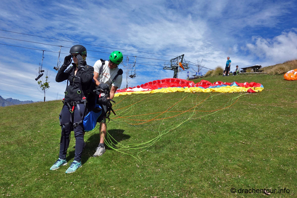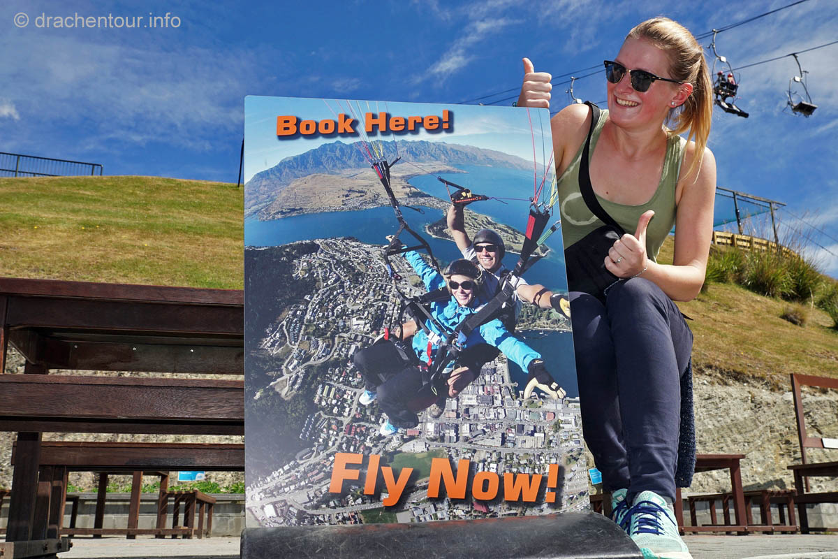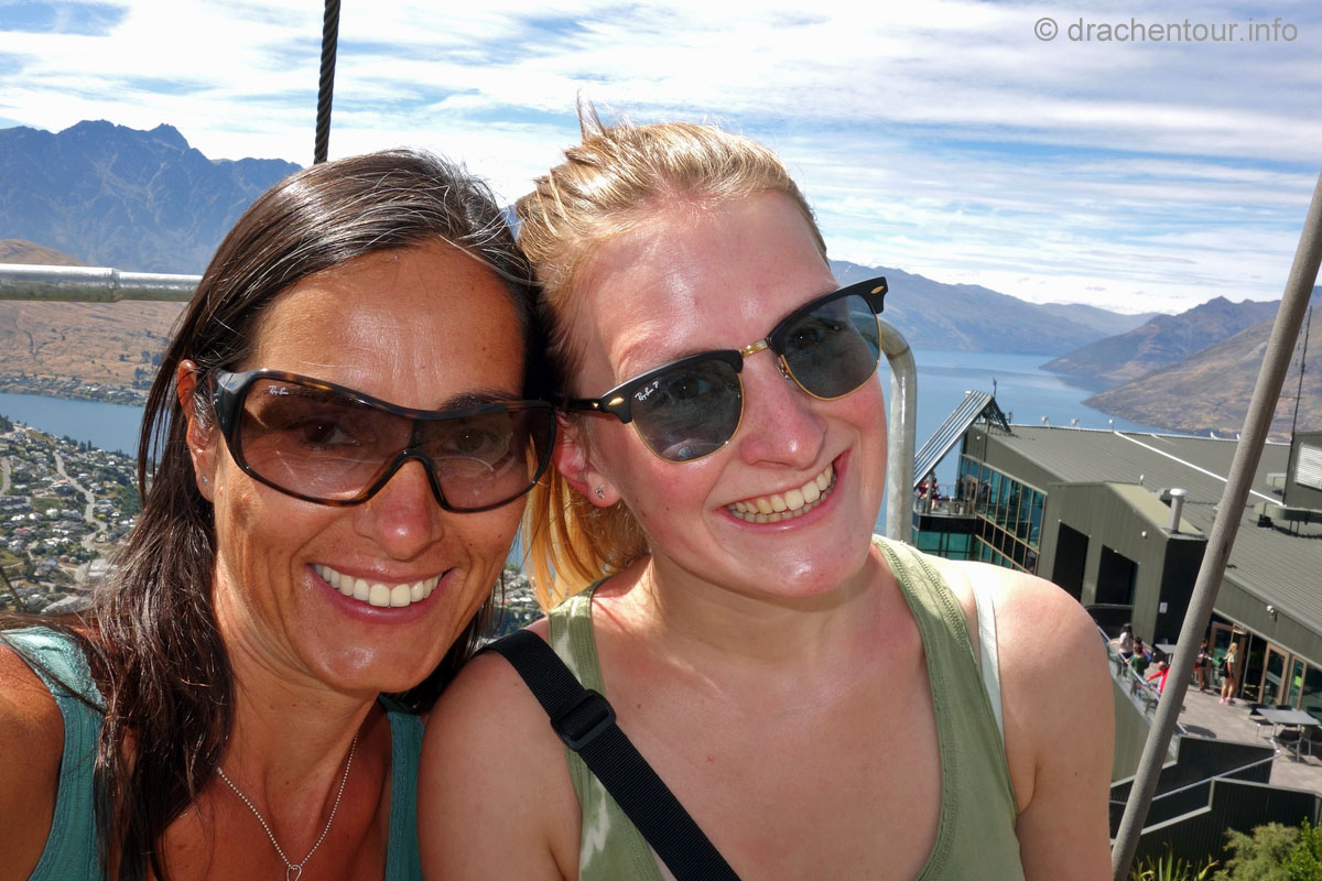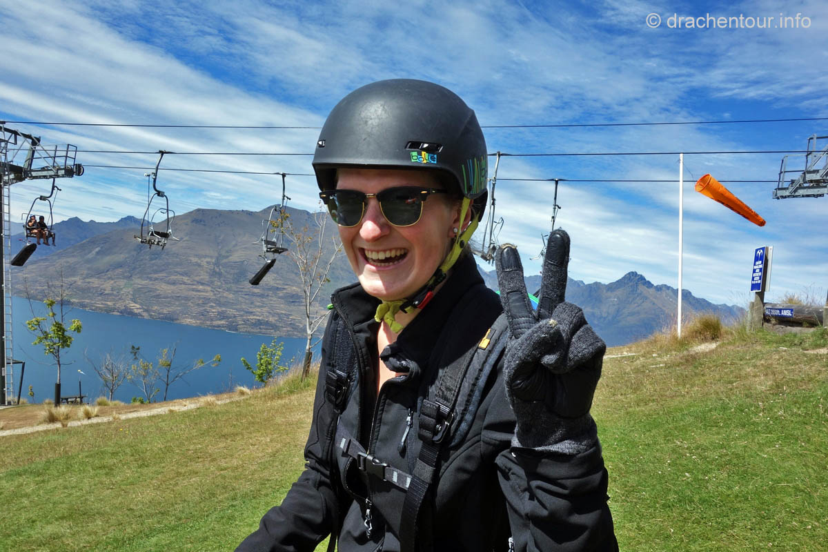 Wie schon erwähnt, bietet Queenstown eine unermessliche Bandbreite an Abenteuern und eines wählte sich Selina darunter aus. Marek und ich wollten ihr zu ihrem Geburtstag und zu ihrem bestandenen Abitur ( jipiii ! ) ein besonderes Geschenk bereiten, so kam es dazu, dass wir ihr einen Gutschein für eine "Besonderheit" in Neuseeland schenkten. Selina löste nach einer kurzen Bedenkzeit den Gutschein ein und beschloss einen Tandemsprung zu wagen. Gesagt getan, das Wetter war optimal und so fuhren bereits um 10 Uhr morgens mit der Gondel in die Berge zum Office der Gleitschirmagentur. Dann ging alles ganz schön schnell und ruck zuck war unsere Nichte mit dem Guide Thomas bereit für den Absprung.