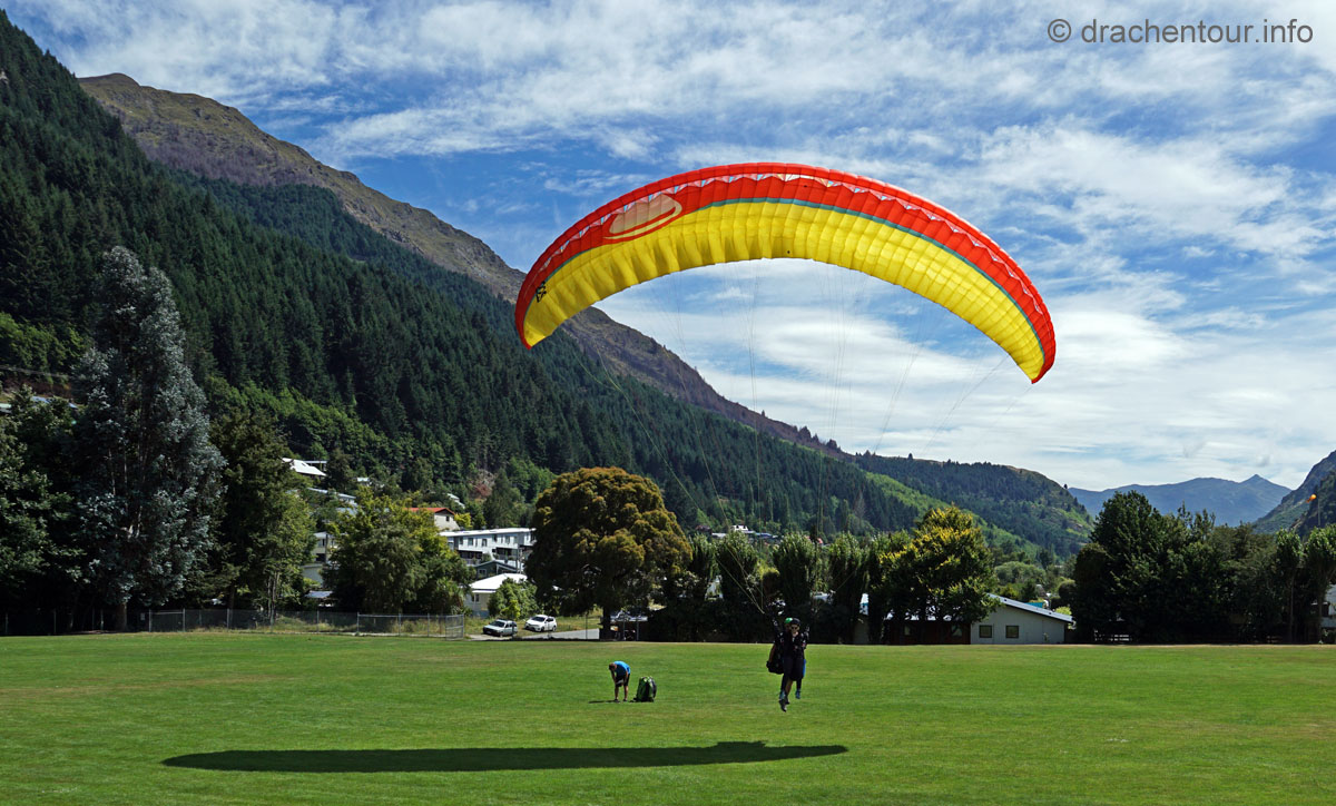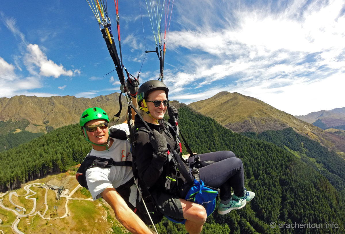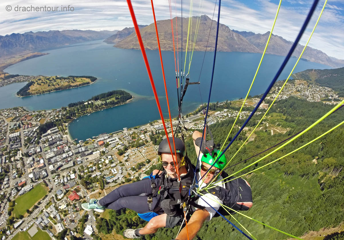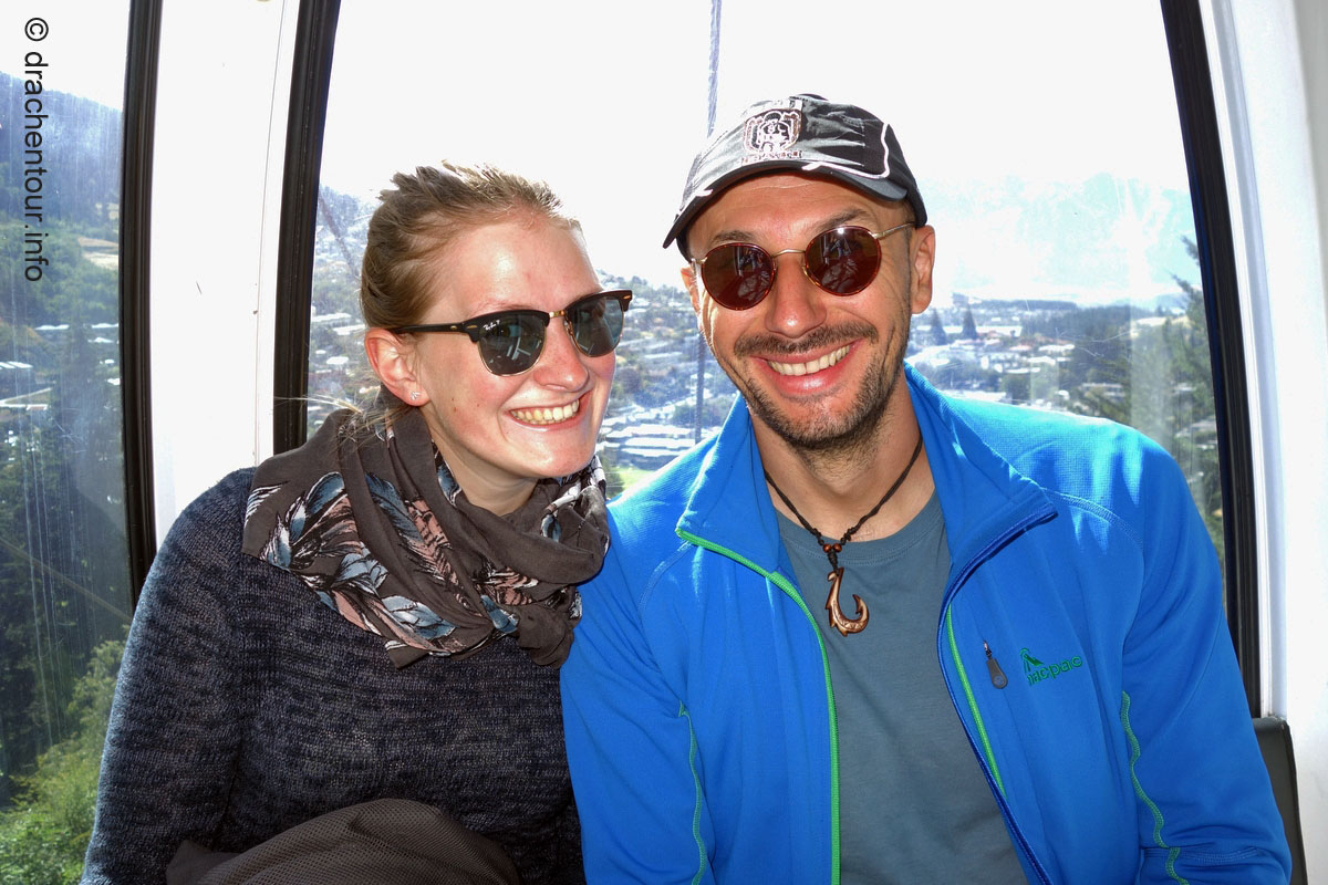 Wie schon erwähnt, bietet Queenstown eine unermessliche Bandbreite an Abenteuern und eines wählte sich Selina darunter aus. Marek und ich wollten ihr zu ihrem Geburtstag und zu ihrem bestandenen Abitur ( jipiii ! ) ein besonderes Geschenk bereiten, so kam es dazu, dass wir ihr einen Gutschein für eine "Besonderheit" in Neuseeland schenkten. Selina löste nach einer kurzen Bedenkzeit den Gutschein ein und beschloss einen Tandemsprung zu wagen. Gesagt getan, das Wetter war optimal und so fuhren bereits um 10 Uhr morgens mit der Gondel in die Berge zum Office der Gleitschirmagentur. Dann ging alles ganz schön schnell und ruck zuck war unsere Nichte mit dem Guide Thomas bereit für den Absprung.