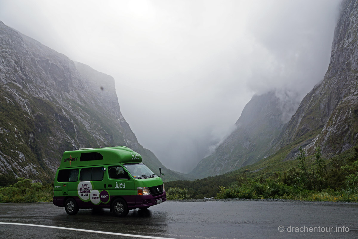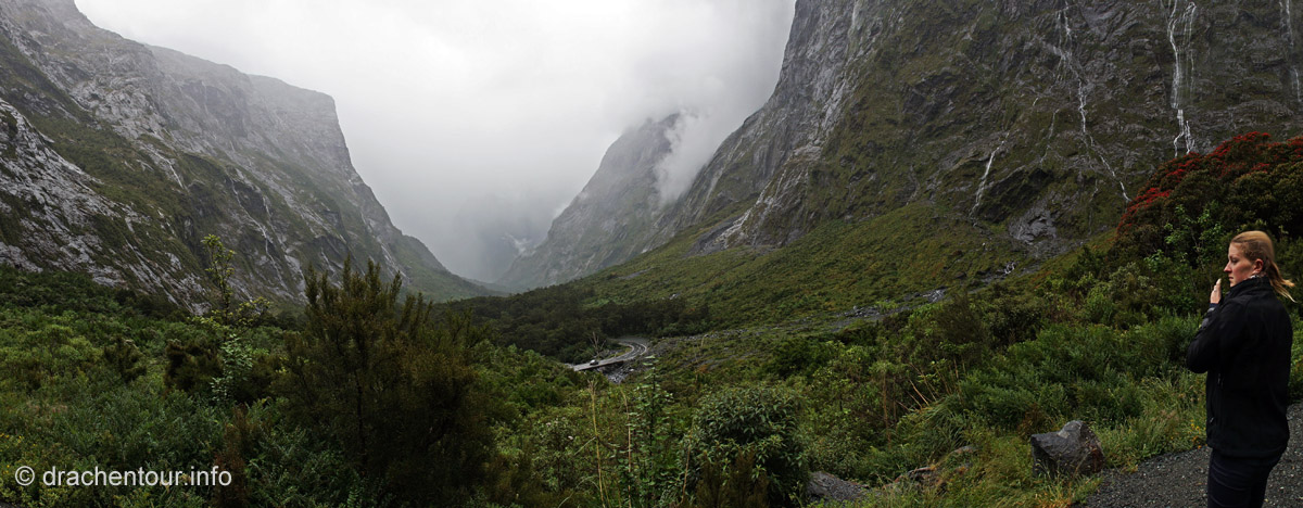 Am nächsten Morgen starteten wir bereits in aller Frühe um gegen 9:00 Uhr am Milford Sound zu sein. Die 120 km lange Straße von Te Anau zum Sound ( Anmerkung der Verfasserin: geografisch korrekt müsste es eigentlich Fjord heißen :-) ) gilt als einer der landschaftlich schönsten von ganz Neuseeland ! Das nicht zu Unrecht, denn trotz unserer müden Augen und dem langsam immer schlechter werdenden Wetter erkannten und bewunderten wir die Schönheit der Landschaft. Wir fuhren entlang des Seeufers hinauf zum aus dem Fels geschlagenen Homer-Tunnel und von dort ab schlängelte sich die Straße virtuell in vielen Serpentinen zum Sound hinunter – grandios ! Das Wetter verschlechterte sich immer mehr und mittlerweile regnete es so sehr, dass der Scheibenwischer auf Hochtouren lief. Wir hegten dennoch die Hoffnung, dass der Himmel aufreißt und die Sonne hervorschaut, aber leider kamen wir auch bei Regen am Sound an.