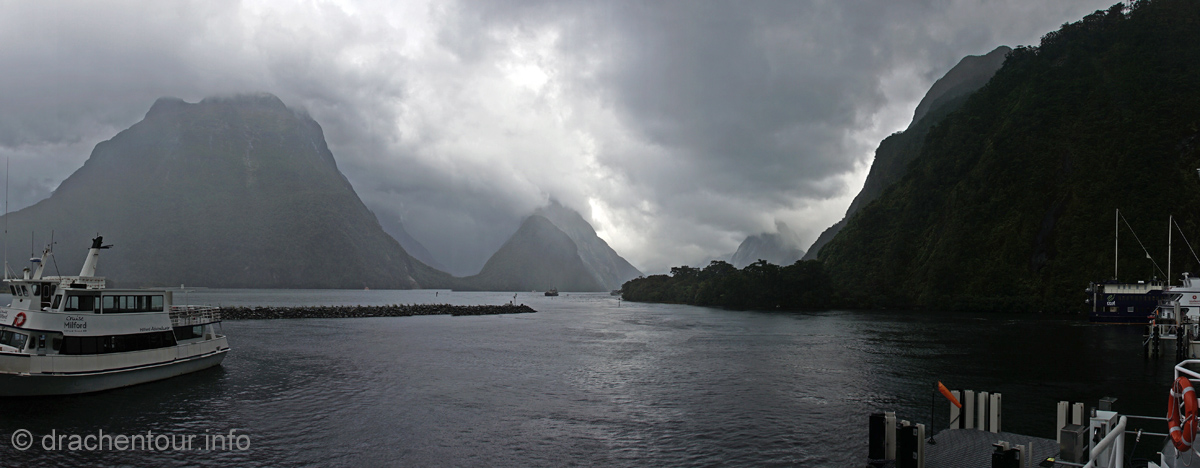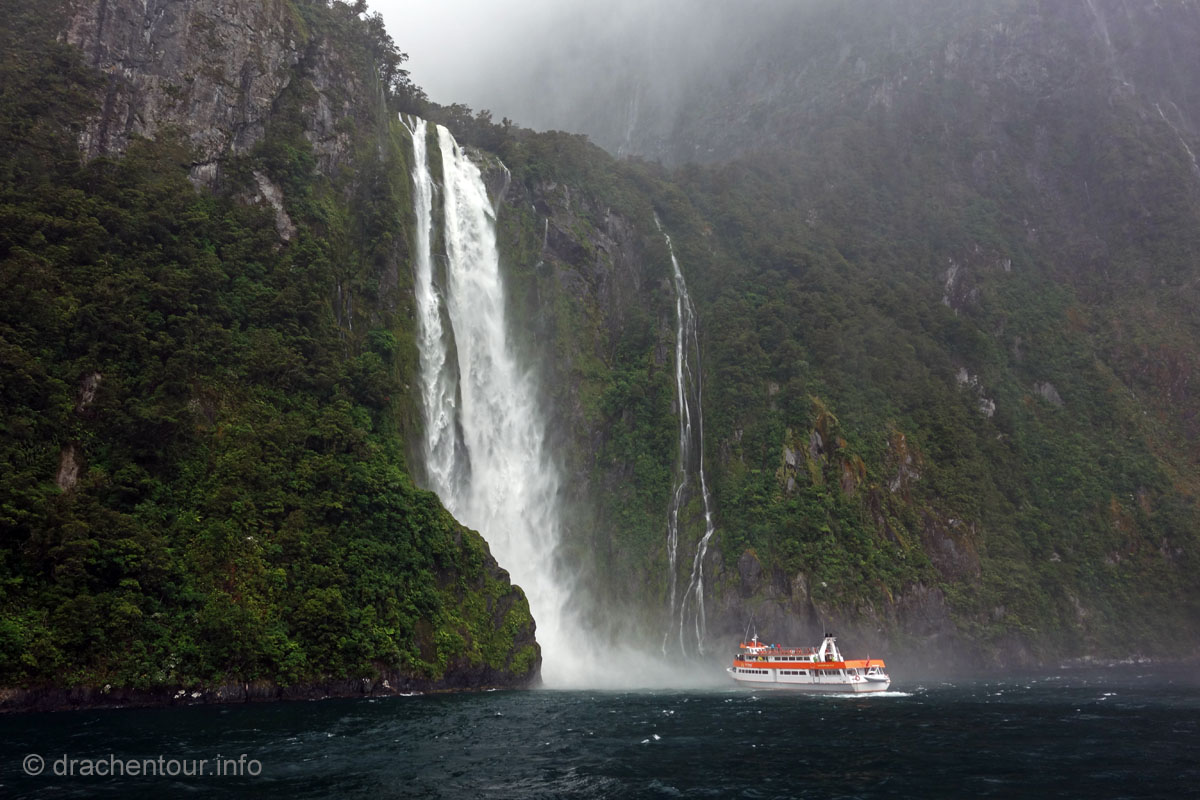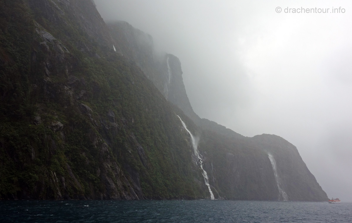 Da hilft alles Gejammer nichts, rein in die Regenklamotten und ab auf das Boot, denn bei einem Bootstrip kann man den Sound am besten erkundschaften. Glück hatten wir dennoch, weil unser Boot über eine große Kabine - so blieben wir fast trocken - und ein Beobachtungsdeck verfügte. Der Milford Sound verzauberte und beeindruckte uns sehr - vielleicht auch gerade wegen diesen vielen dunklen Wolkenbergen - denn sie verzauberten die Landschaft und gaben ihr etwas Mystisch und leicht Gruseliges. Wir nahmen unvergessliche Eindrücke von diesem einmaligen Naturschauspiel mit: wir sahen unzählige herabstürzende Wasserfälle ( so hatte der Regen auch wieder etwas Gutes :-) ), beeindruckende Felswände, die in die Tiefe des Fjordes fallen und auch die stolzen Gipfel konnten wir zum Teil leicht durch die Wolkenschicht hindurch erahnen. So wurde die Mission " Milford Sound " zu einem, ganz besonderen Erlebnis und wir waren happy.