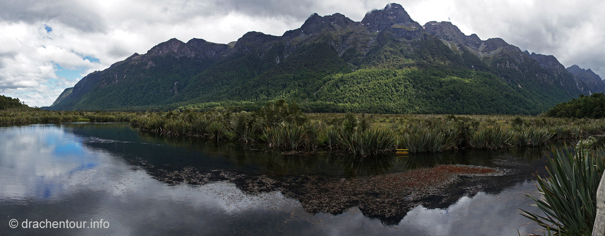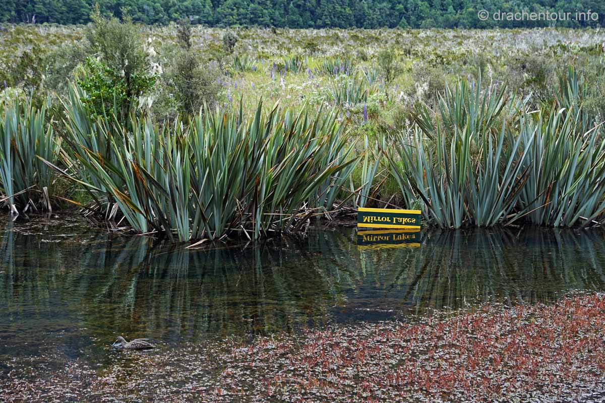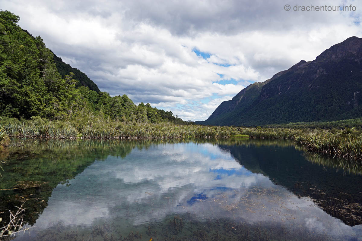 Auch die Rückfahrt war wieder faszinierend, überall stürzten Wassermassen die Felswände herunter, das war unglaublich spannend. Langsam näherten wir uns Te Anau und das Wetter wurde wieder besser und es hörte auf zu regnen. So konnten wir noch einen Zwischenstopp bei den “ Mirror Lakes “ einlegen. Warum diese Seen genau so heißen, ist ganz klar den Bildern zu entnehmen, mal wieder zieht uns die Natur in ihren Bann :-). Te Anau begrüßte uns wieder mit einem blauen Himmel und Sonnenschein, supi !