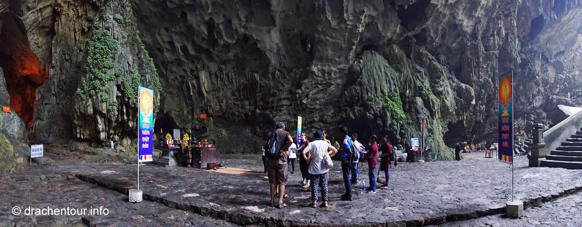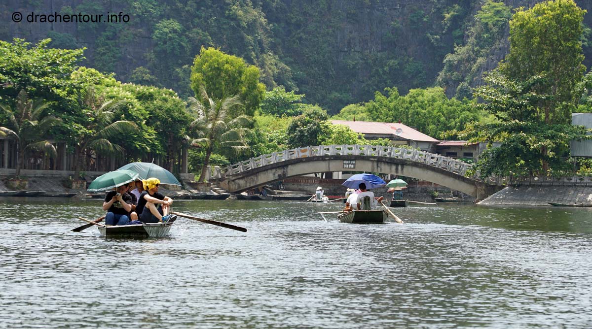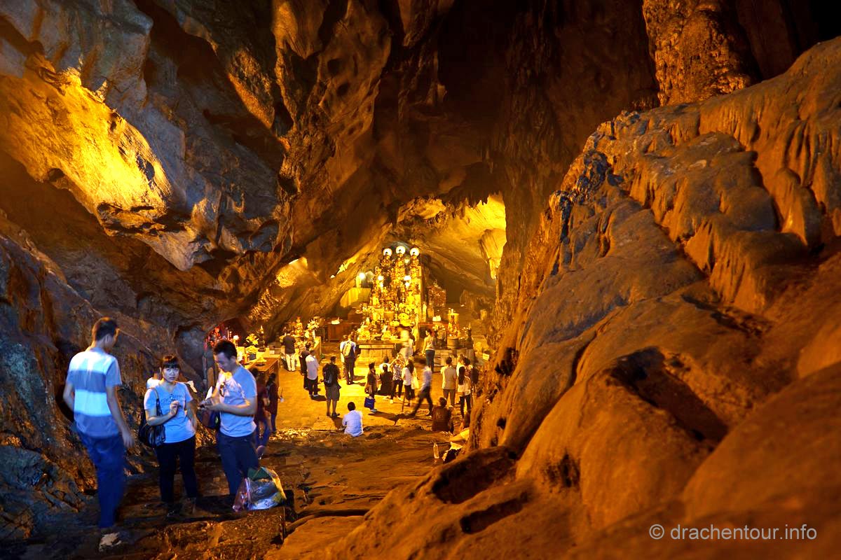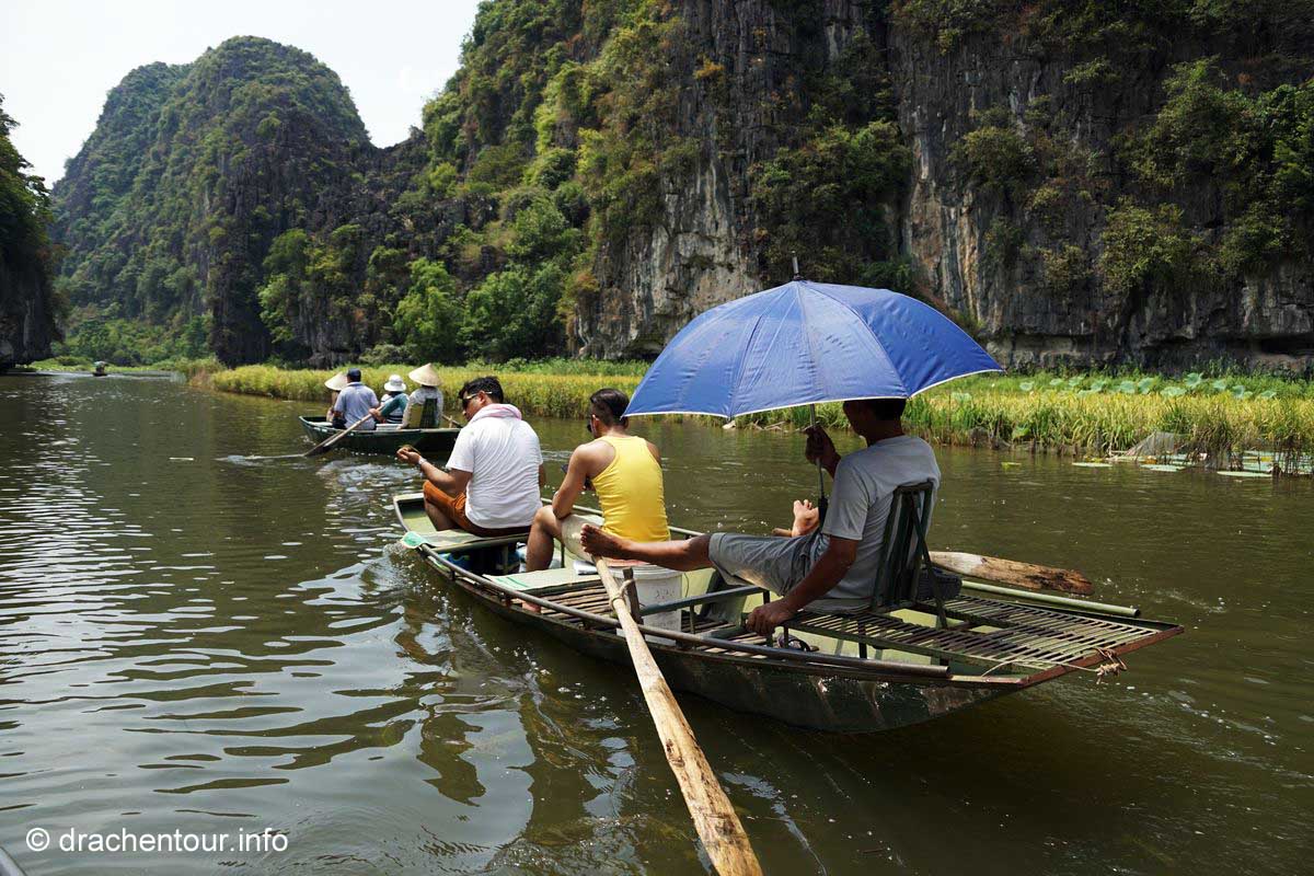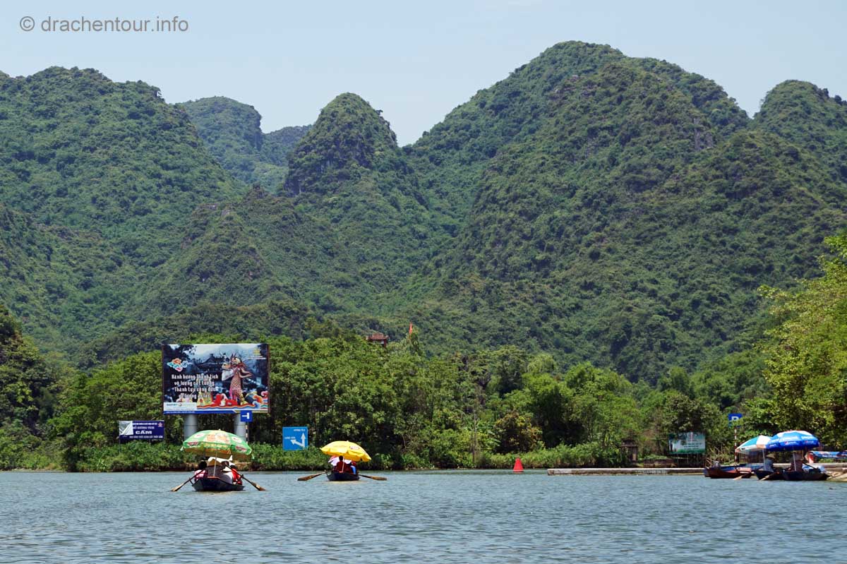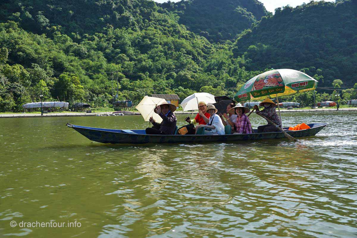 Nach den positiven Eindrücken der gestrigen Tour wagten wir uns heute wieder zu einer, wir besuchten die Parfüm-Pagode. Das tolle bei dieser Tour soll sein, dass man auf einen Berg wandert und von dort einen schönen Blick auf die mit Karstfelsen versetzte Landschaft haben soll, das wurde uns zumindest so zugesichert. Doch zunächst mussten wir erst wieder die lange Anfahrt hinter uns bringen, es ging in die ähnliche Richtung, wie gestern. An unserem Ziel Ben Duc angekommen, wurden wir erneut in kleine Boote verfrachtet und über den Yen Vy Fluss gerudert, wieder von Einheimischen, die eine eigenartige Rudertechnik hatten, sie ruderten mit den Füssen. Leider war die Bootsfahrt eher langweilig, die Landschaft weniger spektakulär und der Fluss war verschmutzt und es schwamm viel Müll darin. Mittags ging es dann endlich auf den Berg zu der Parfüm-Pagode, mit einer Gondel !! In Anbetracht der enormen Hitze waren wir sogar recht dankbar für diesen Service. Oben besichtigten wir die Pagode, die eine Höhle ist und unser Guide erklärte uns einiges Wissenswertes über die Pagode. Uns beeindruckte der Tempel mit seinen vielen goldenen Buddhas, die die Höhle zu einem religiösen und spirituellen Ort verwandelten. Wir hielten uns einige Zeit dort auf, bevor uns der Guide dann zum Absteigen aufforderte, da waren wir etwas verwirrt und fragten verdutzt nach dem versprochenen Aussichtspunkt. Er meinte, das wäre er und zeigte in die Richtung der Bergstation der Gondel. Von dort hatten wir allerdings überhaupt keine Aussicht, d.h. lediglich auf die Gondel und die Bäume, da waren wir doch sehr enttäuscht. Dann mussten wir zunächst wieder dieselbe langweilige Strecke mit dem Boot und anschließend mit dem Minibus zurück. Ja, das war in der Tat ein Ausflug, wie er keinem Spaß machte, das Gute war, dass wir nette Menschen aus UK und den USA kennengelernt haben. Dennoch können wir von dieser Tour nur abraten. Wieder in unserem traumhaften Hotel angekommen, wurden wir freundlich begrüßt und das nette Lachen der Angestellten heiterte uns auf, so dass wir den Tag mit einem schönen Abend abschließen konnten.