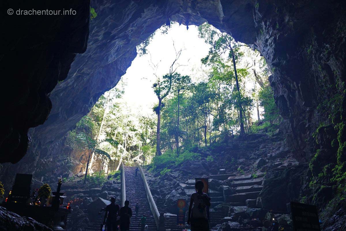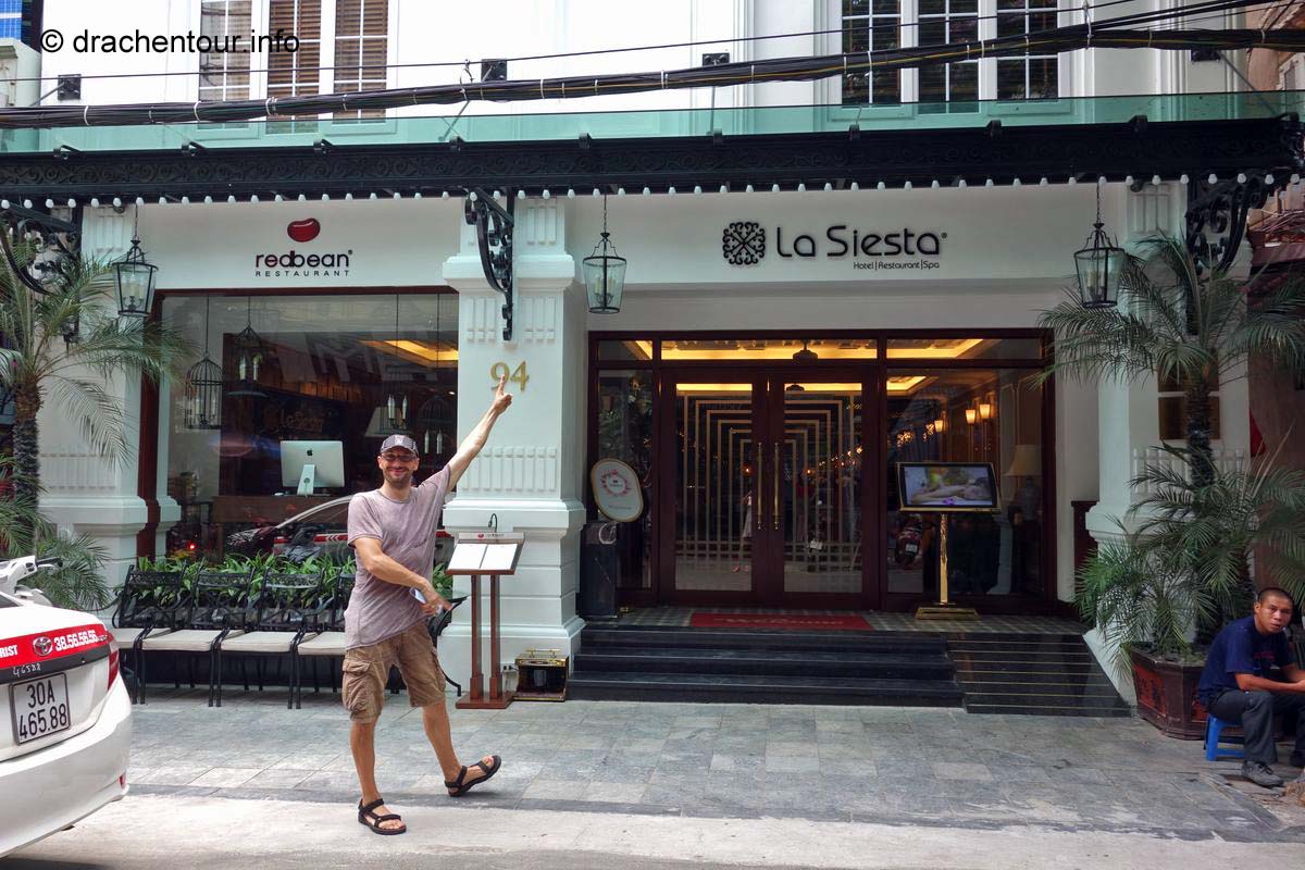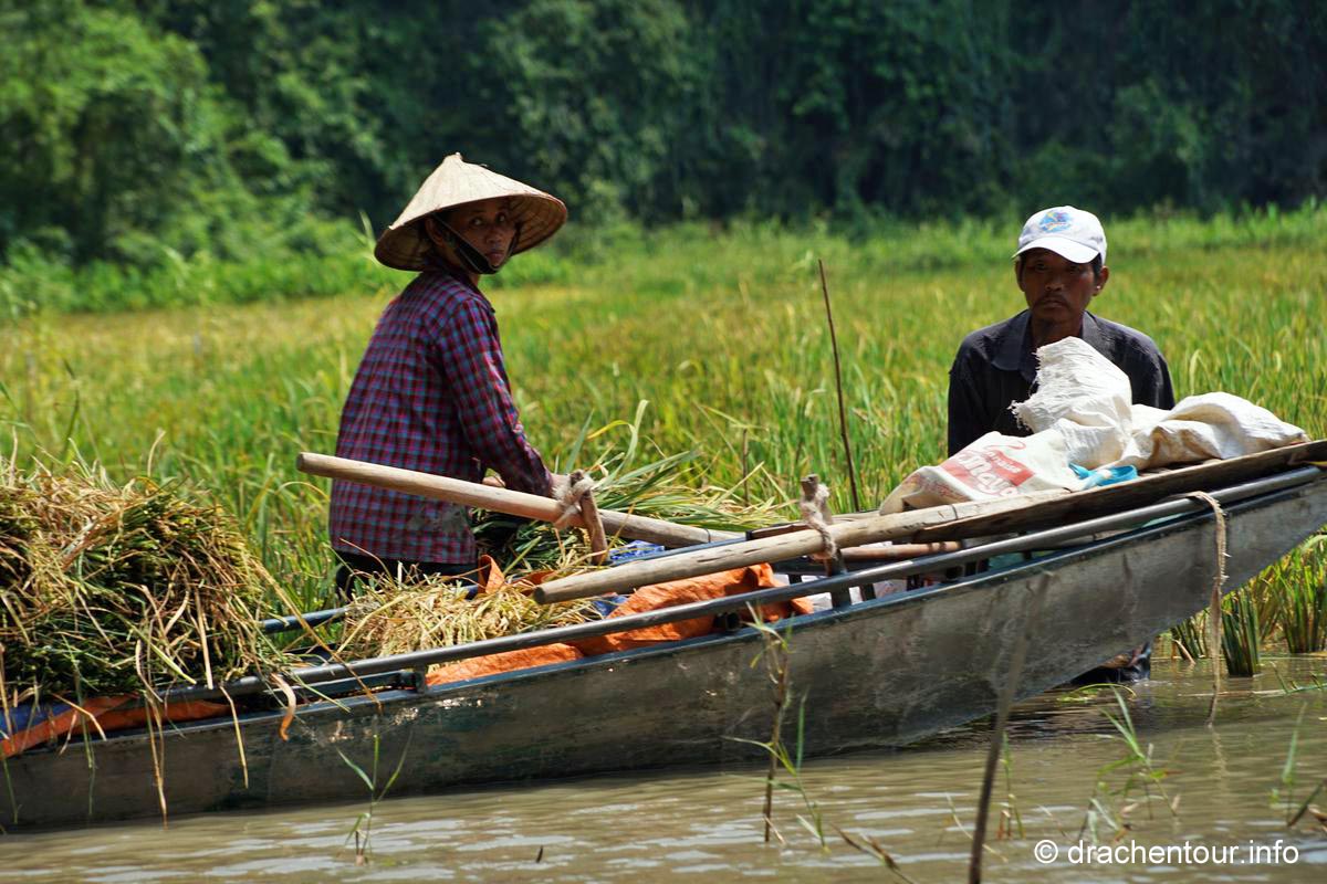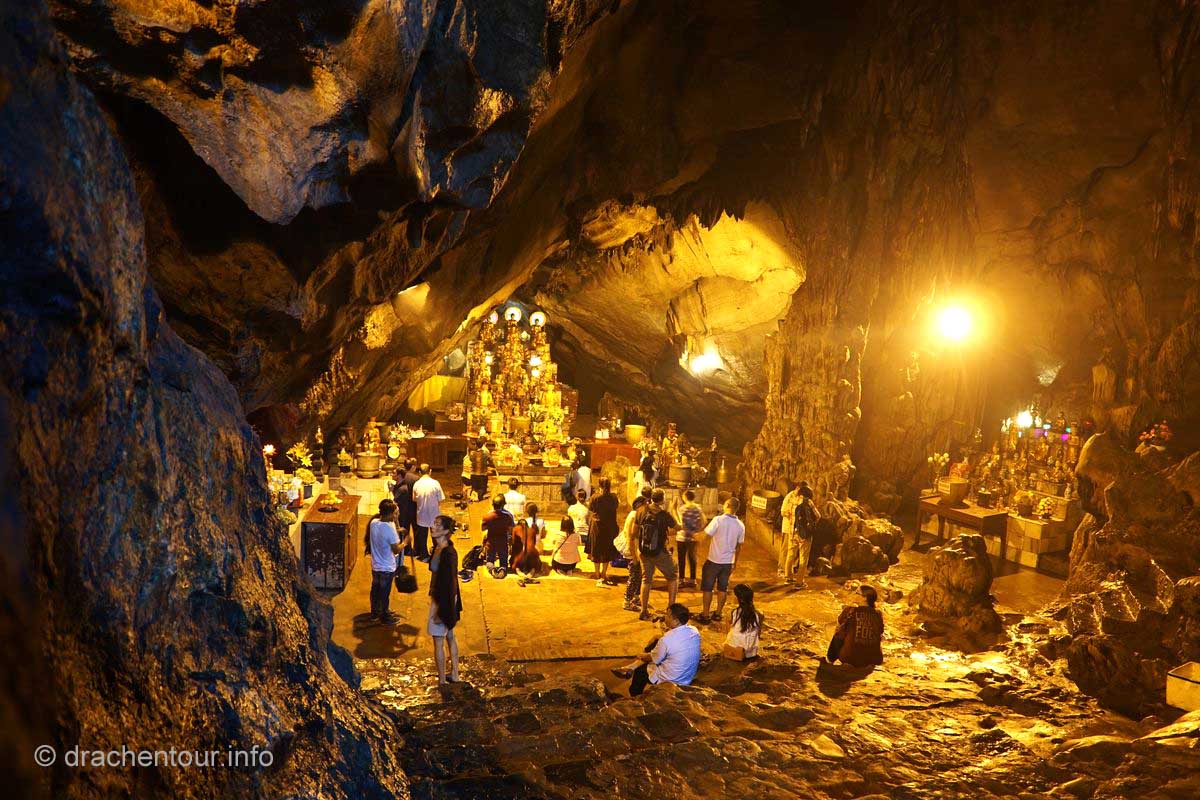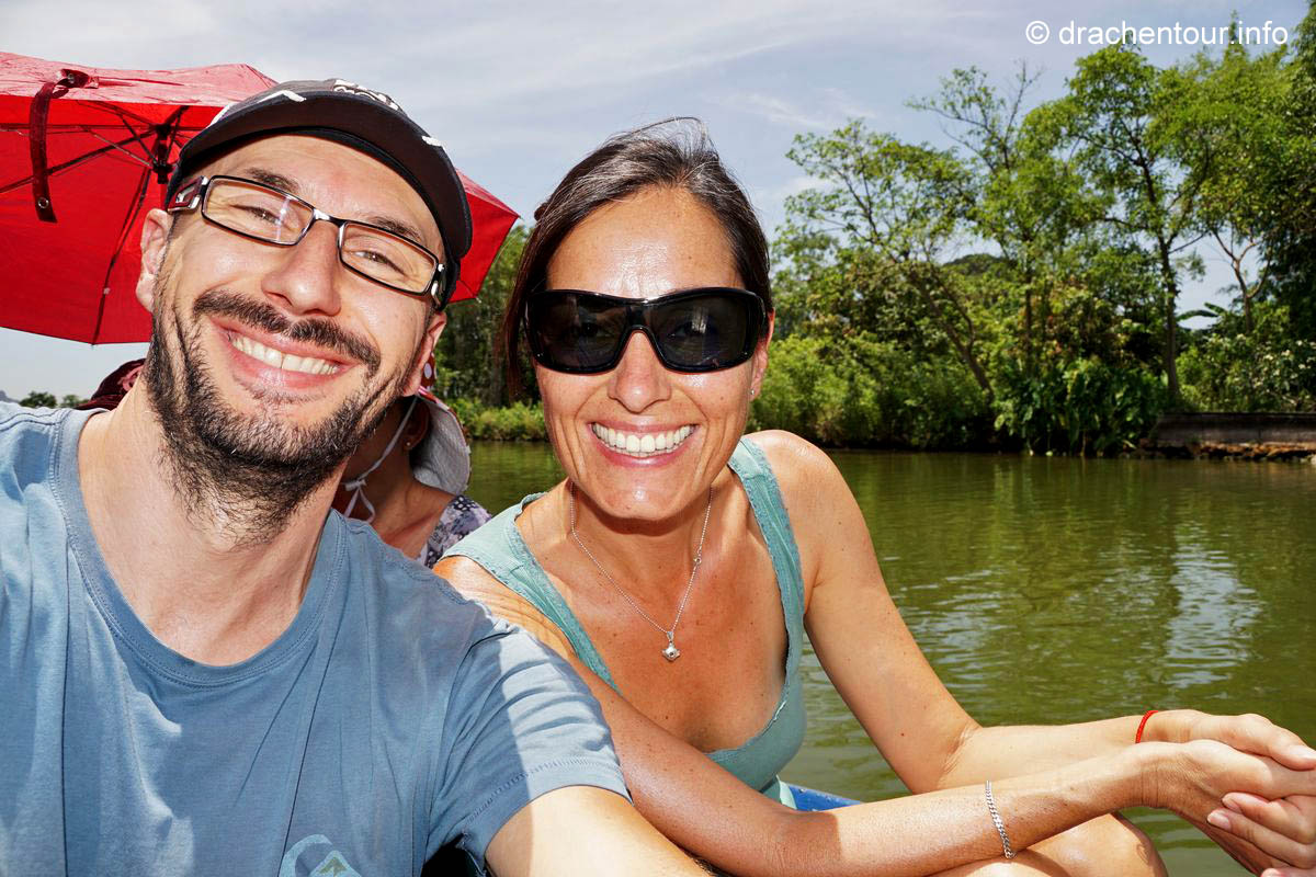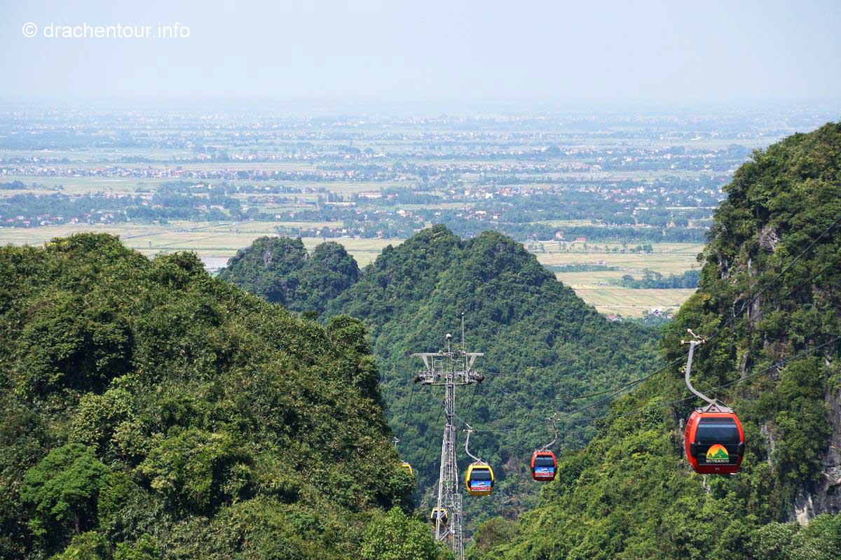 Nach den positiven Eindrücken der gestrigen Tour wagten wir uns heute wieder zu einer, wir besuchten die Parfüm-Pagode. Das tolle bei dieser Tour soll sein, dass man auf einen Berg wandert und von dort einen schönen Blick auf die mit Karstfelsen versetzte Landschaft haben soll, das wurde uns zumindest so zugesichert. Doch zunächst mussten wir erst wieder die lange Anfahrt hinter uns bringen, es ging in die ähnliche Richtung, wie gestern. An unserem Ziel Ben Duc angekommen, wurden wir erneut in kleine Boote verfrachtet und über den Yen Vy Fluss gerudert, wieder von Einheimischen, die eine eigenartige Rudertechnik hatten, sie ruderten mit den Füssen. Leider war die Bootsfahrt eher langweilig, die Landschaft weniger spektakulär und der Fluss war verschmutzt und es schwamm viel Müll darin. Mittags ging es dann endlich auf den Berg zu der Parfüm-Pagode, mit einer Gondel !! In Anbetracht der enormen Hitze waren wir sogar recht dankbar für diesen Service. Oben besichtigten wir die Pagode, die eine Höhle ist und unser Guide erklärte uns einiges Wissenswertes über die Pagode. Uns beeindruckte der Tempel mit seinen vielen goldenen Buddhas, die die Höhle zu einem religiösen und spirituellen Ort verwandelten. Wir hielten uns einige Zeit dort auf, bevor uns der Guide dann zum Absteigen aufforderte, da waren wir etwas verwirrt und fragten verdutzt nach dem versprochenen Aussichtspunkt. Er meinte, das wäre er und zeigte in die Richtung der Bergstation der Gondel. Von dort hatten wir allerdings überhaupt keine Aussicht, d.h. lediglich auf die Gondel und die Bäume, da waren wir doch sehr enttäuscht. Dann mussten wir zunächst wieder dieselbe langweilige Strecke mit dem Boot und anschließend mit dem Minibus zurück. Ja, das war in der Tat ein Ausflug, wie er keinem Spaß machte, das Gute war, dass wir nette Menschen aus UK und den USA kennengelernt haben. Dennoch können wir von dieser Tour nur abraten. Wieder in unserem traumhaften Hotel angekommen, wurden wir freundlich begrüßt und das nette Lachen der Angestellten heiterte uns auf, so dass wir den Tag mit einem schönen Abend abschließen konnten.