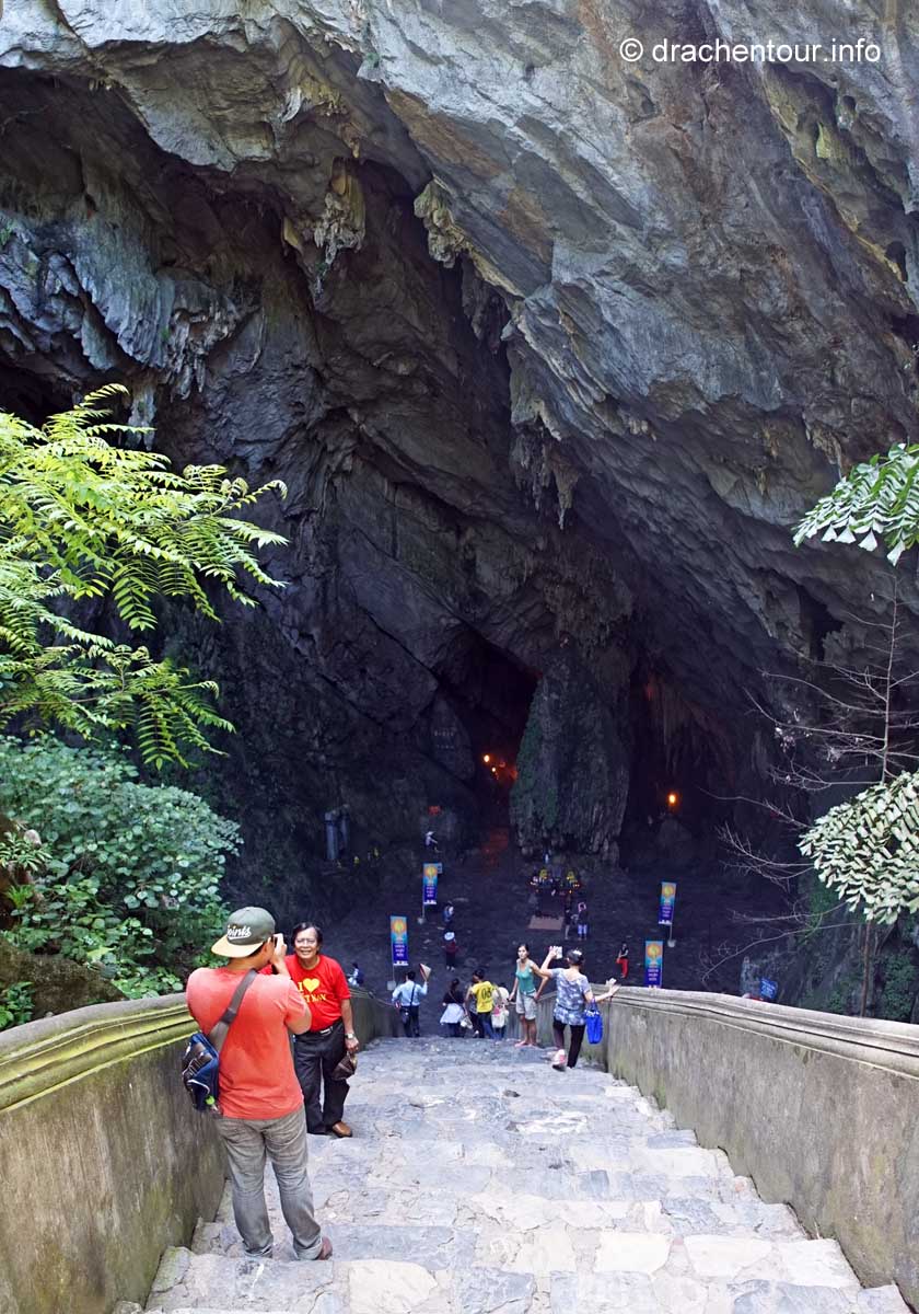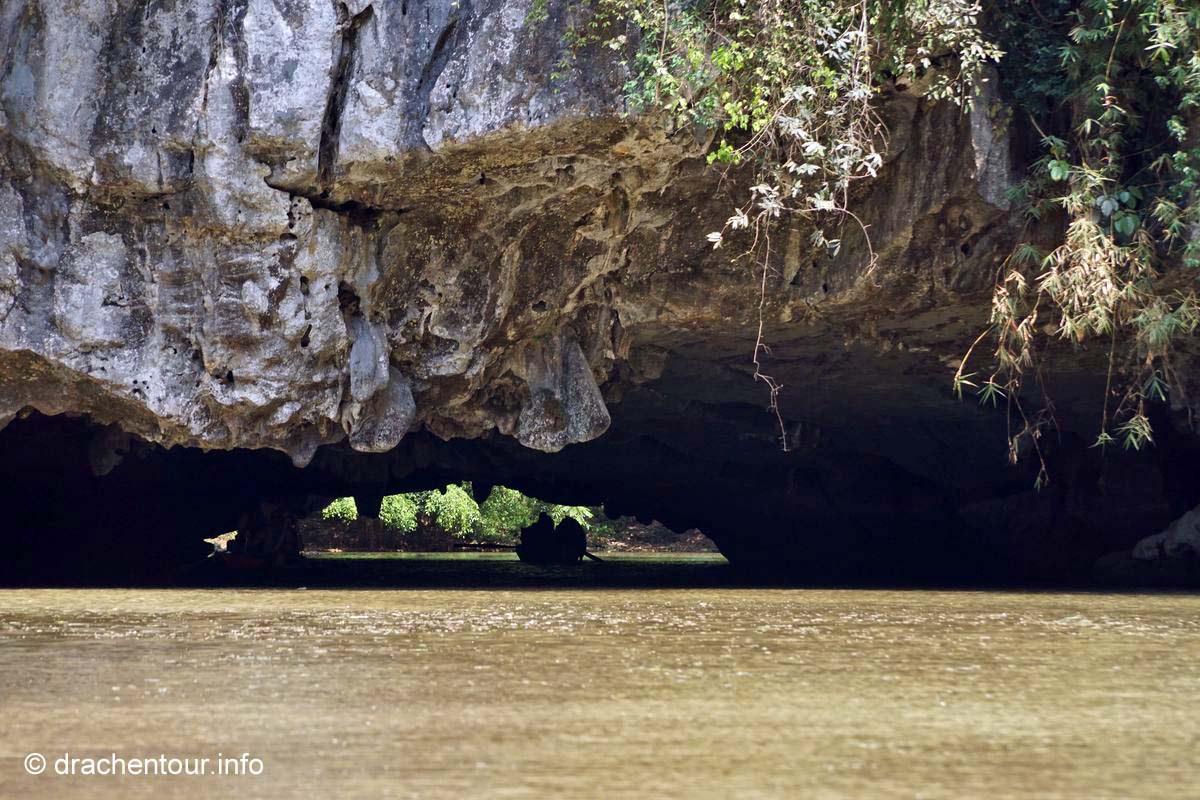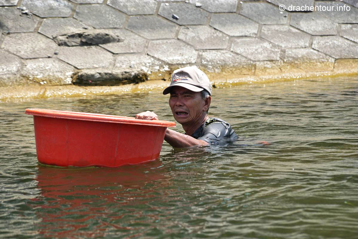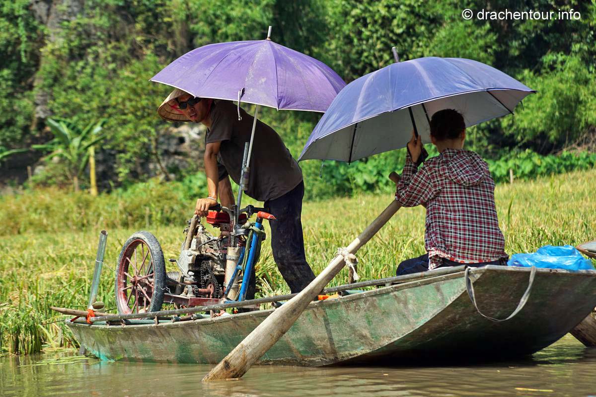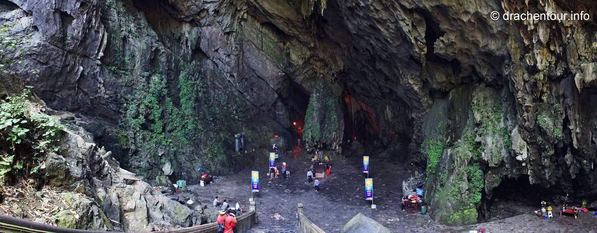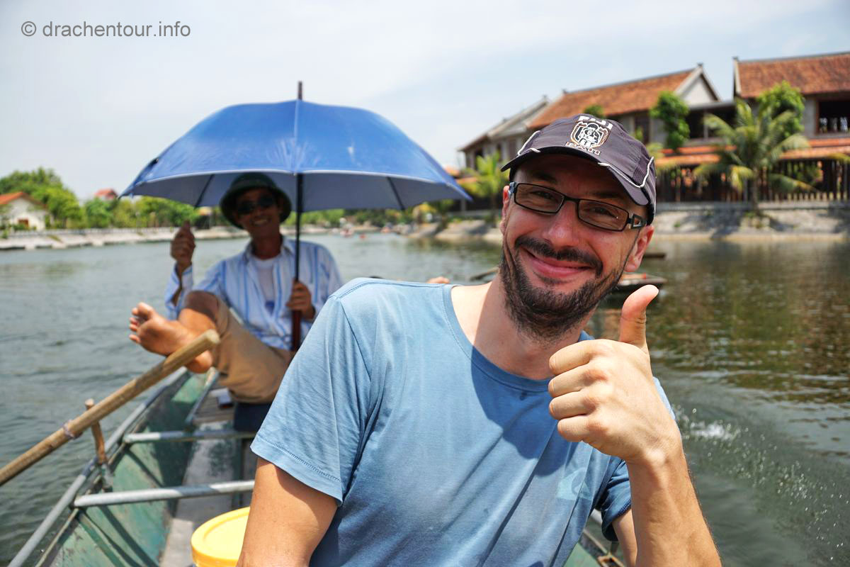 Nach den positiven Eindrücken der gestrigen Tour wagten wir uns heute wieder zu einer, wir besuchten die Parfüm-Pagode. Das tolle bei dieser Tour soll sein, dass man auf einen Berg wandert und von dort einen schönen Blick auf die mit Karstfelsen versetzte Landschaft haben soll, das wurde uns zumindest so zugesichert. Doch zunächst mussten wir erst wieder die lange Anfahrt hinter uns bringen, es ging in die ähnliche Richtung, wie gestern. An unserem Ziel Ben Duc angekommen, wurden wir erneut in kleine Boote verfrachtet und über den Yen Vy Fluss gerudert, wieder von Einheimischen, die eine eigenartige Rudertechnik hatten, sie ruderten mit den Füssen. Leider war die Bootsfahrt eher langweilig, die Landschaft weniger spektakulär und der Fluss war verschmutzt und es schwamm viel Müll darin. Mittags ging es dann endlich auf den Berg zu der Parfüm-Pagode, mit einer Gondel !! In Anbetracht der enormen Hitze waren wir sogar recht dankbar für diesen Service. Oben besichtigten wir die Pagode, die eine Höhle ist und unser Guide erklärte uns einiges Wissenswertes über die Pagode. Uns beeindruckte der Tempel mit seinen vielen goldenen Buddhas, die die Höhle zu einem religiösen und spirituellen Ort verwandelten. Wir hielten uns einige Zeit dort auf, bevor uns der Guide dann zum Absteigen aufforderte, da waren wir etwas verwirrt und fragten verdutzt nach dem versprochenen Aussichtspunkt. Er meinte, das wäre er und zeigte in die Richtung der Bergstation der Gondel. Von dort hatten wir allerdings überhaupt keine Aussicht, d.h. lediglich auf die Gondel und die Bäume, da waren wir doch sehr enttäuscht. Dann mussten wir zunächst wieder dieselbe langweilige Strecke mit dem Boot und anschließend mit dem Minibus zurück. Ja, das war in der Tat ein Ausflug, wie er keinem Spaß machte, das Gute war, dass wir nette Menschen aus UK und den USA kennengelernt haben. Dennoch können wir von dieser Tour nur abraten. Wieder in unserem traumhaften Hotel angekommen, wurden wir freundlich begrüßt und das nette Lachen der Angestellten heiterte uns auf, so dass wir den Tag mit einem schönen Abend abschließen konnten.