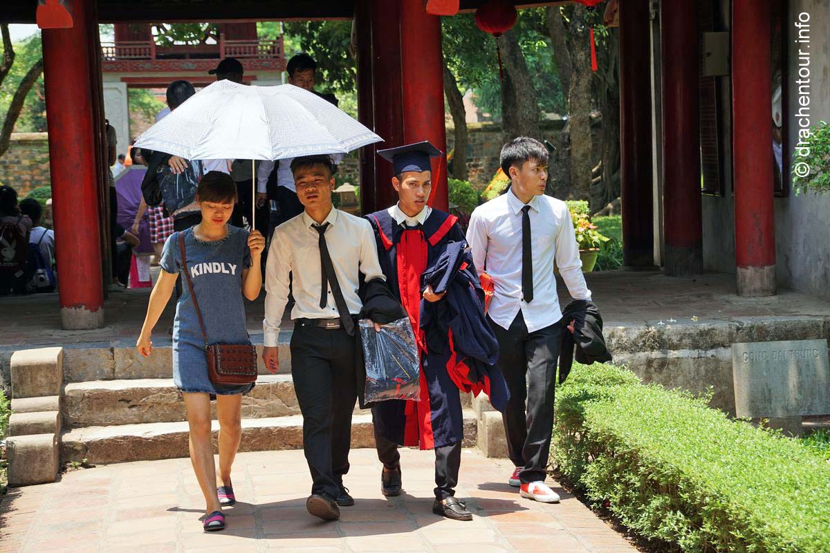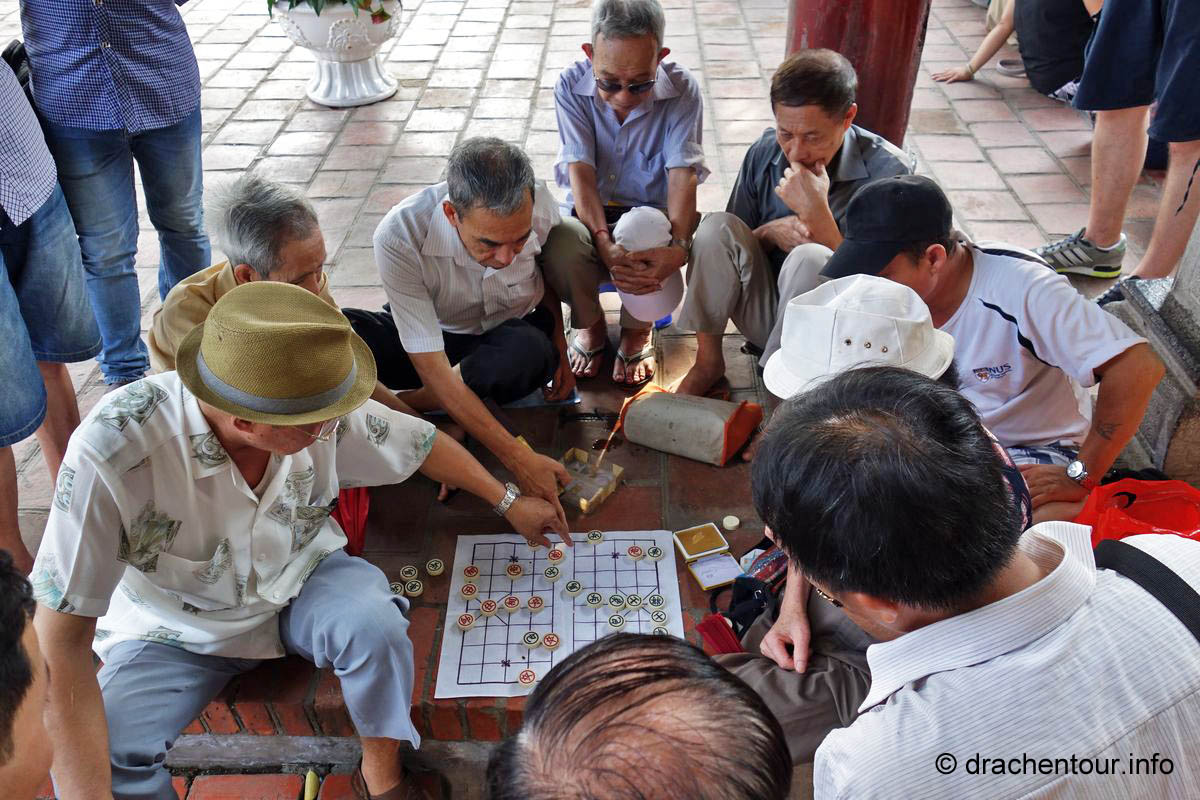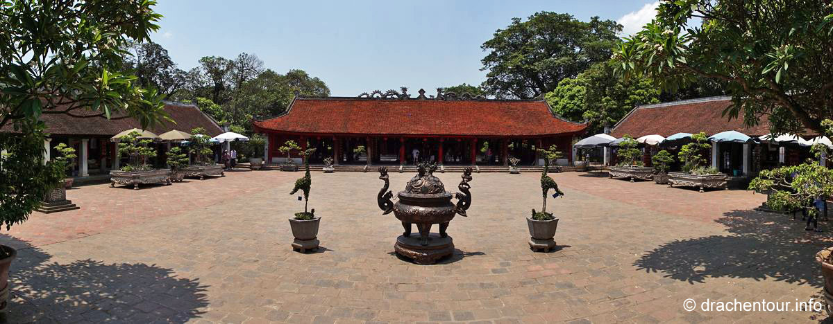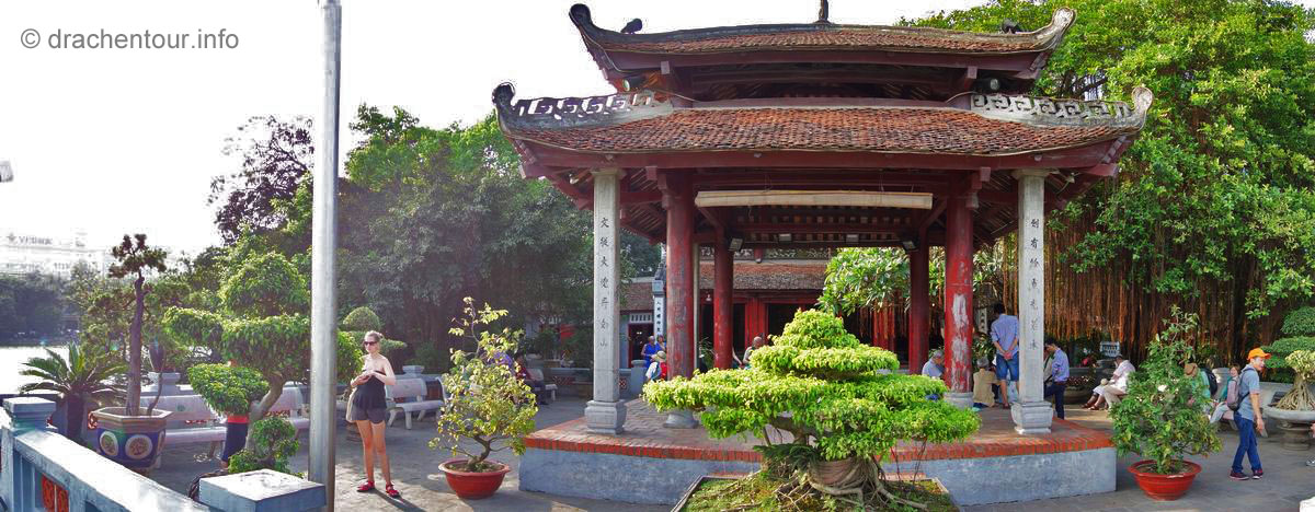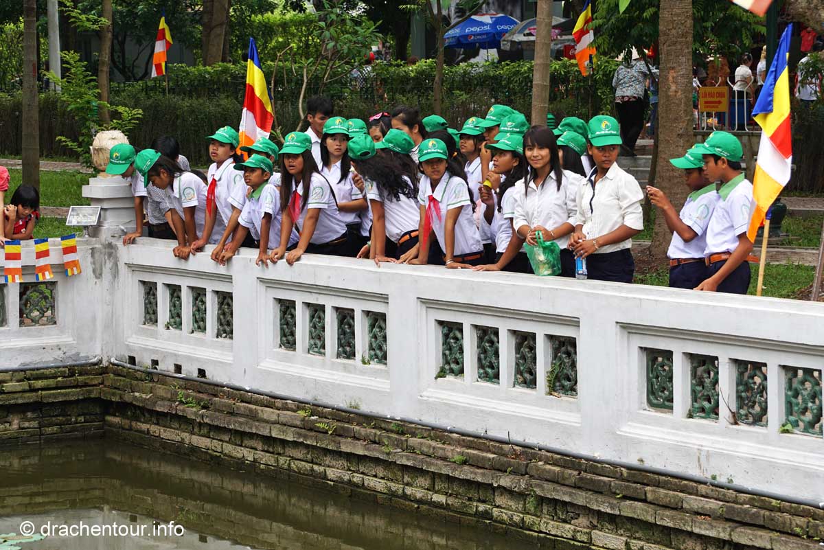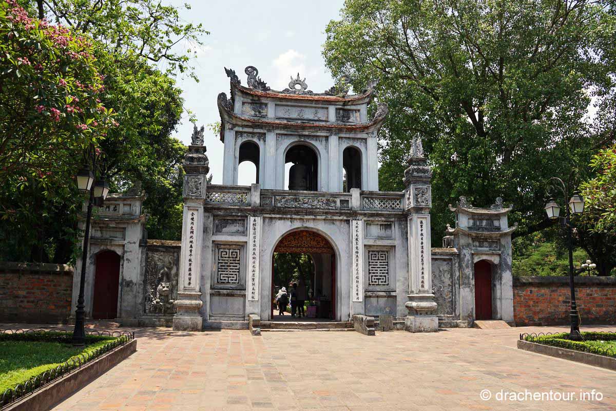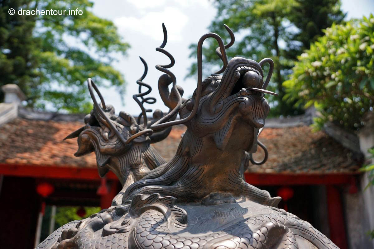 Nach den sehr gemütlichen und gut organisierten Tagen auf dem Luxusboot in der Ha Long Bay waren wir wieder fit für das volle Leben in der Stadt. So besuchten wir gleich am Morgen nach dem Frühstück den Literaturtempel Van Mieu, wir erhofften uns die Anlage noch bei angenehmeren Temperaturen besichtigen zu können, aber das blieb dann doch eher ein Wunsch, denn kaum waren wir am Tempel angelangt, waren wir wieder schweißgebadet. Ursprünglich wurde die Anlage als konfuzianischer Tempel erbaut, bevor er zur ersten Universität von Vietnam erklärt wurde. Er gilt auch heute noch als wichtigster Literaturtempel des Landes. Wir bewunderten mal wieder den wunderschön angelegten Komplex mit seinen vielen Innenhöfen, seinen harmonisch angelegten Gärten, die prachtvolle Konfuzius-Statue und die vielen traumhaft schönen Drachen. An einem schattigen Plätzchen beobachteten wir die Absolventen der Uni und Schüler, die den Tempel mit ihrer Klasse besuchten; trotz den Touristen strahlt der Ort akademisches Flair, Ruhe und Besinnlichkeit aus und wir konnten uns von der Hektik der Stadt und der Hitze etwas erholen.