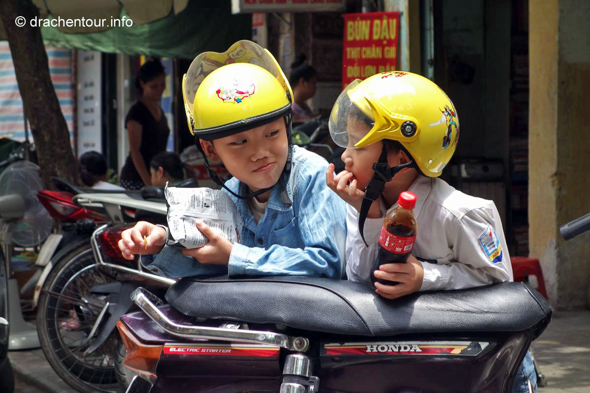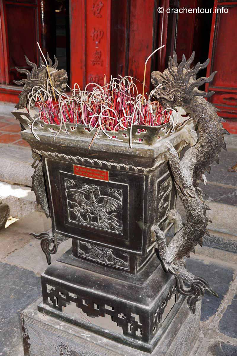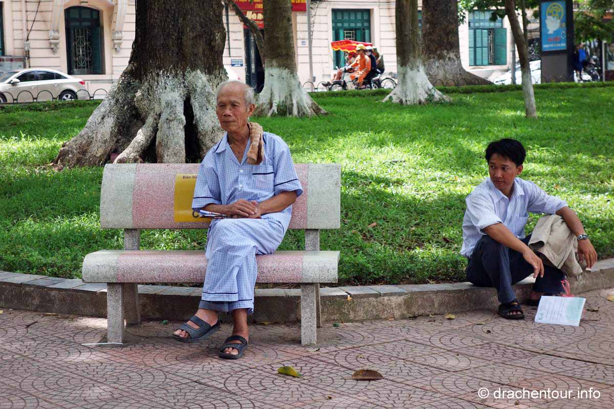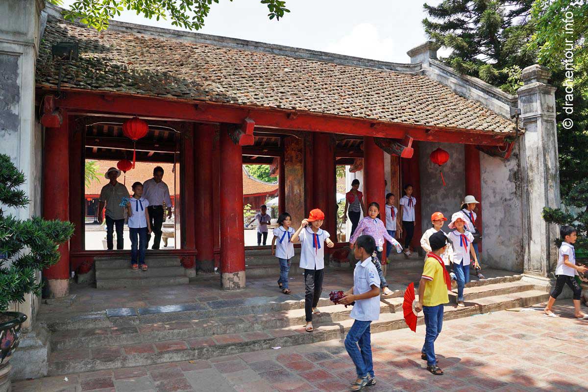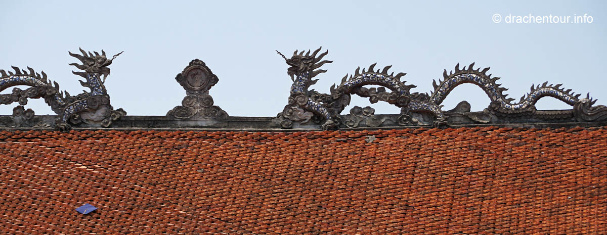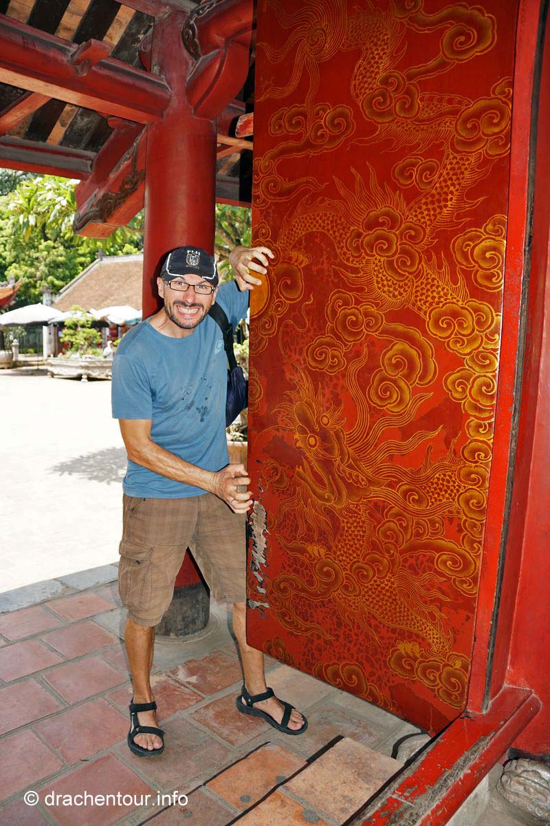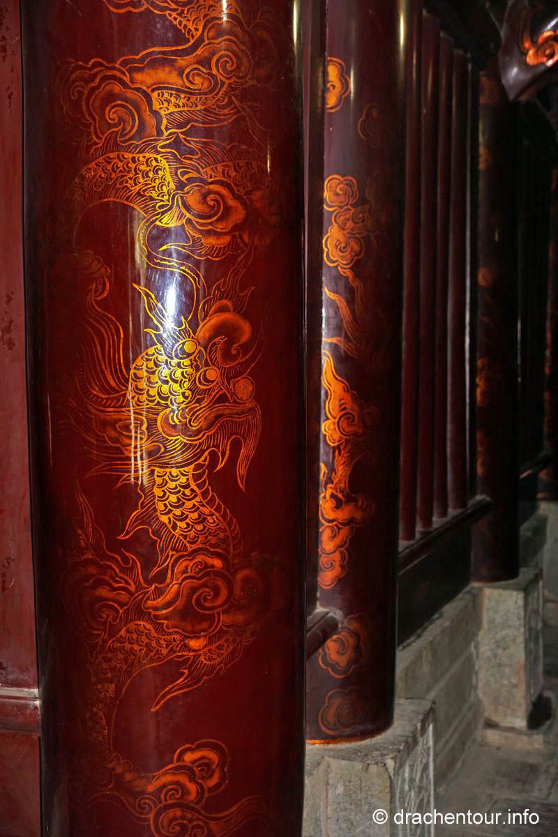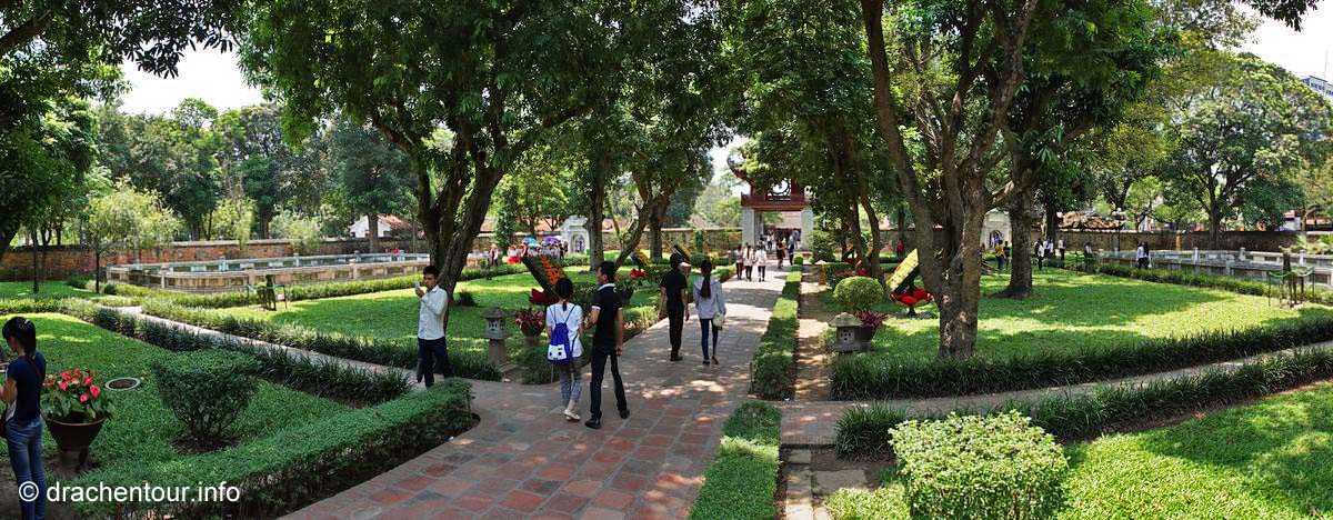 Nach den sehr gemütlichen und gut organisierten Tagen auf dem Luxusboot in der Ha Long Bay waren wir wieder fit für das volle Leben in der Stadt. So besuchten wir gleich am Morgen nach dem Frühstück den Literaturtempel Van Mieu, wir erhofften uns die Anlage noch bei angenehmeren Temperaturen besichtigen zu können, aber das blieb dann doch eher ein Wunsch, denn kaum waren wir am Tempel angelangt, waren wir wieder schweißgebadet. Ursprünglich wurde die Anlage als konfuzianischer Tempel erbaut, bevor er zur ersten Universität von Vietnam erklärt wurde. Er gilt auch heute noch als wichtigster Literaturtempel des Landes. Wir bewunderten mal wieder den wunderschön angelegten Komplex mit seinen vielen Innenhöfen, seinen harmonisch angelegten Gärten, die prachtvolle Konfuzius-Statue und die vielen traumhaft schönen Drachen. An einem schattigen Plätzchen beobachteten wir die Absolventen der Uni und Schüler, die den Tempel mit ihrer Klasse besuchten; trotz den Touristen strahlt der Ort akademisches Flair, Ruhe und Besinnlichkeit aus und wir konnten uns von der Hektik der Stadt und der Hitze etwas erholen.