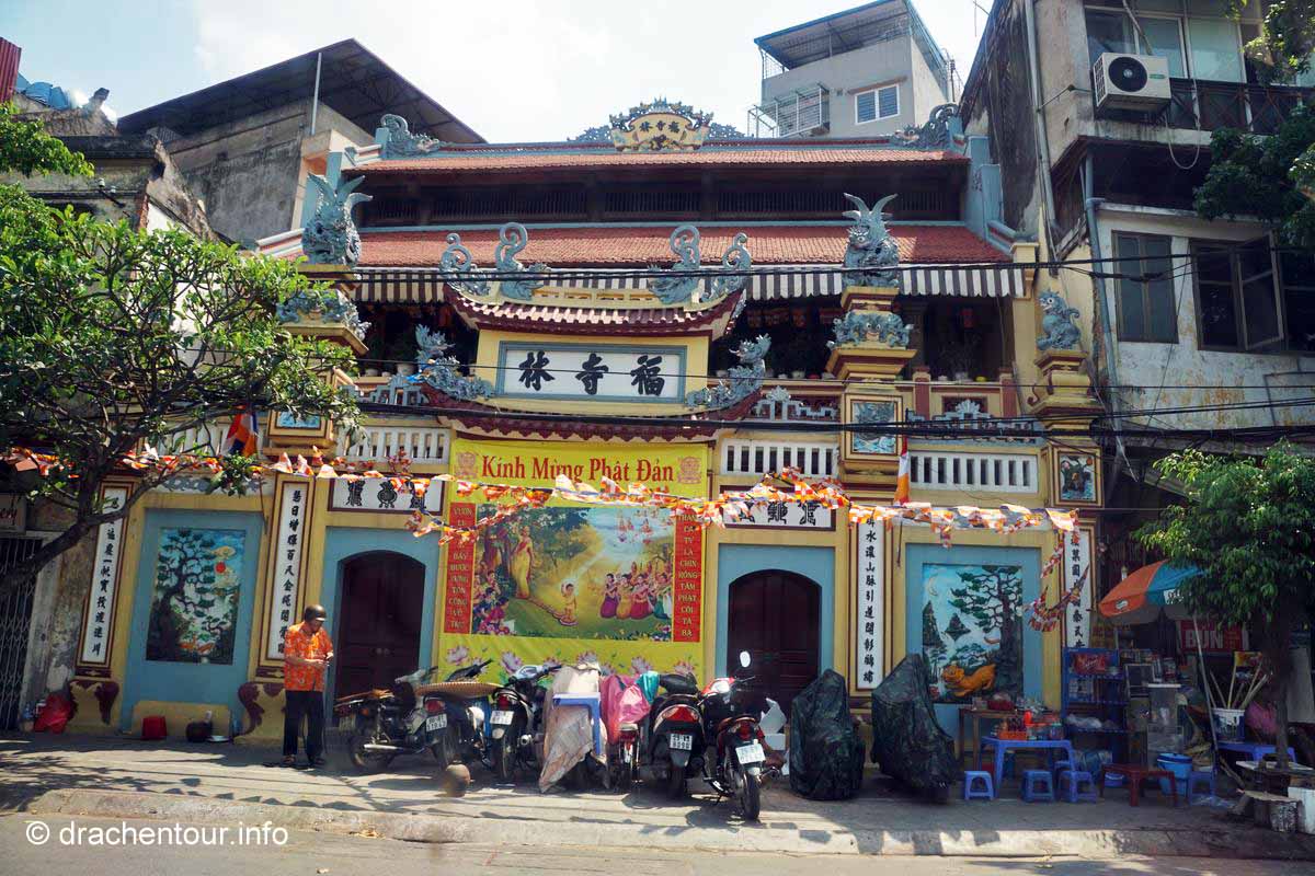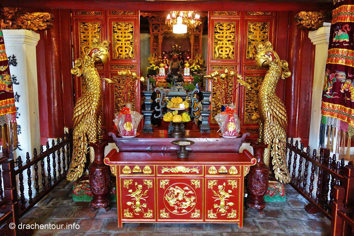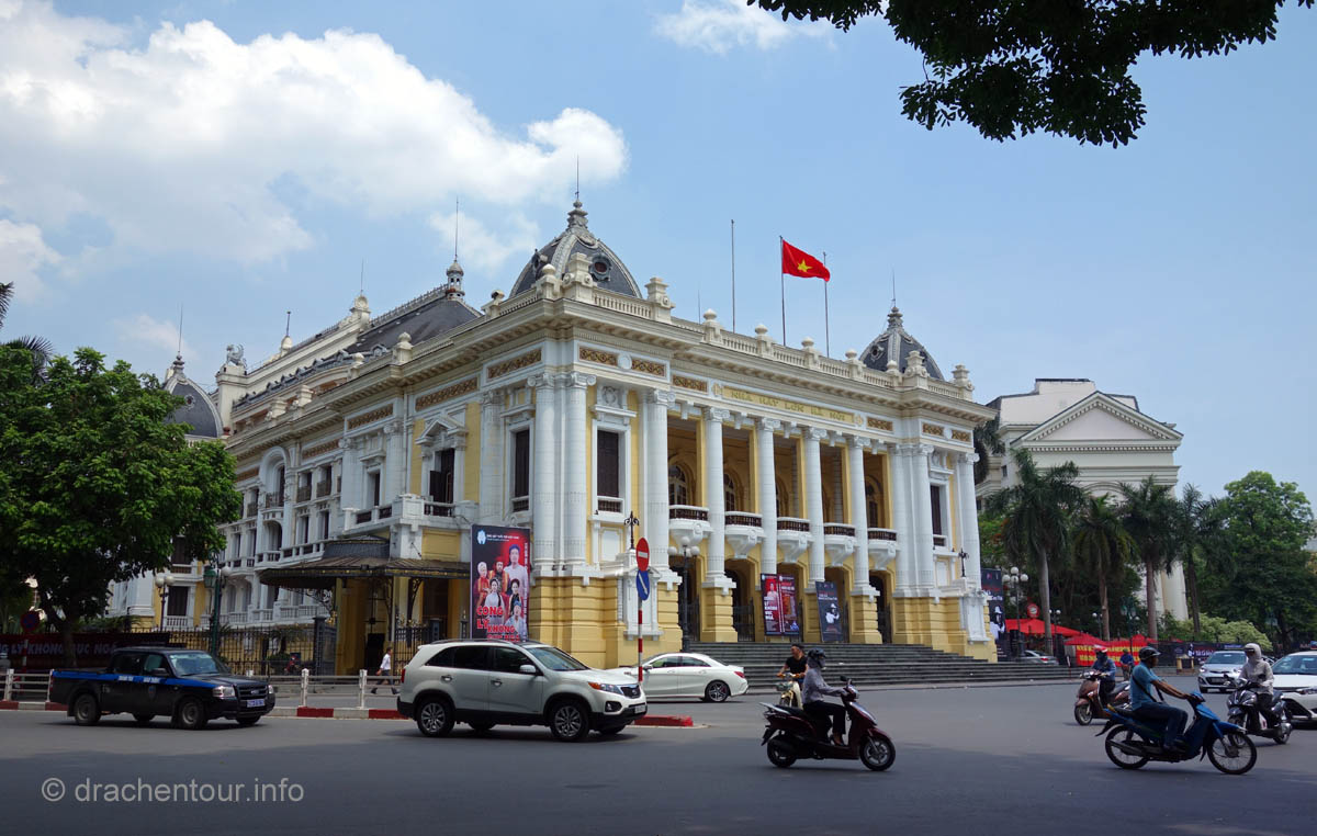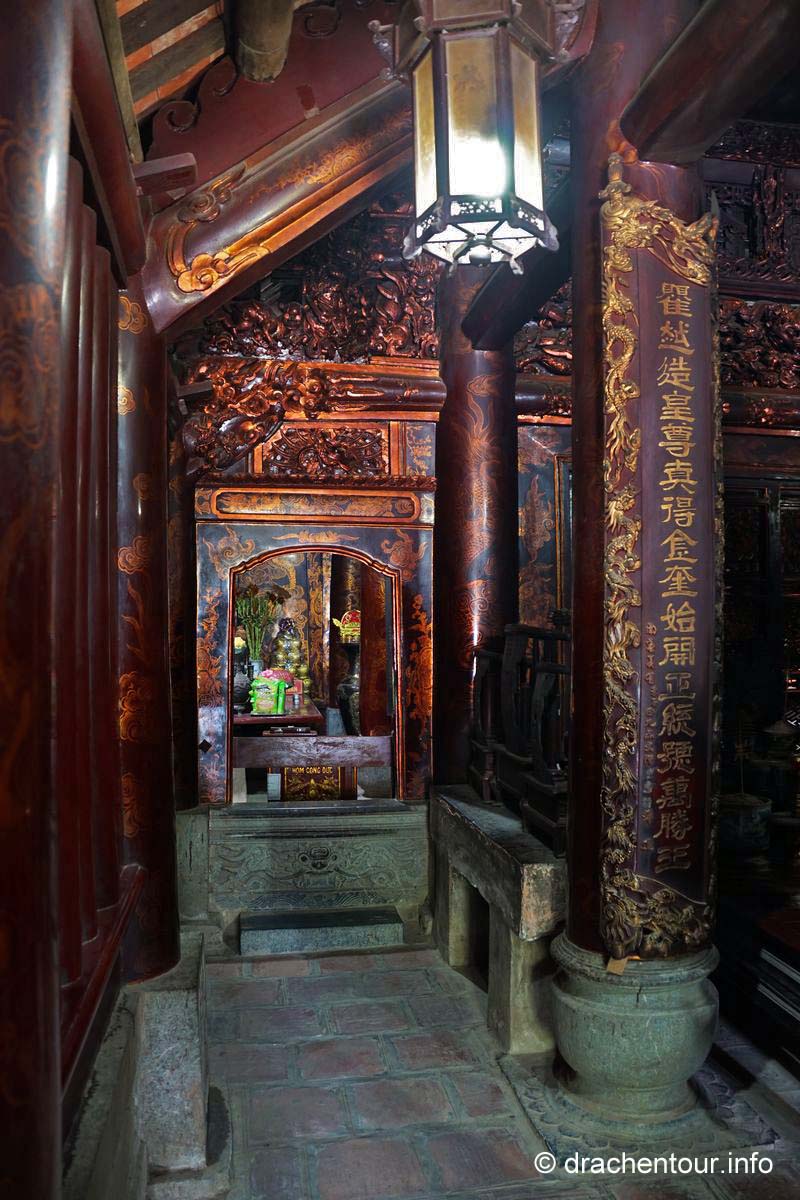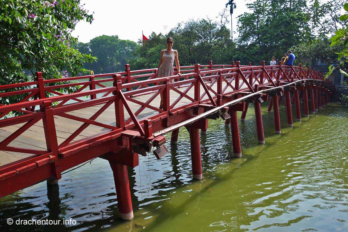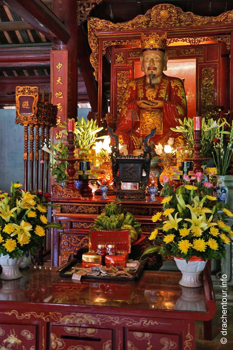 Nach den sehr gemütlichen und gut organisierten Tagen auf dem Luxusboot in der Ha Long Bay waren wir wieder fit für das volle Leben in der Stadt. So besuchten wir gleich am Morgen nach dem Frühstück den Literaturtempel Van Mieu, wir erhofften uns die Anlage noch bei angenehmeren Temperaturen besichtigen zu können, aber das blieb dann doch eher ein Wunsch, denn kaum waren wir am Tempel angelangt, waren wir wieder schweißgebadet. Ursprünglich wurde die Anlage als konfuzianischer Tempel erbaut, bevor er zur ersten Universität von Vietnam erklärt wurde. Er gilt auch heute noch als wichtigster Literaturtempel des Landes. Wir bewunderten mal wieder den wunderschön angelegten Komplex mit seinen vielen Innenhöfen, seinen harmonisch angelegten Gärten, die prachtvolle Konfuzius-Statue und die vielen traumhaft schönen Drachen. An einem schattigen Plätzchen beobachteten wir die Absolventen der Uni und Schüler, die den Tempel mit ihrer Klasse besuchten; trotz den Touristen strahlt der Ort akademisches Flair, Ruhe und Besinnlichkeit aus und wir konnten uns von der Hektik der Stadt und der Hitze etwas erholen.