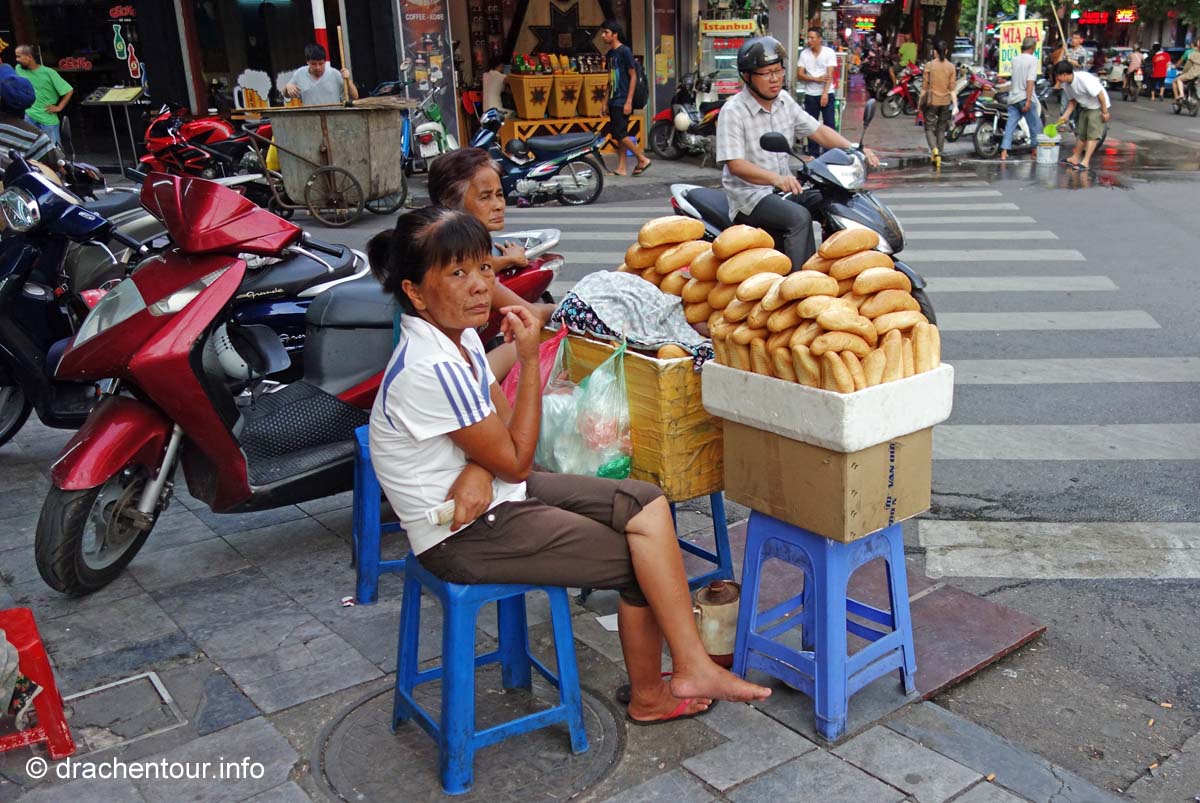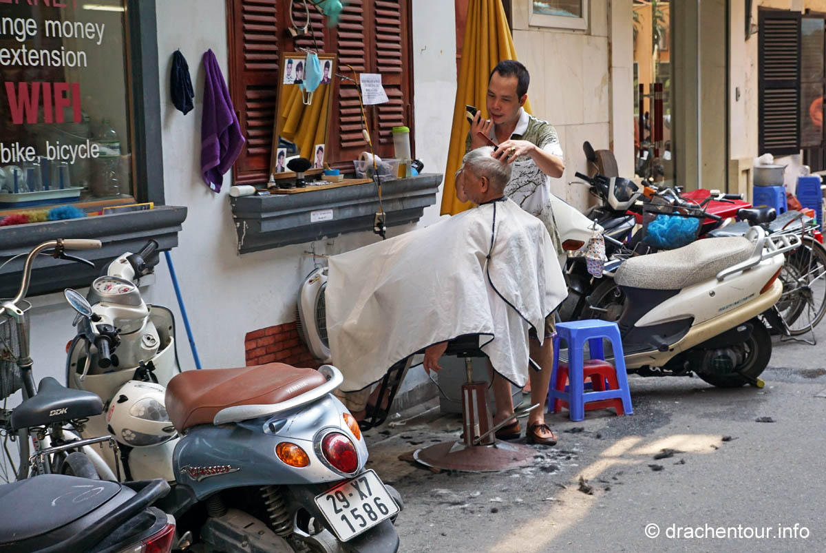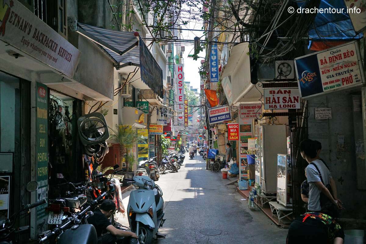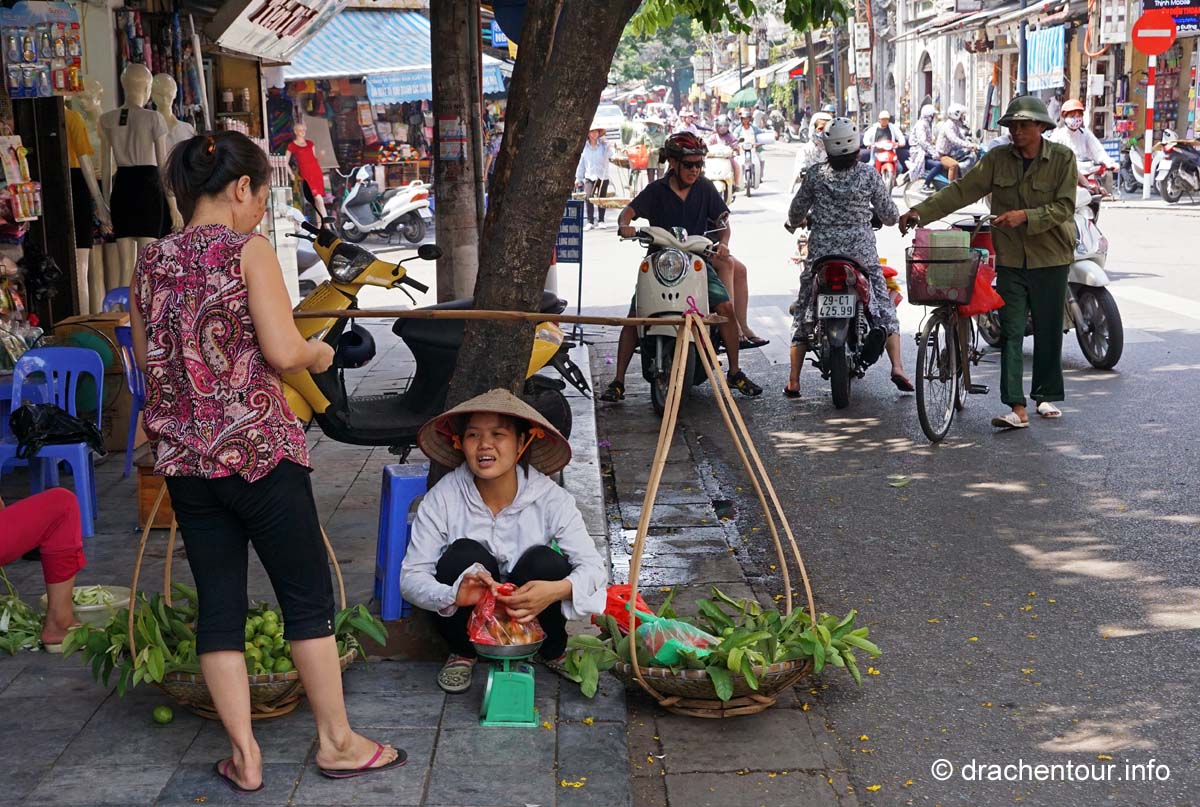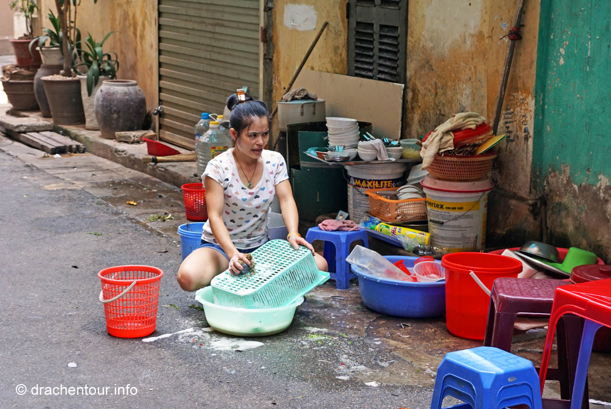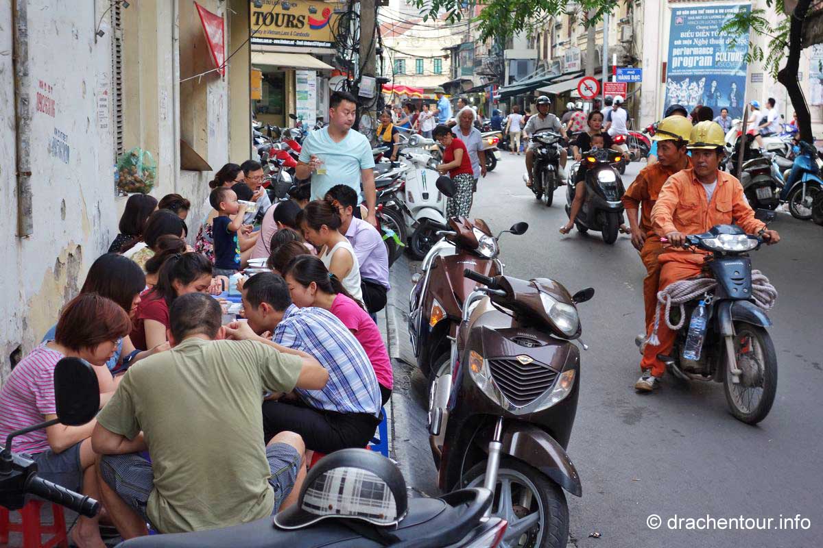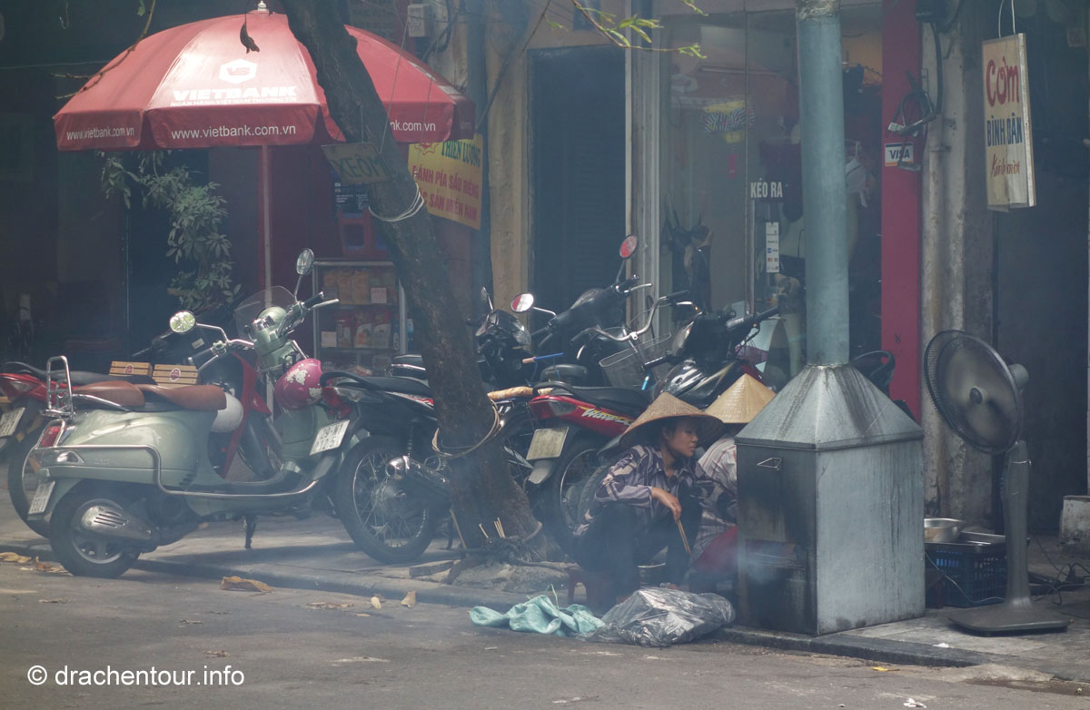 Am Nachmittag bummelten wir nochmals gemütlich durch die Altstadt und entdeckten hinter fast jeder Straßenecke wieder eine neue spannende Szene. Es kam uns so vor, als ob wir einen Dokumentation auf dem Fernsehkanal „ National Geographic “ mit dem Motto " exotische Straßenszenen in Hanoi " schauen würden - es war toll. So tauchten wir für einige Stunden wieder in das faszinierende Straßenleben der Stadt ein und beobachteten das Treiben und die Menschen. Abends zog ein Gewitter über uns und wir schafften es gerade noch halbwegs trockenen Fußes in ein Restaurant zu kommen, um wieder unsere vietnamesische Lieblingsspeise zu futtern. Der sehr heftige Regen setzte der fast unerträglichen Hitze - selbst abends um 20:00 Uhr - erstmal ein Ende und wir erfreuten uns der klaren und ganz leicht erfrischenden Luft. Beschwingt hüpften wir dann durch die vielen Wasserpfützen zu unserem Hotel zurück.